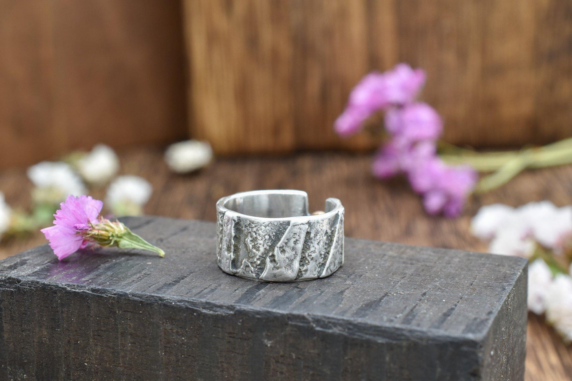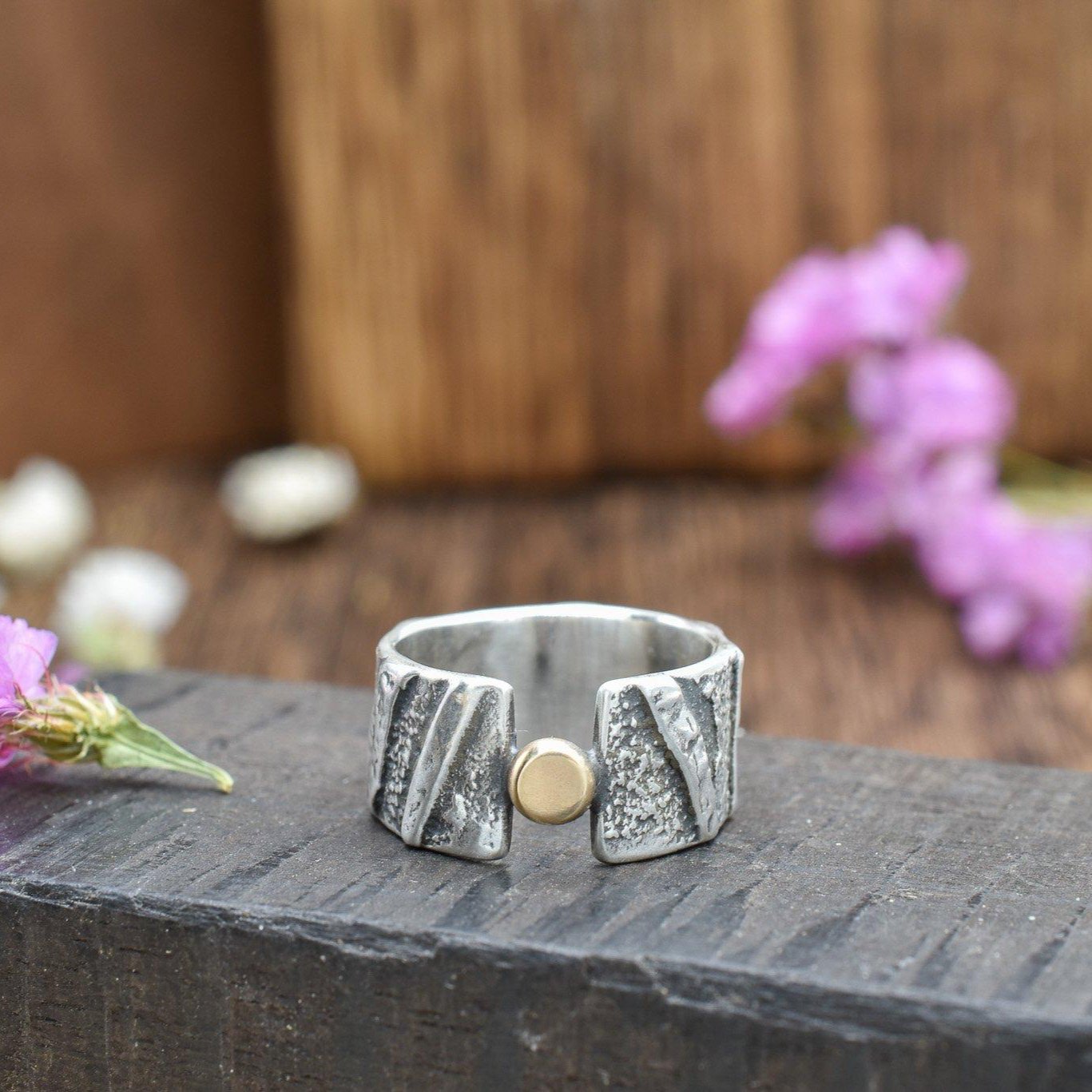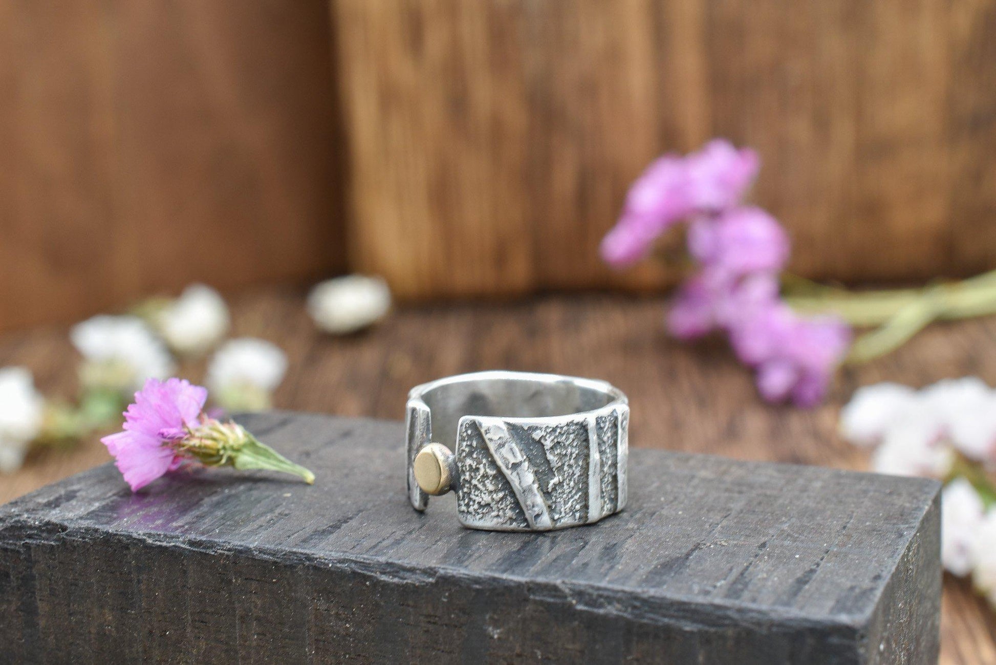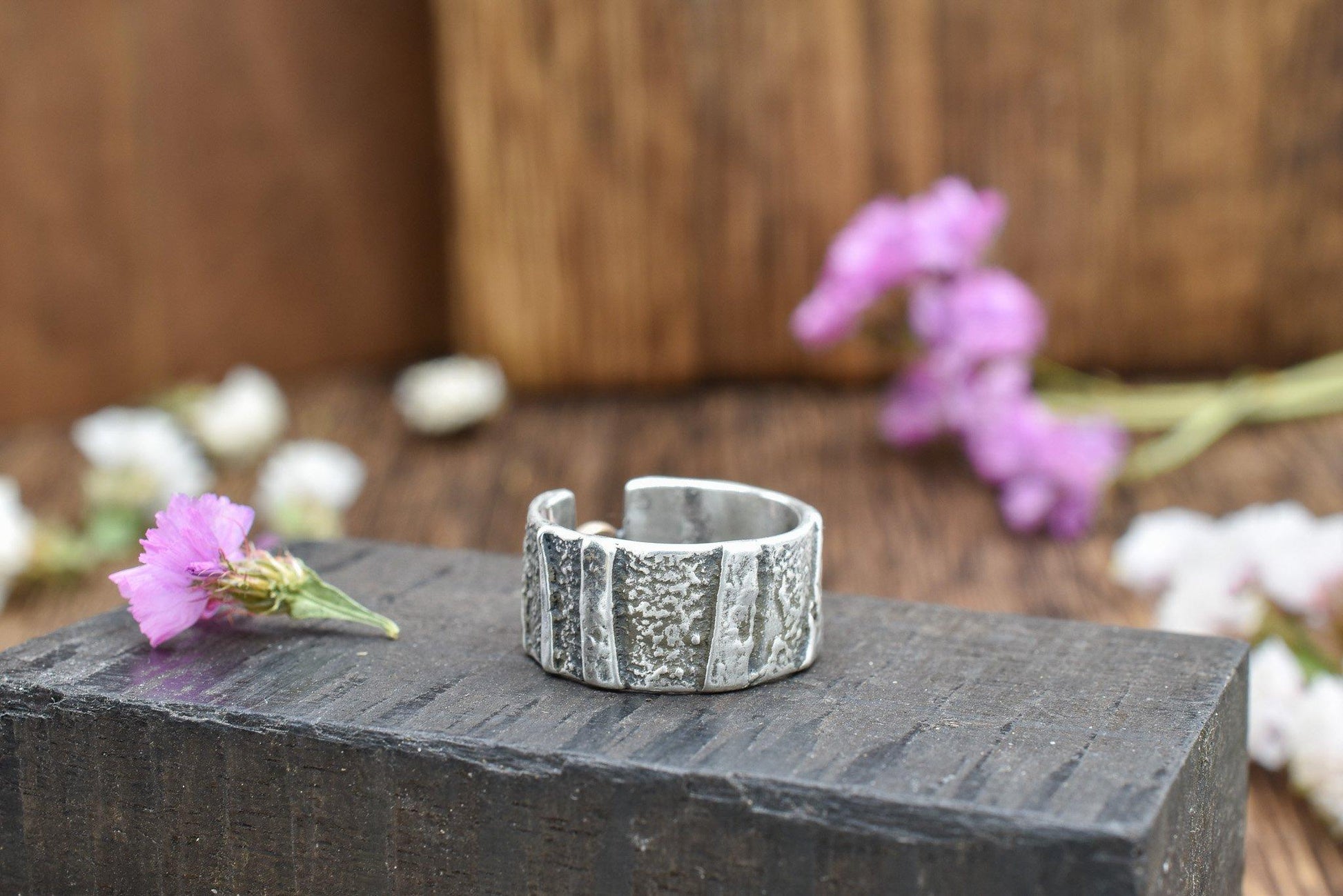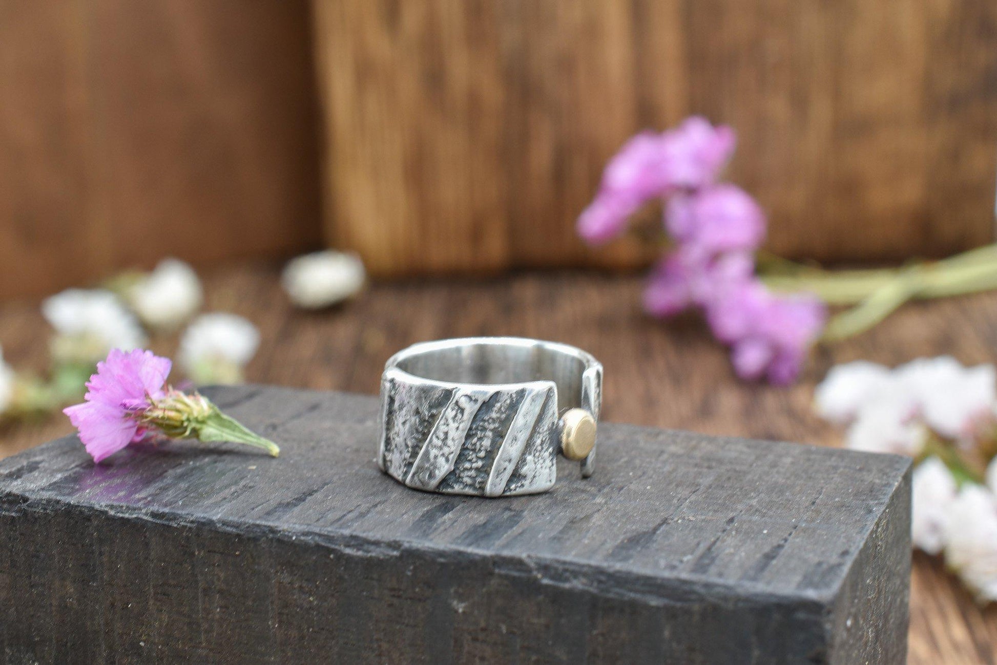 Wide band has organic melted texture with shapes fused into the surface. A hammered 14k gold ball is centered in the “canyon”. Sterling silver and 14k yellow gold with a satin finish.
