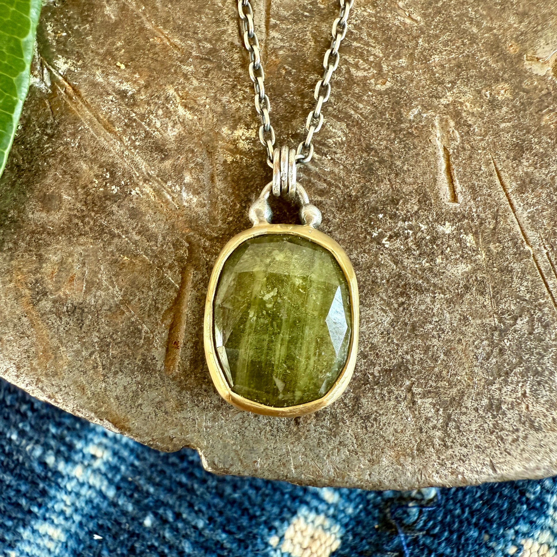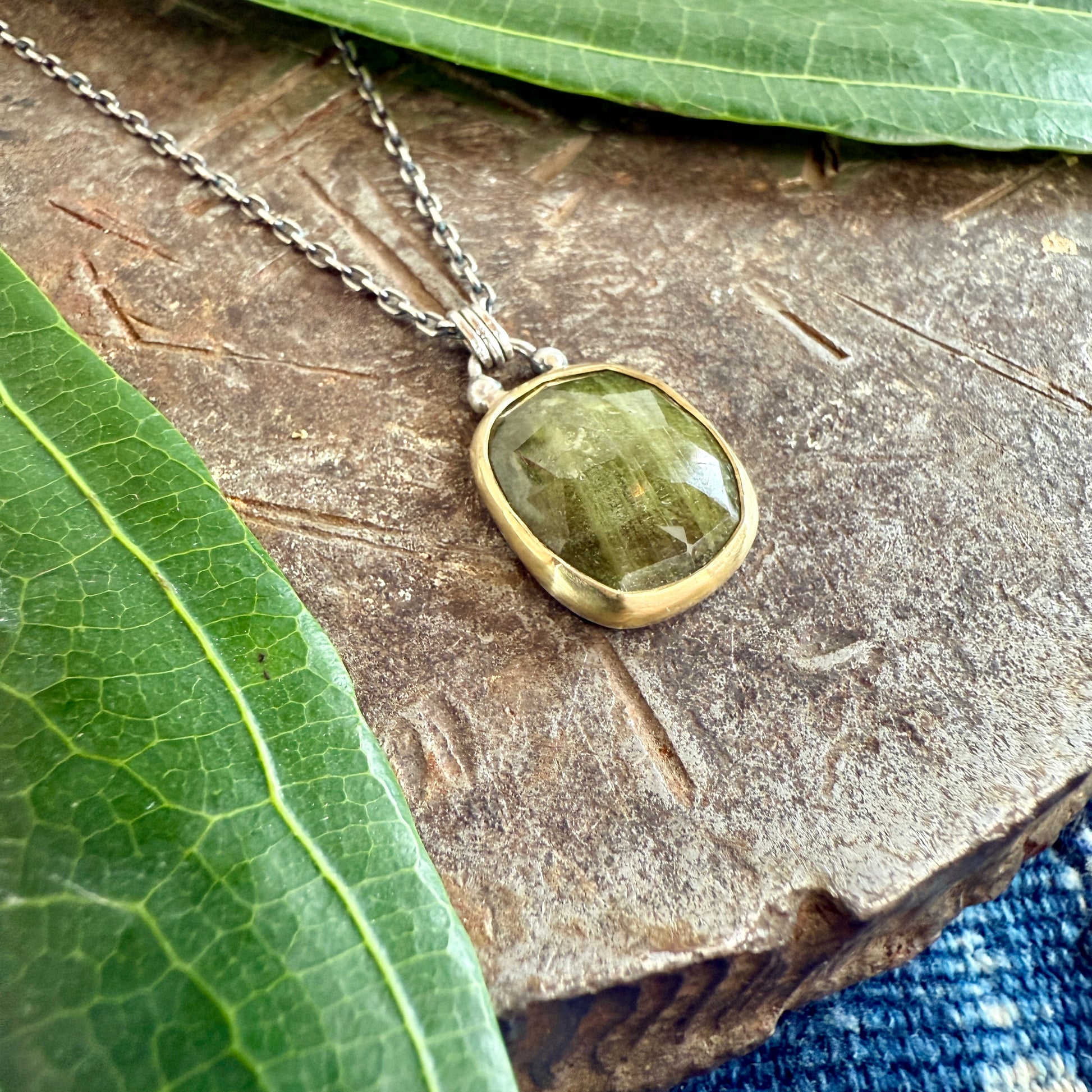 Rose cut green sapphire wrapped in 18k yellow gold bezel. Backplate and chain are sterling silver. Chain has been oxidized and shined. “18k” stamped on back of pendant.