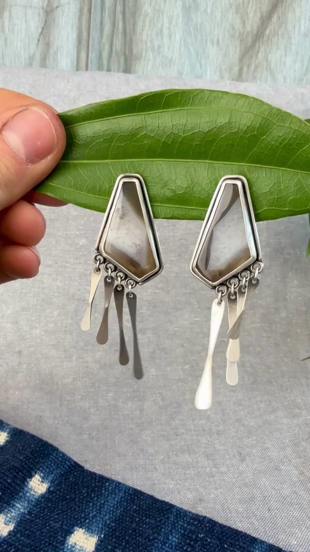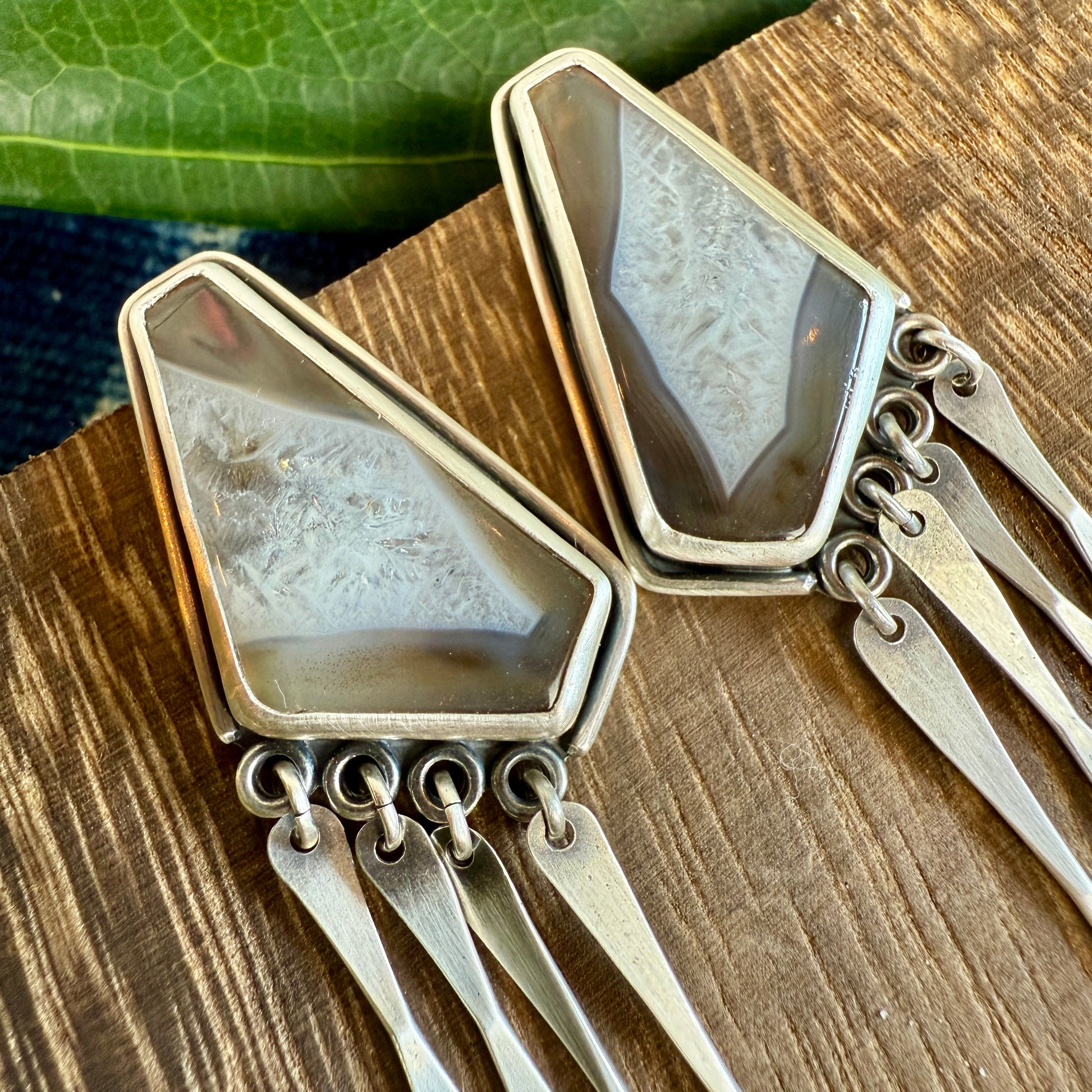 Translucent agate with visible crystals. This open-backed window setting allows light to pass through the stone. Hand-hammered fringe pieces which create a lot of movement. True statement earrings! Maybe with a little bit of southwest flair?