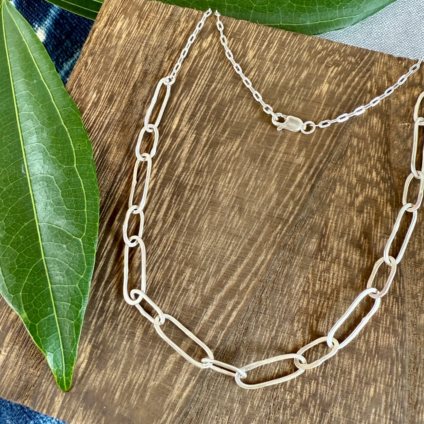 The front half of this chain is made up of different sized handmade chain links light hammering. Silver chain on remainder with lobster clasp.