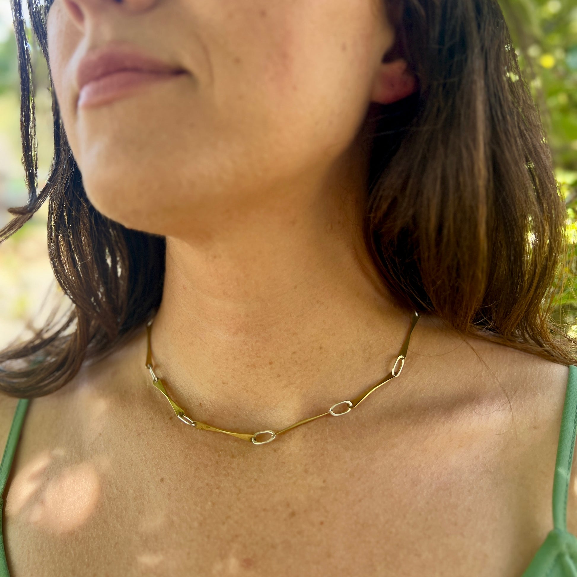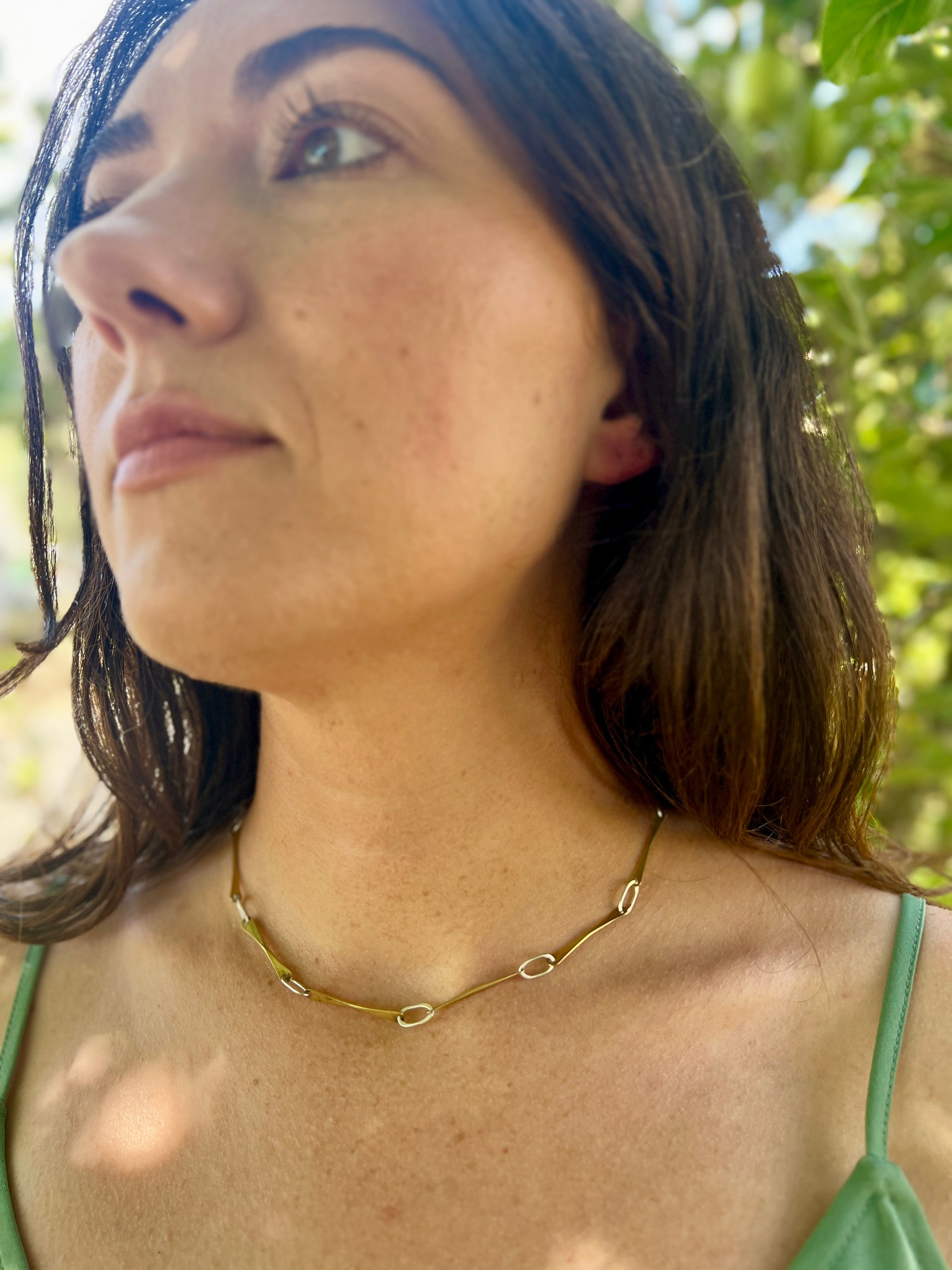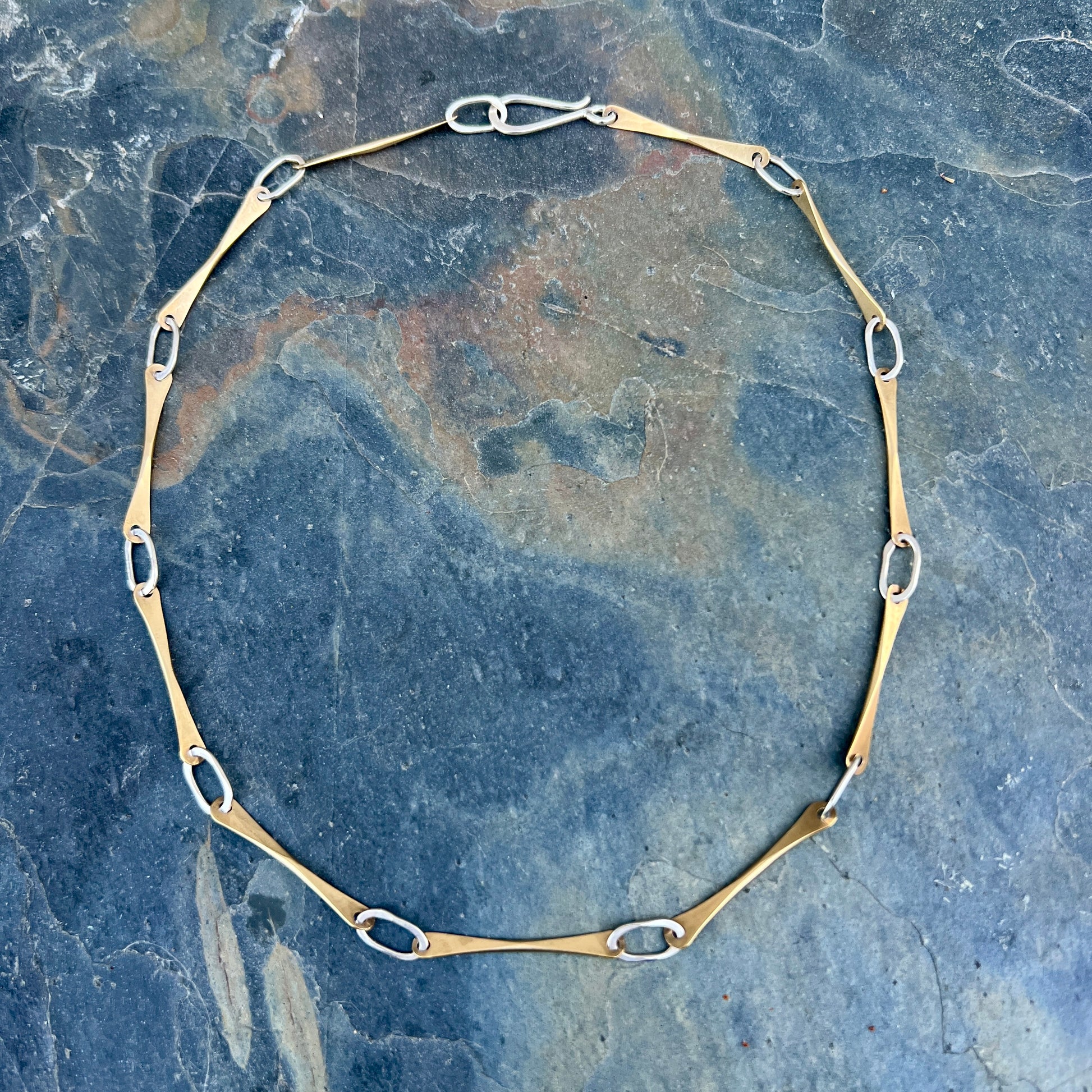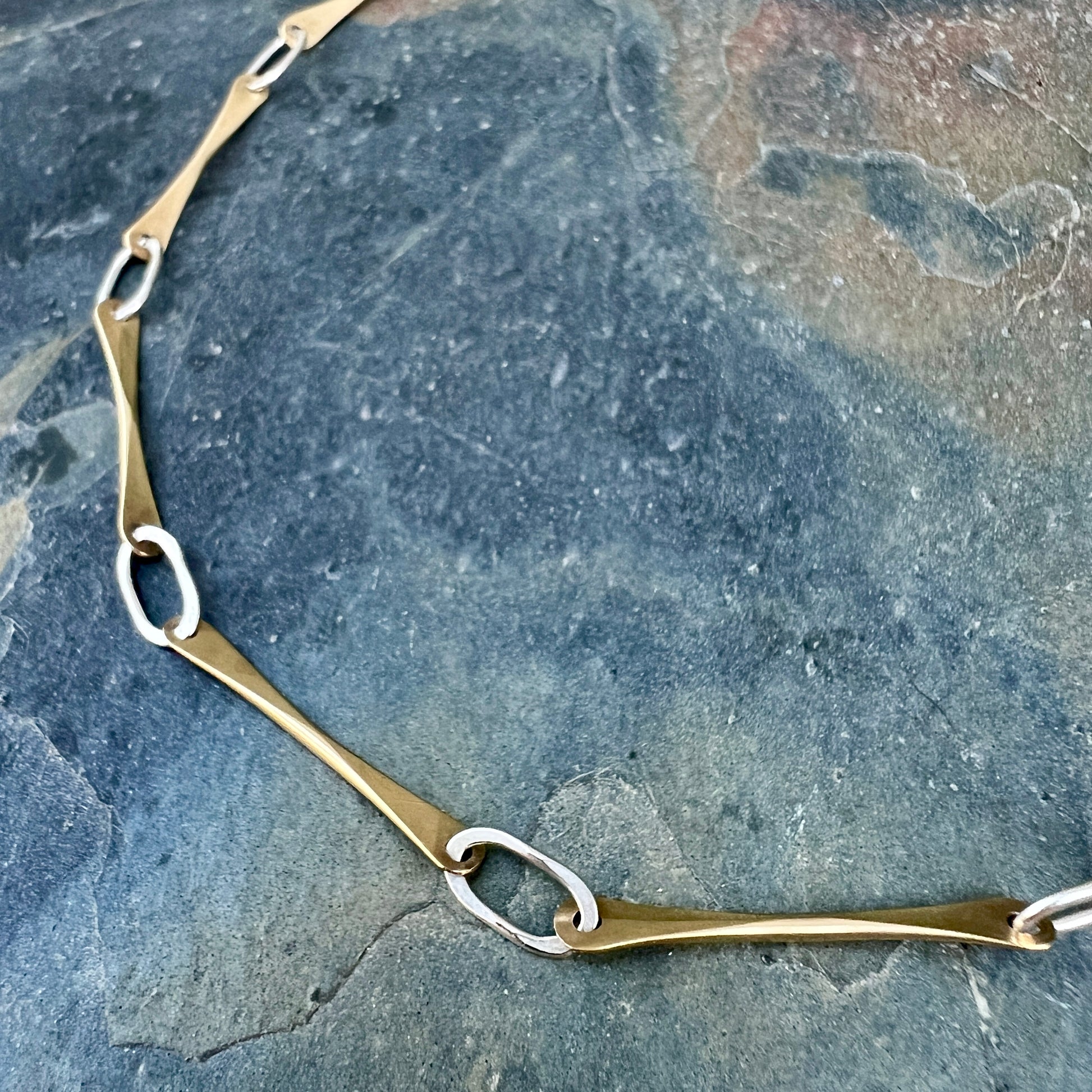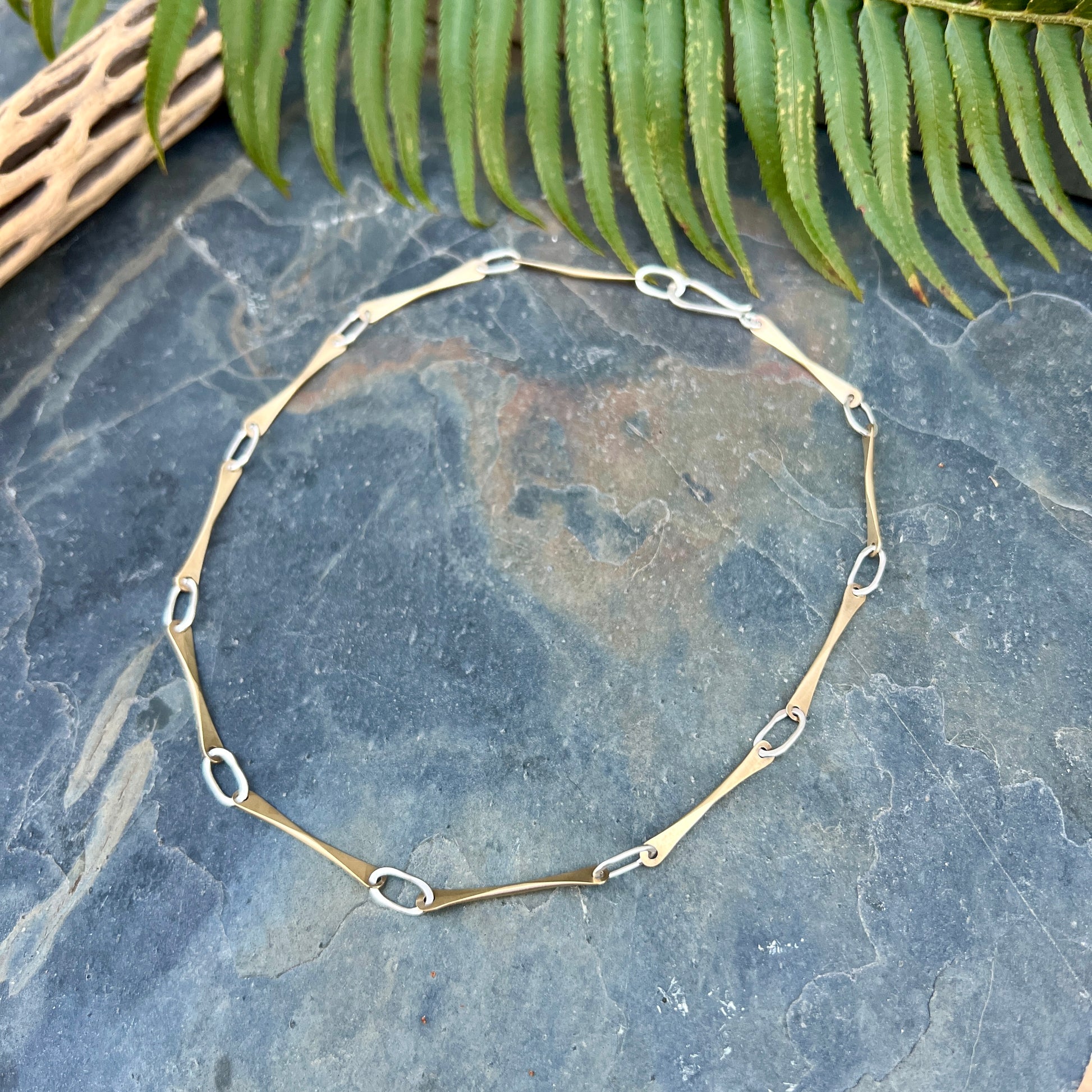 This unique necklace design is made up of handmade chains links, hammered wire, and a hook clasp. Each chain link is hammered. This necklace is a labor of love!