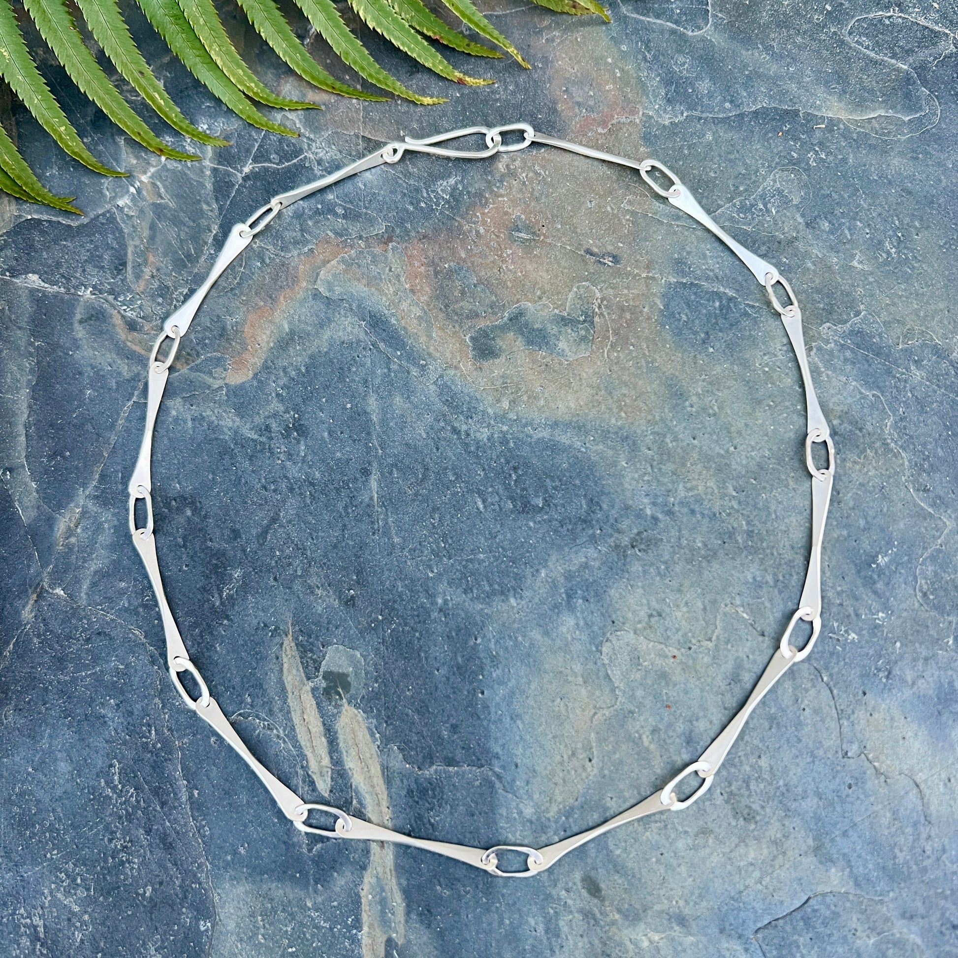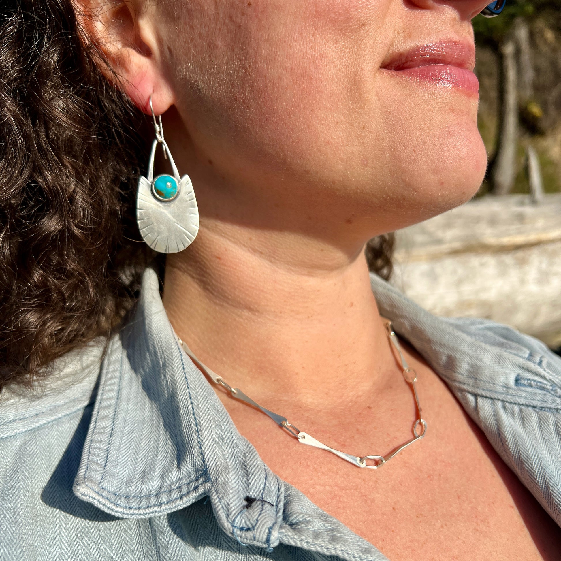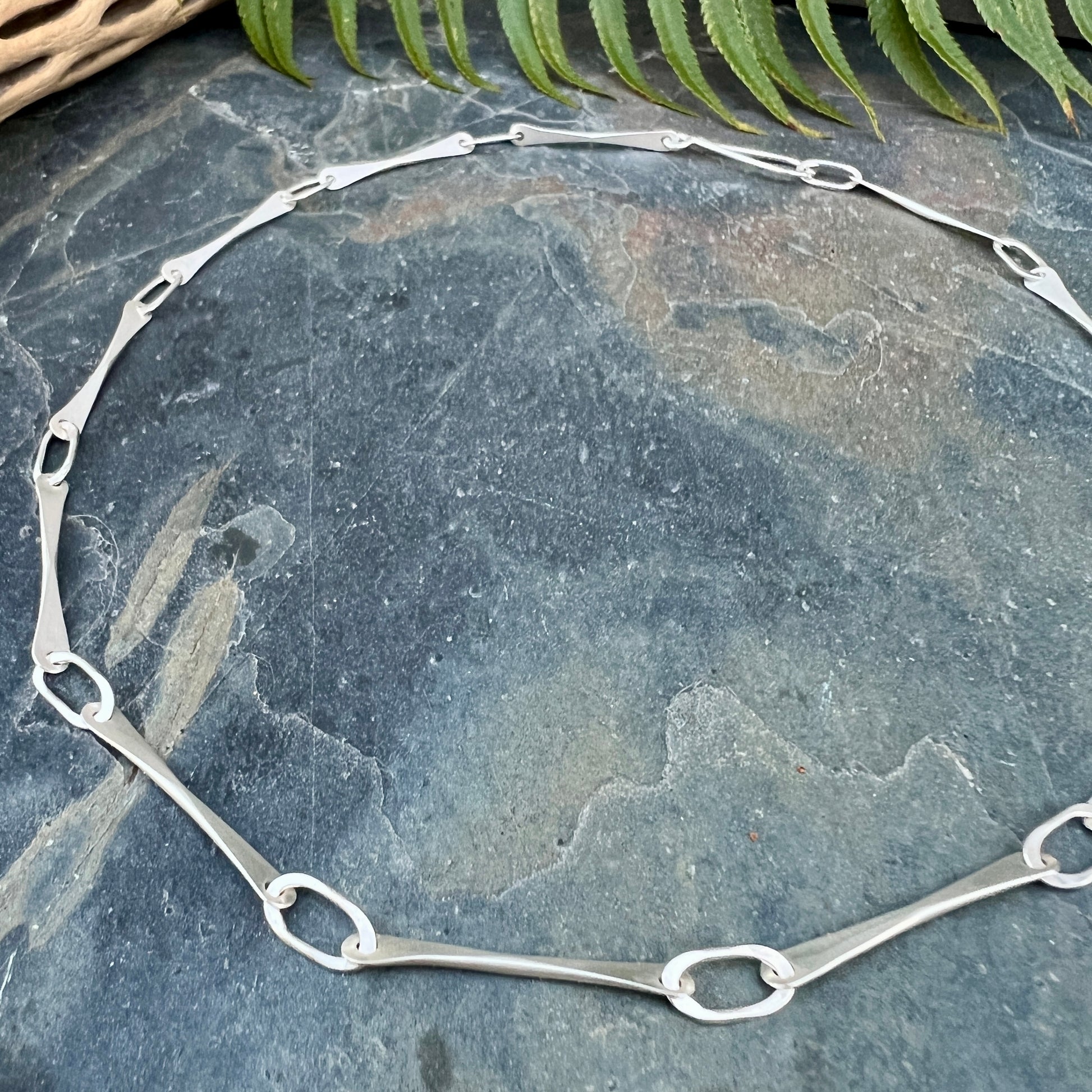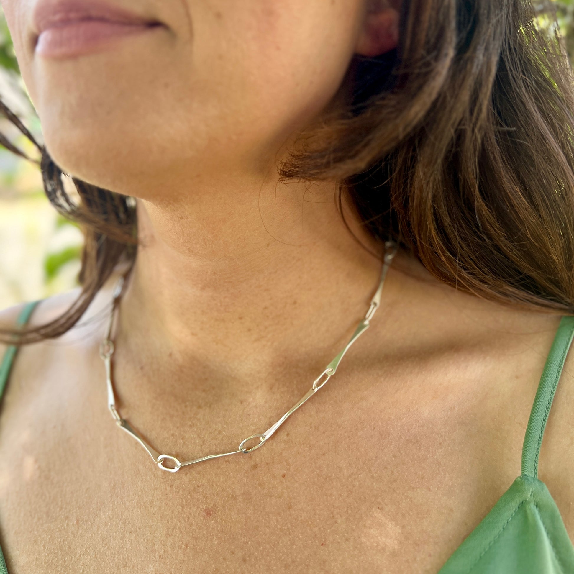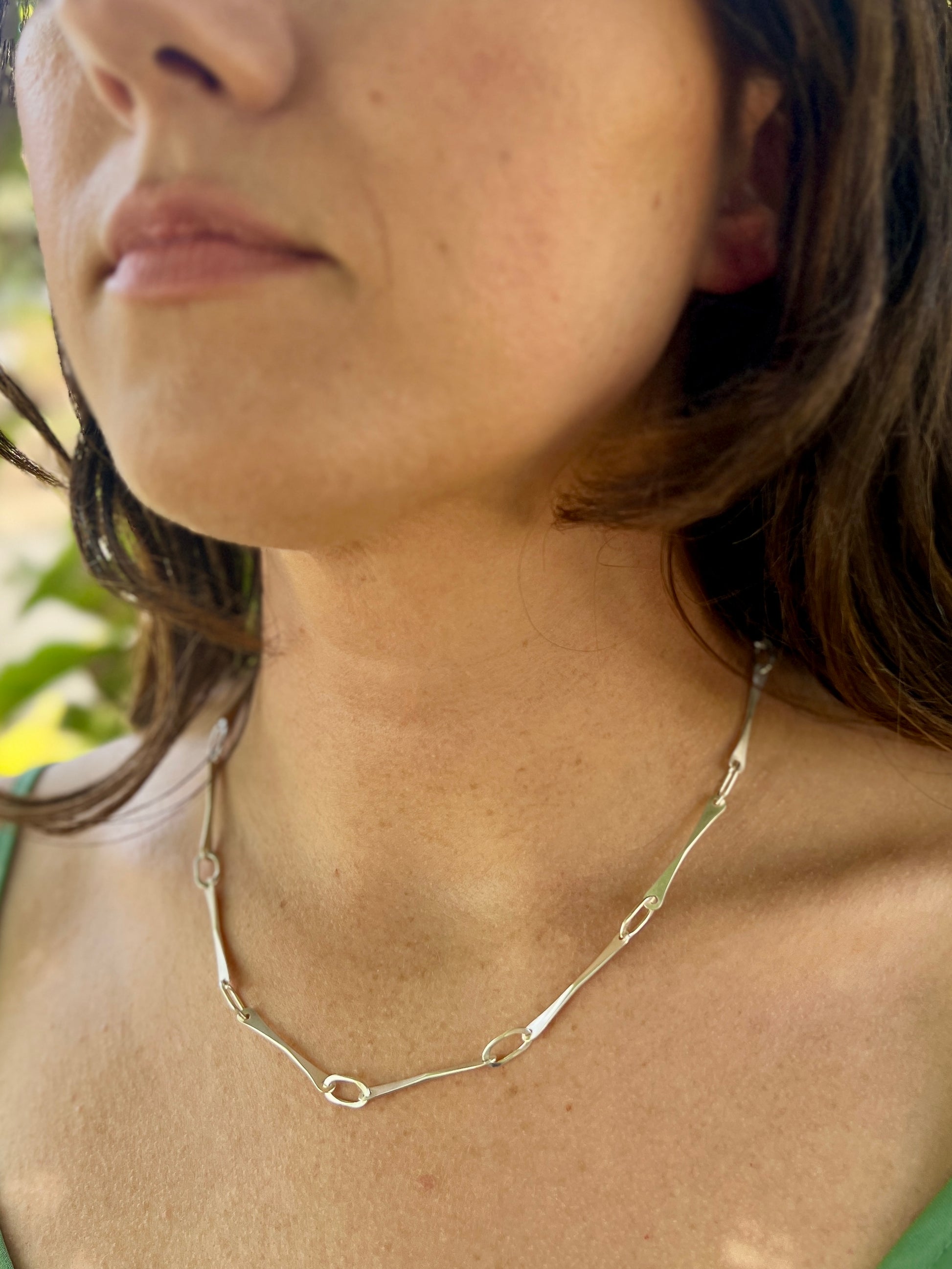 This unique necklace design is made up of handmade chains links, hammered wire, and a hook clasp. Each chain link is hammered. This necklace is a labor of love!