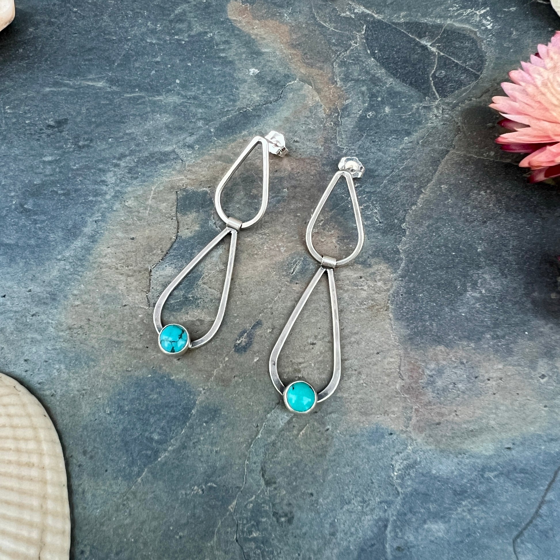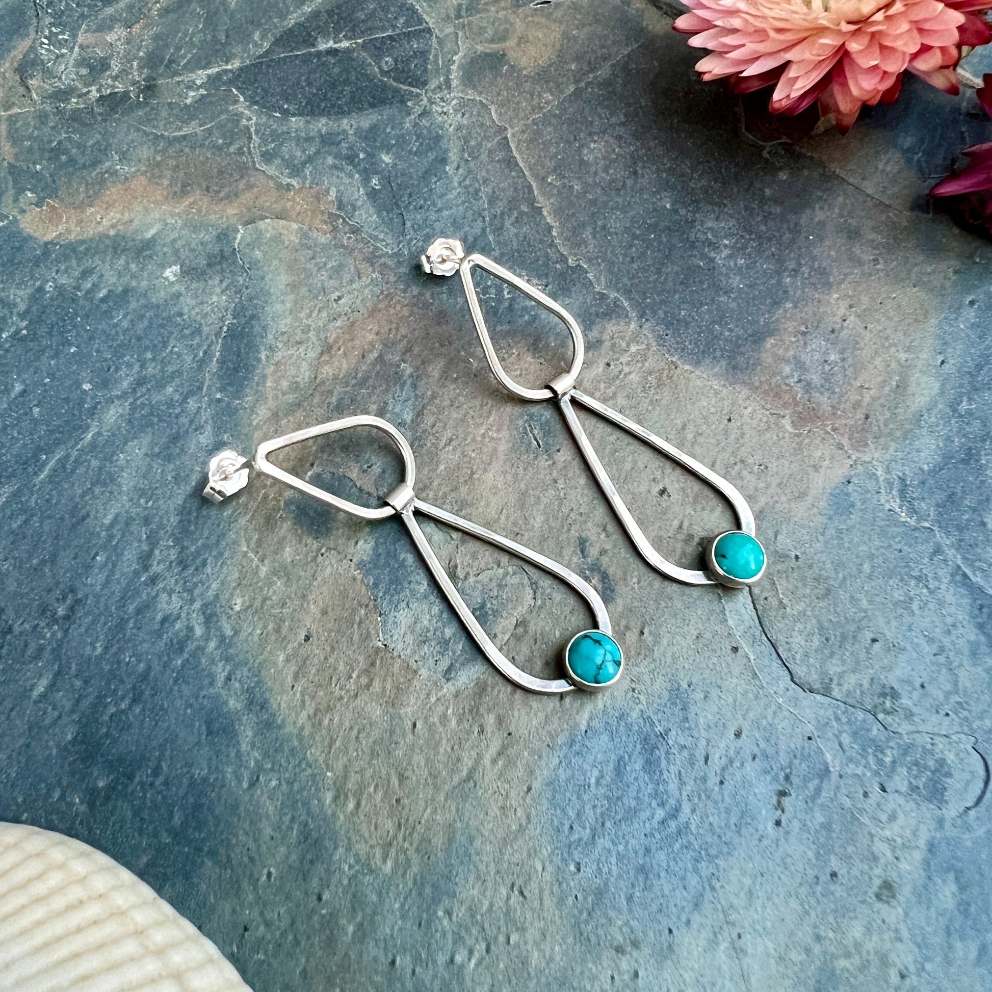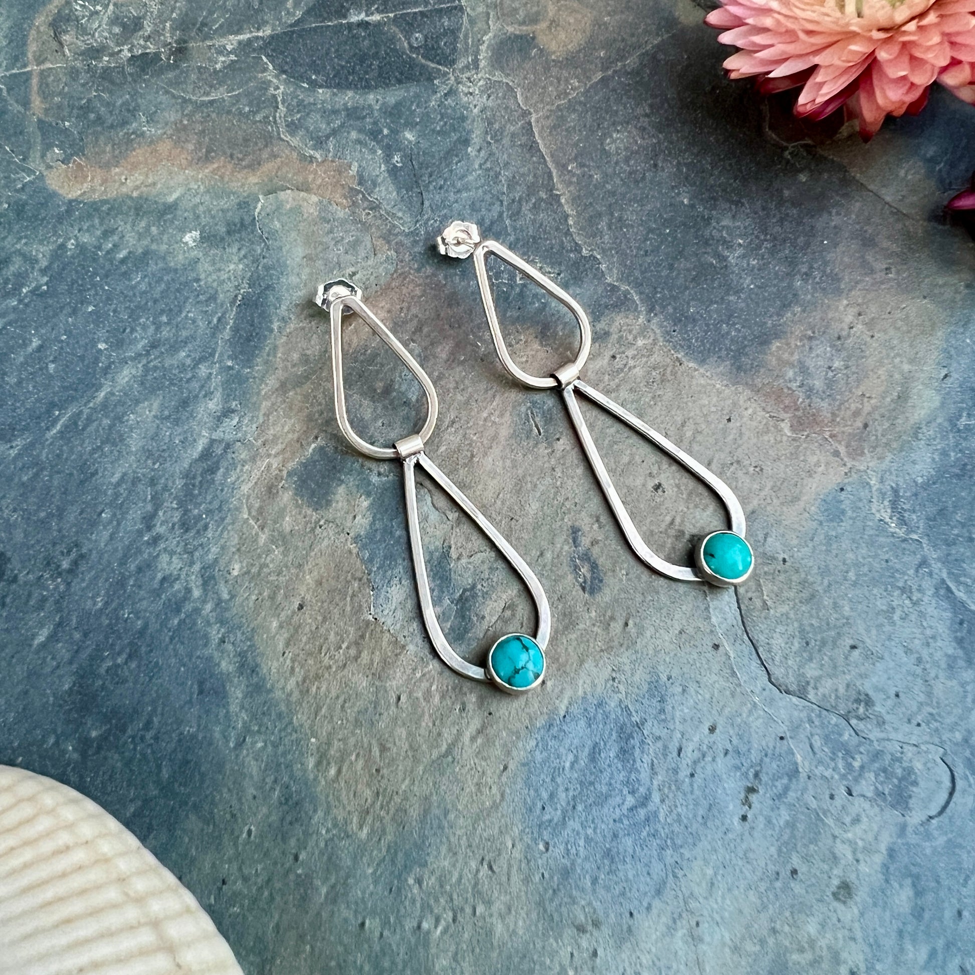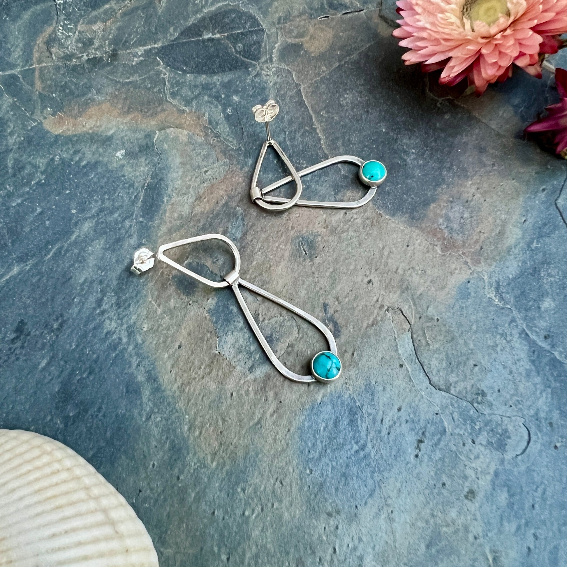 The post earrings have a freely swinging hinge between the two droplet shapes. Lightly hammered.