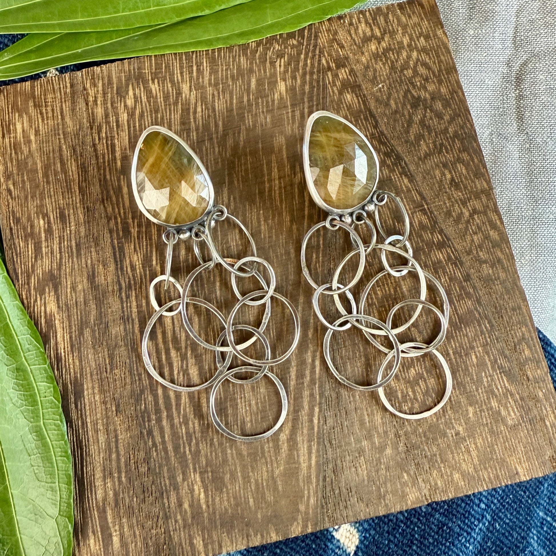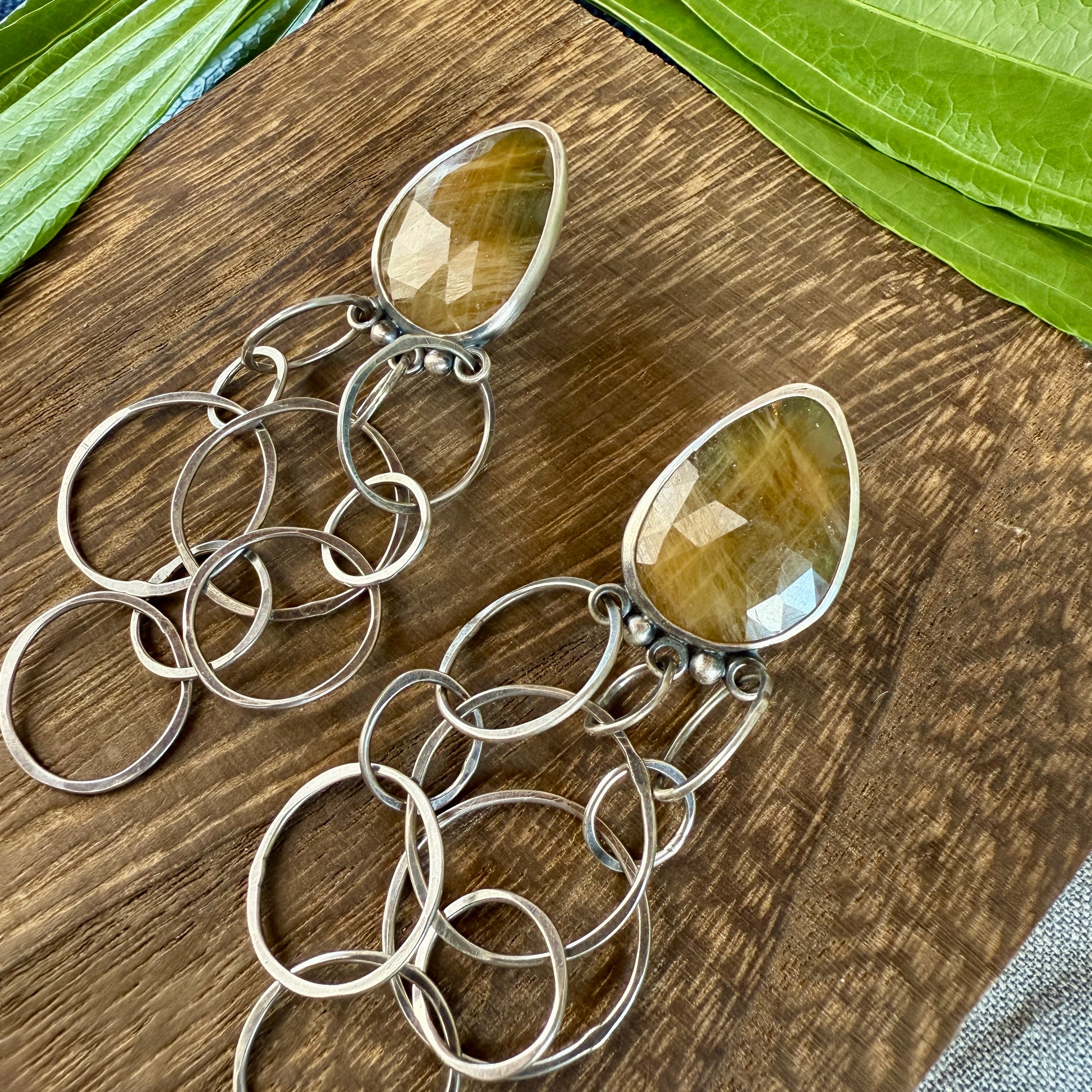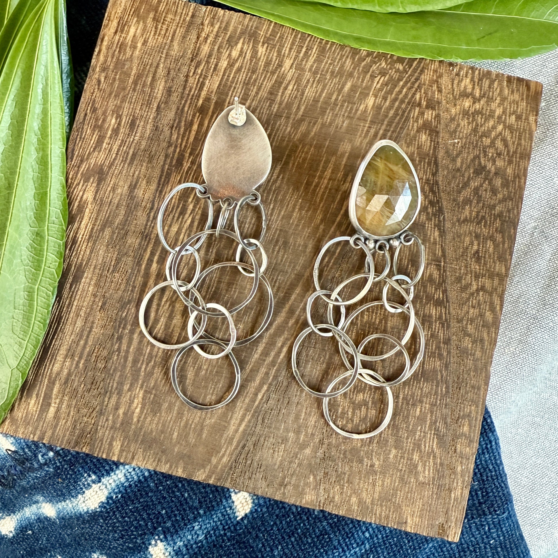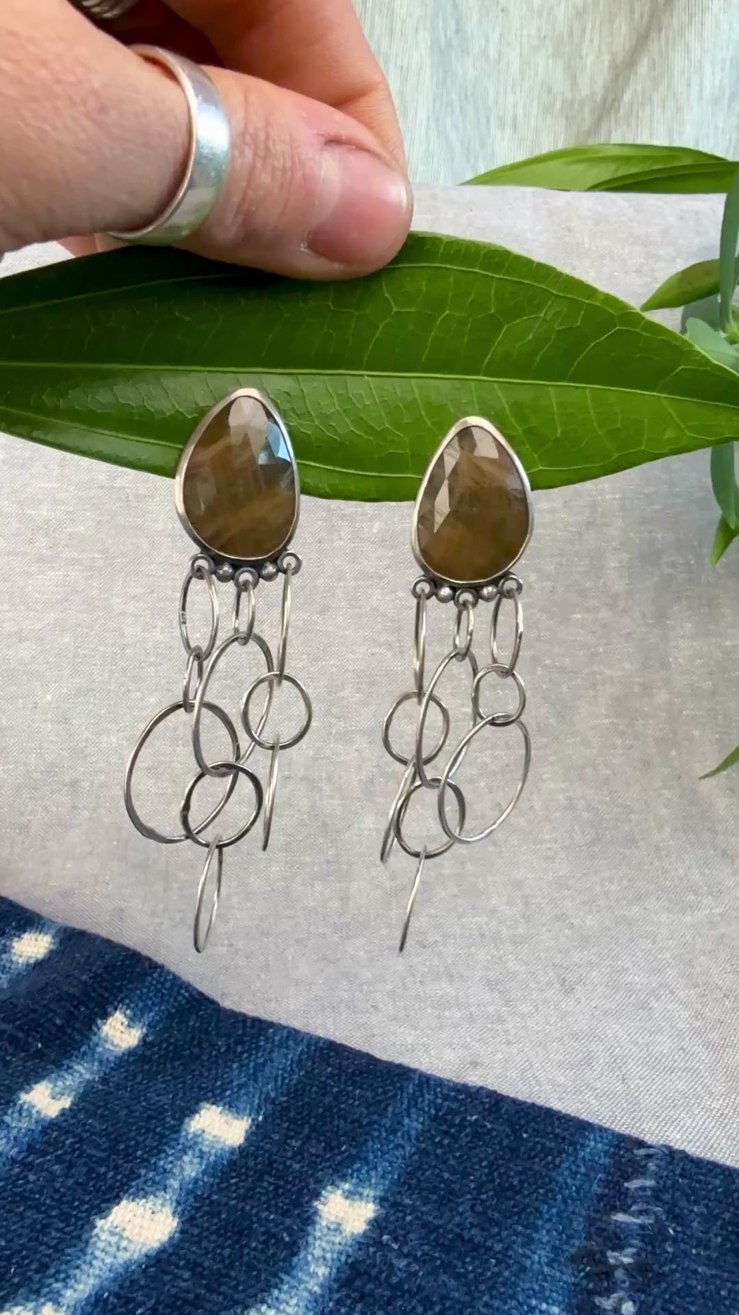 These faceted sapphire earrings feature layered chain links in varying sizes hanging from the stone. Hammered details leave a soft organic feel. (These earrings are a bit heavier than some of the other designs. They have a bigger stone and thicker chain than the peach moonstone ones. Because the weight is at the top they don’t feel overly heavy but are not recommended for sensitive ears )
