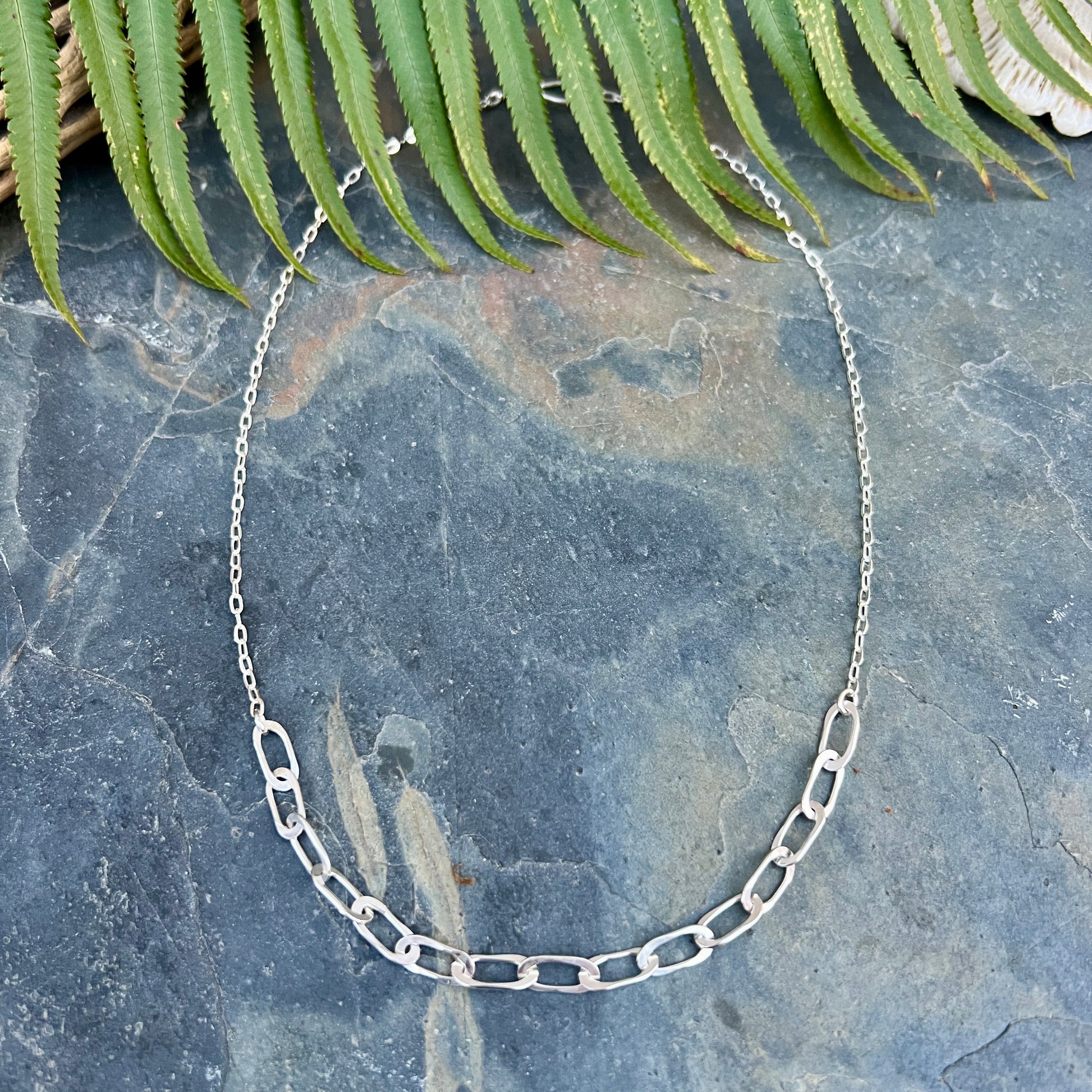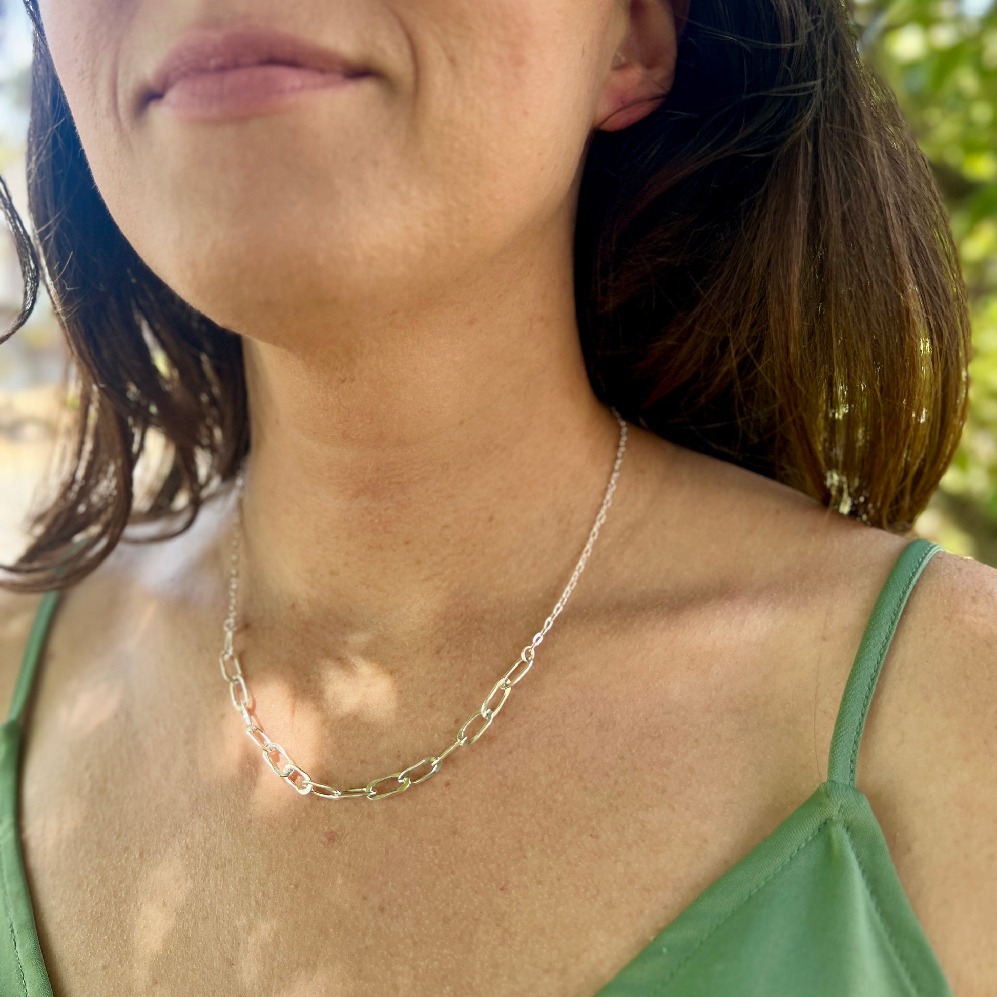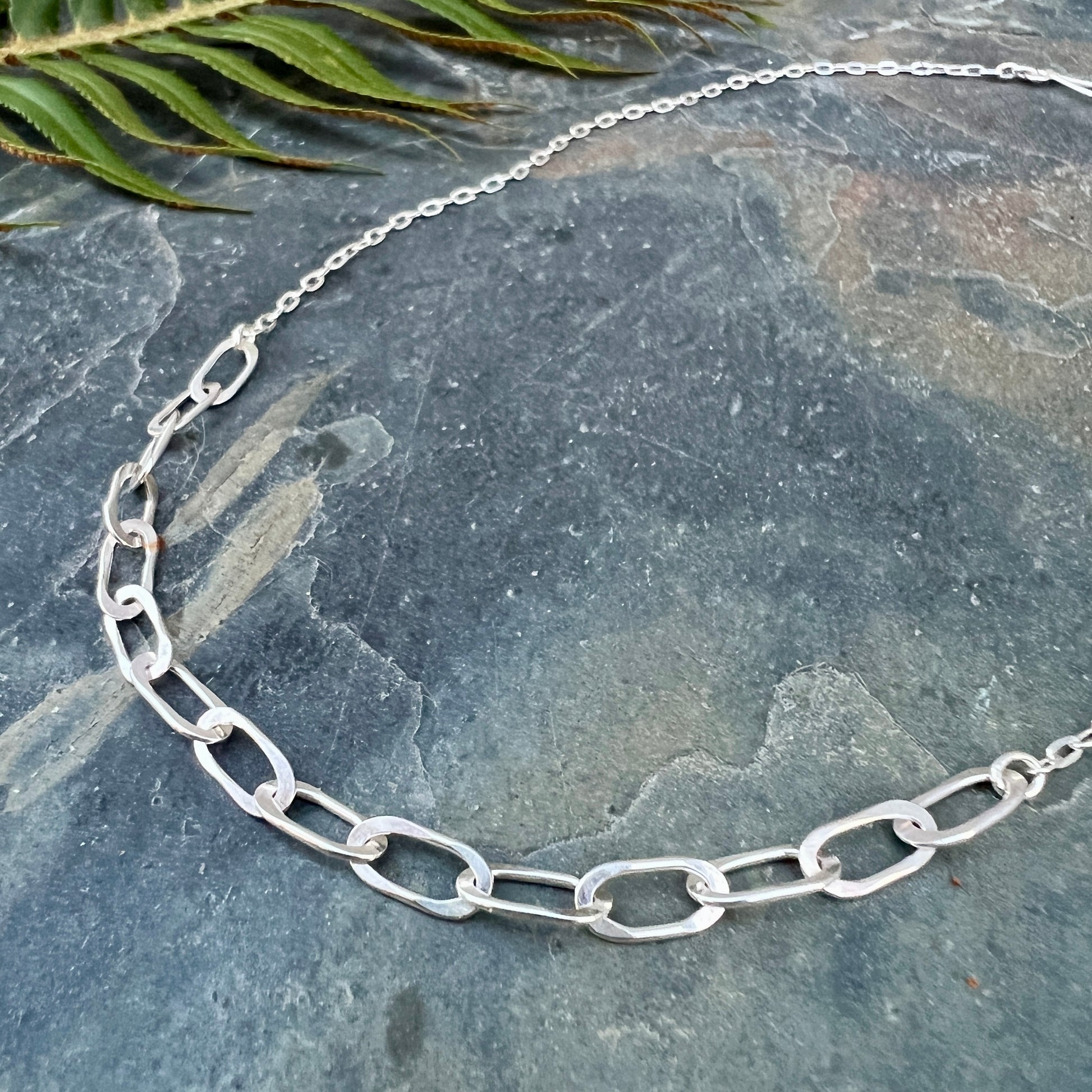 This necklace has a section of handmade chain in the front and smaller chain for the remainder. Each link is carefully handcrafted and hammered to give it an organic dimension. Handmade hook clasp.
