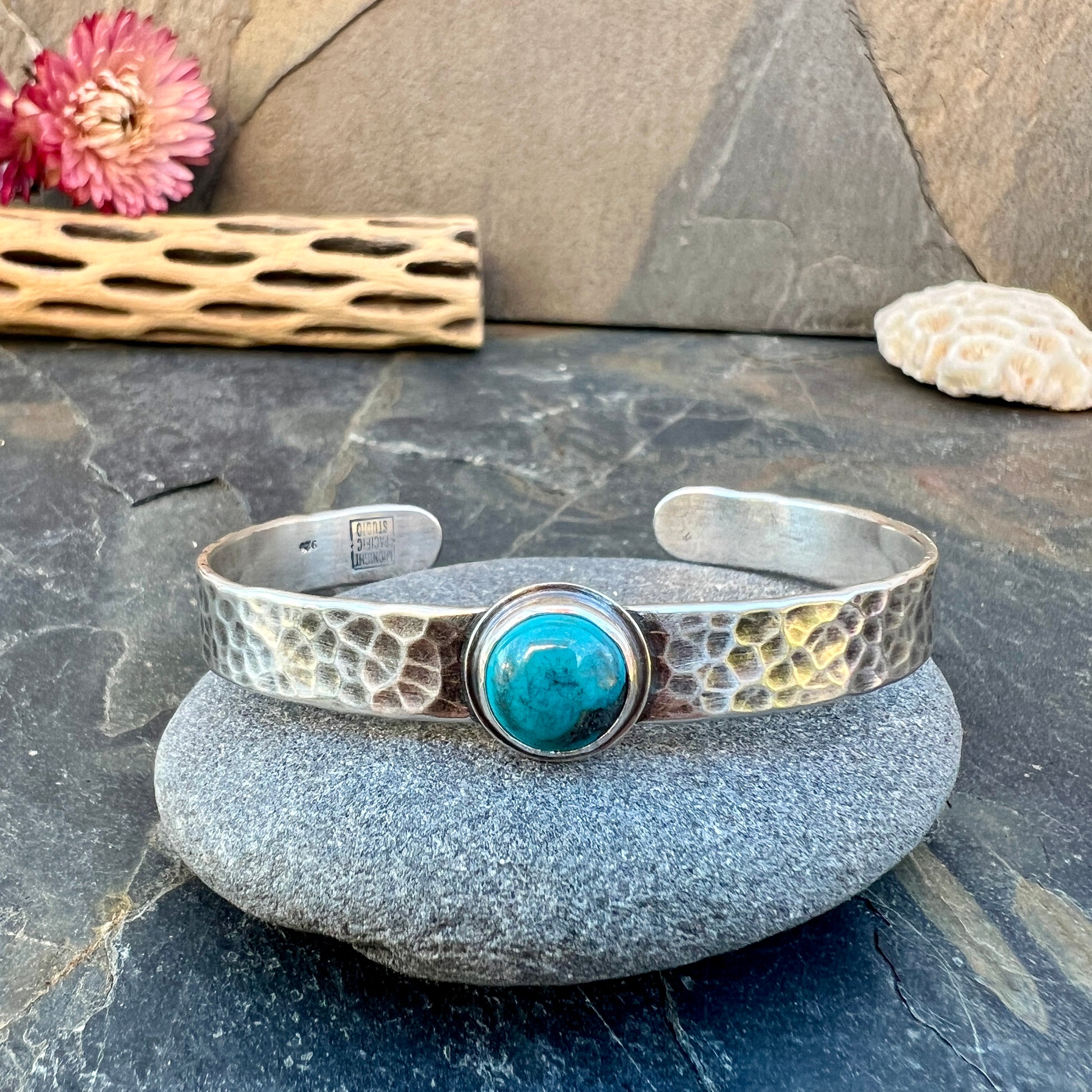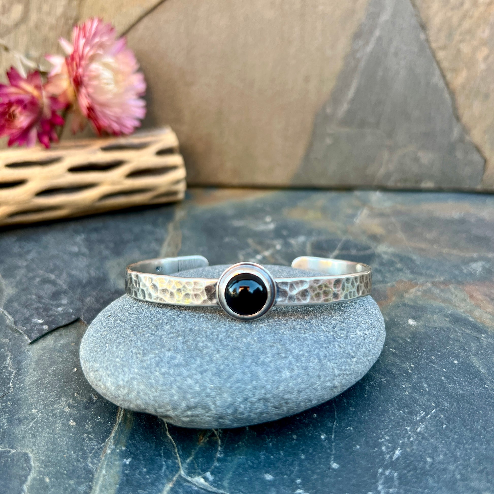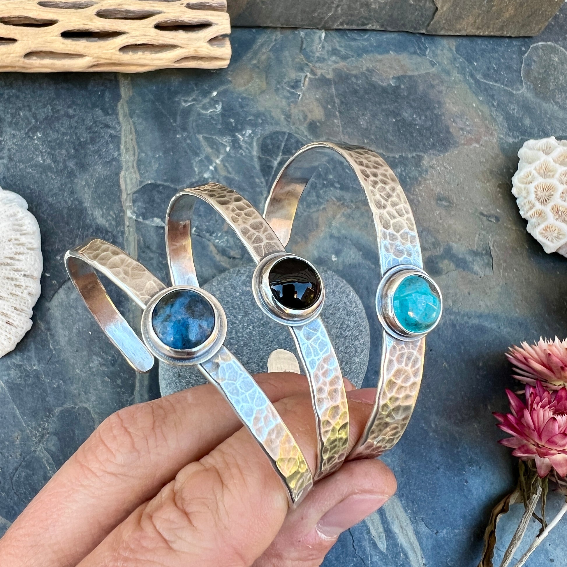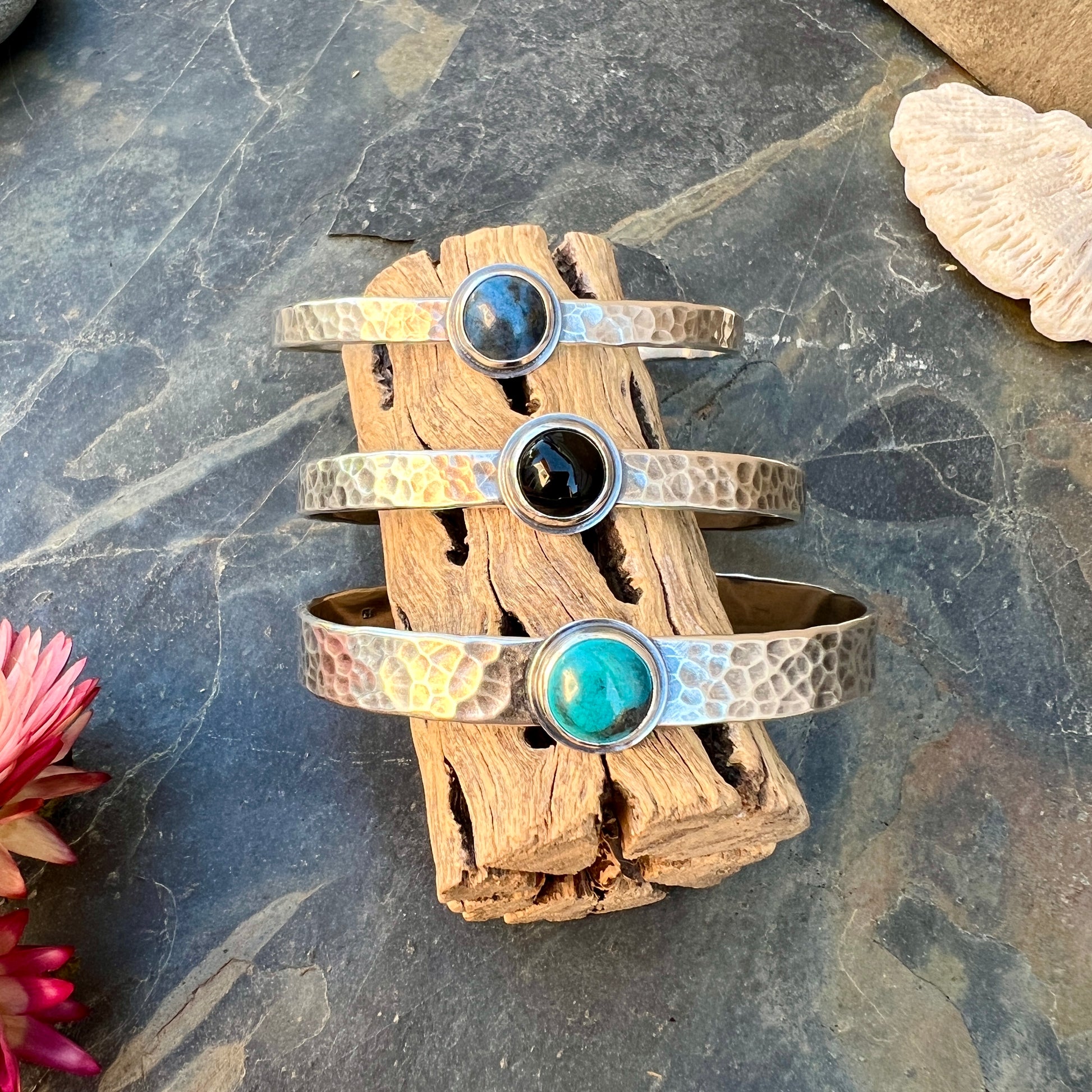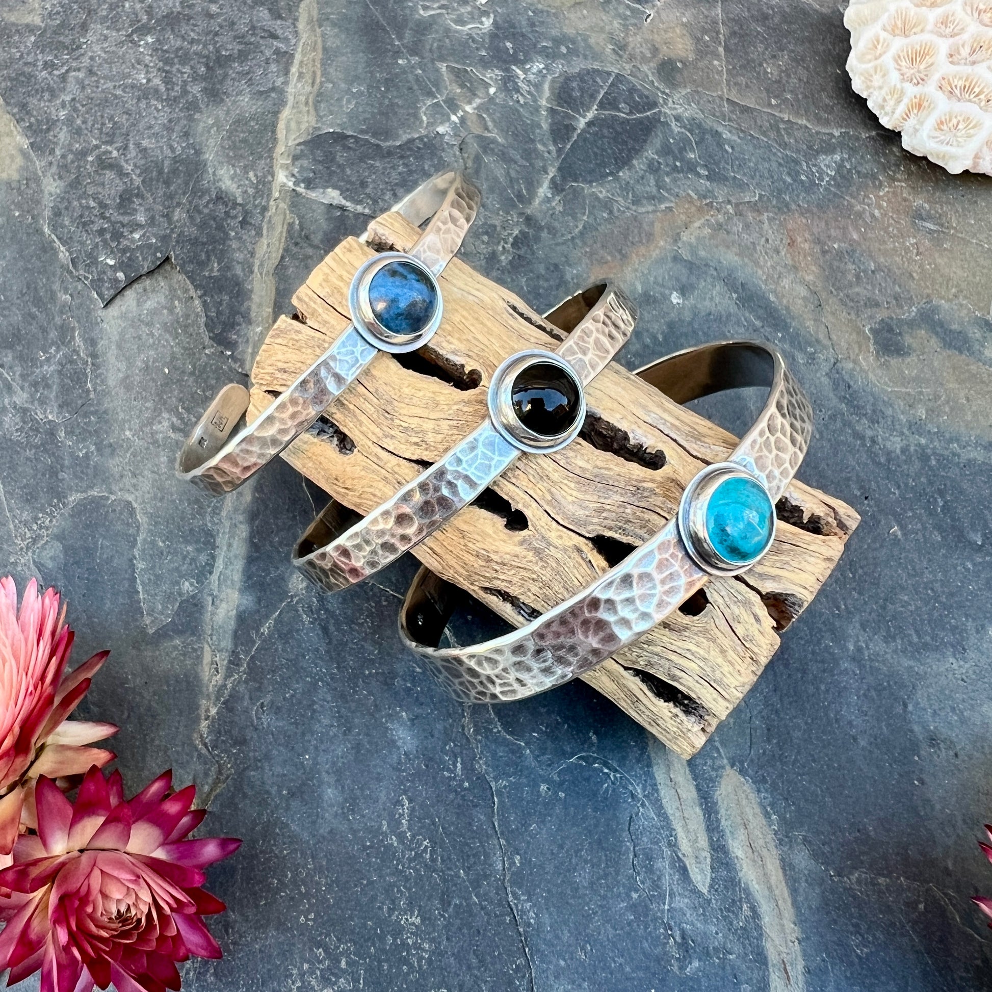 Heavy hammered silver cuff with your choice of stone. A classic bracelet which can be worn on its own or as part of a stack.
