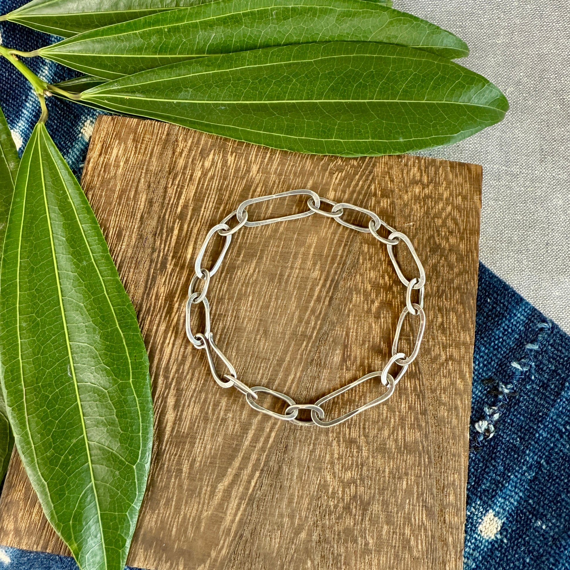 Handmade and hammered chain bracelet with hook closure. Links are varying sizes.