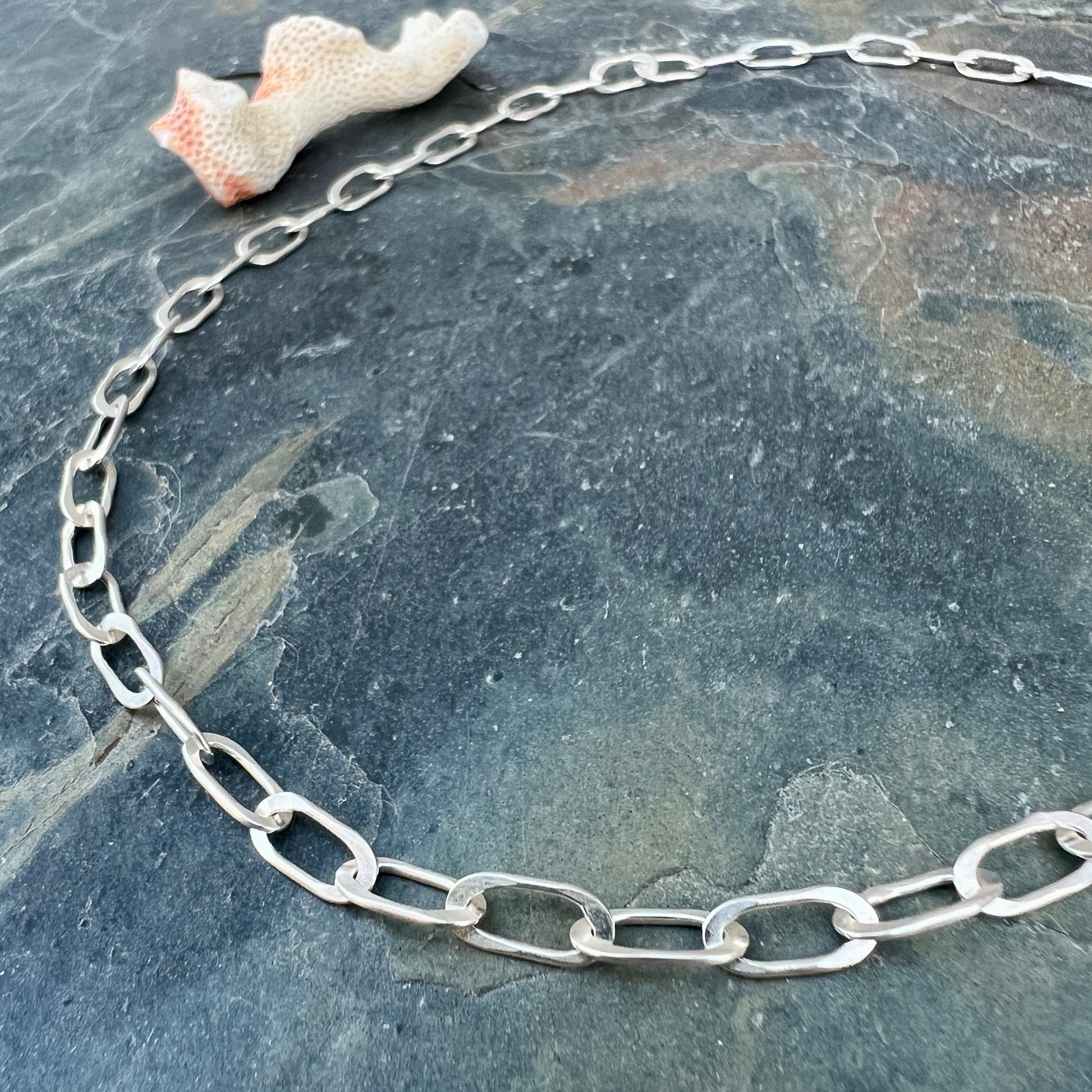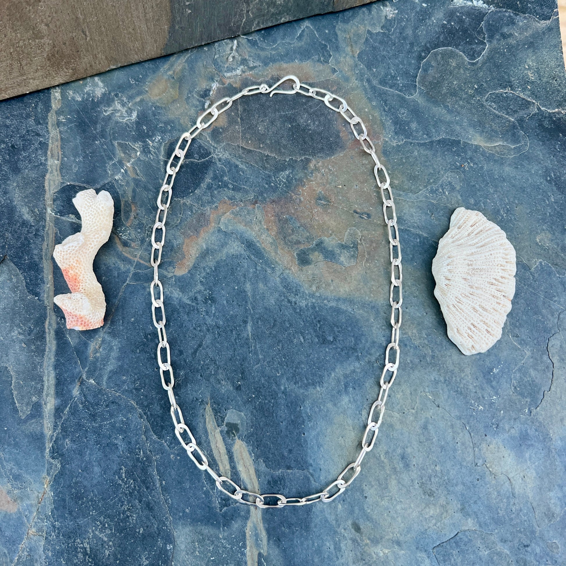 This is a fully handmade chain necklace. Each link is carefully handcrafted and hammered to give it an organic dimension. Handmade hook clasp. This necklace is truly a labor of love!
