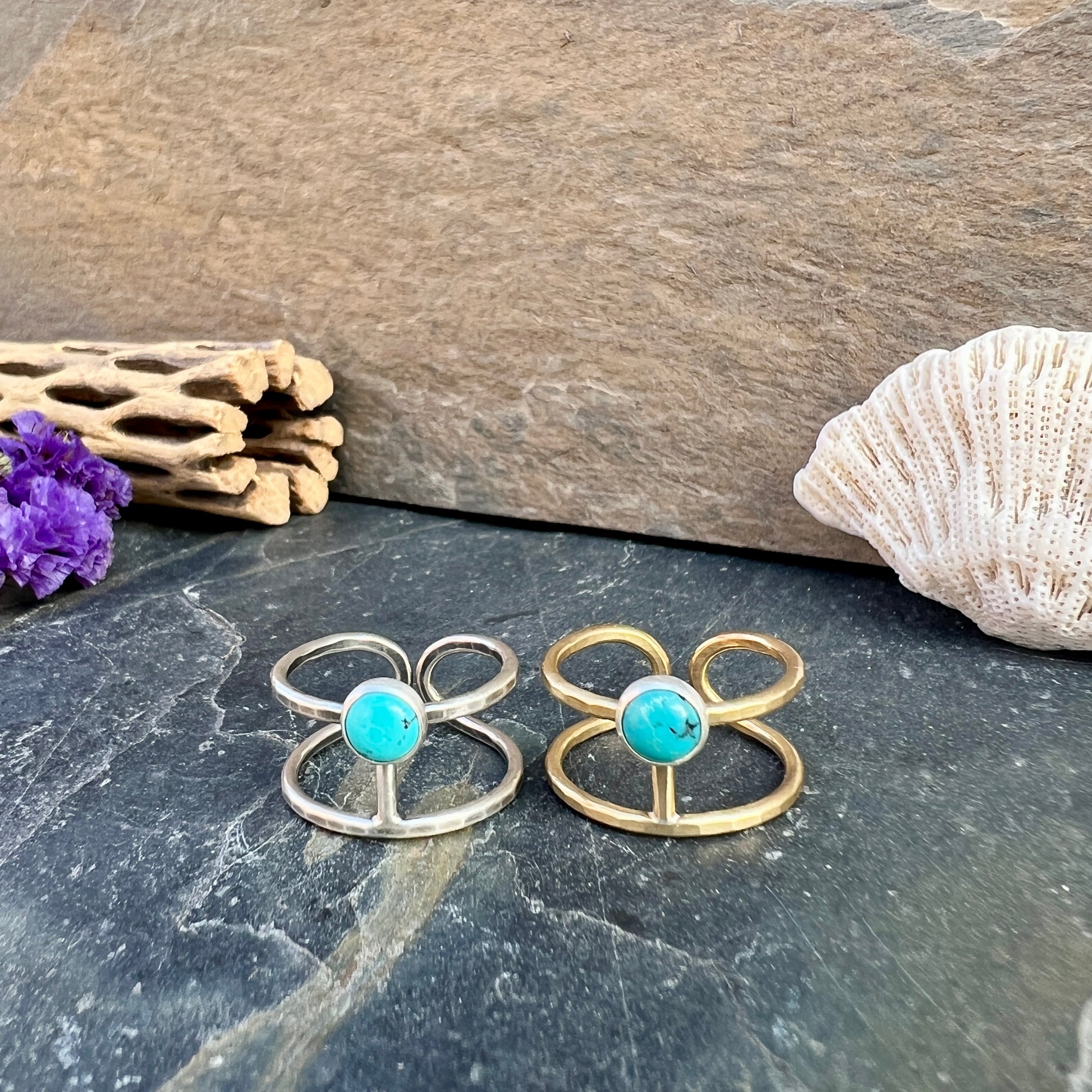 Brass or Sterling silver. Both options have silver setting for the stone.
