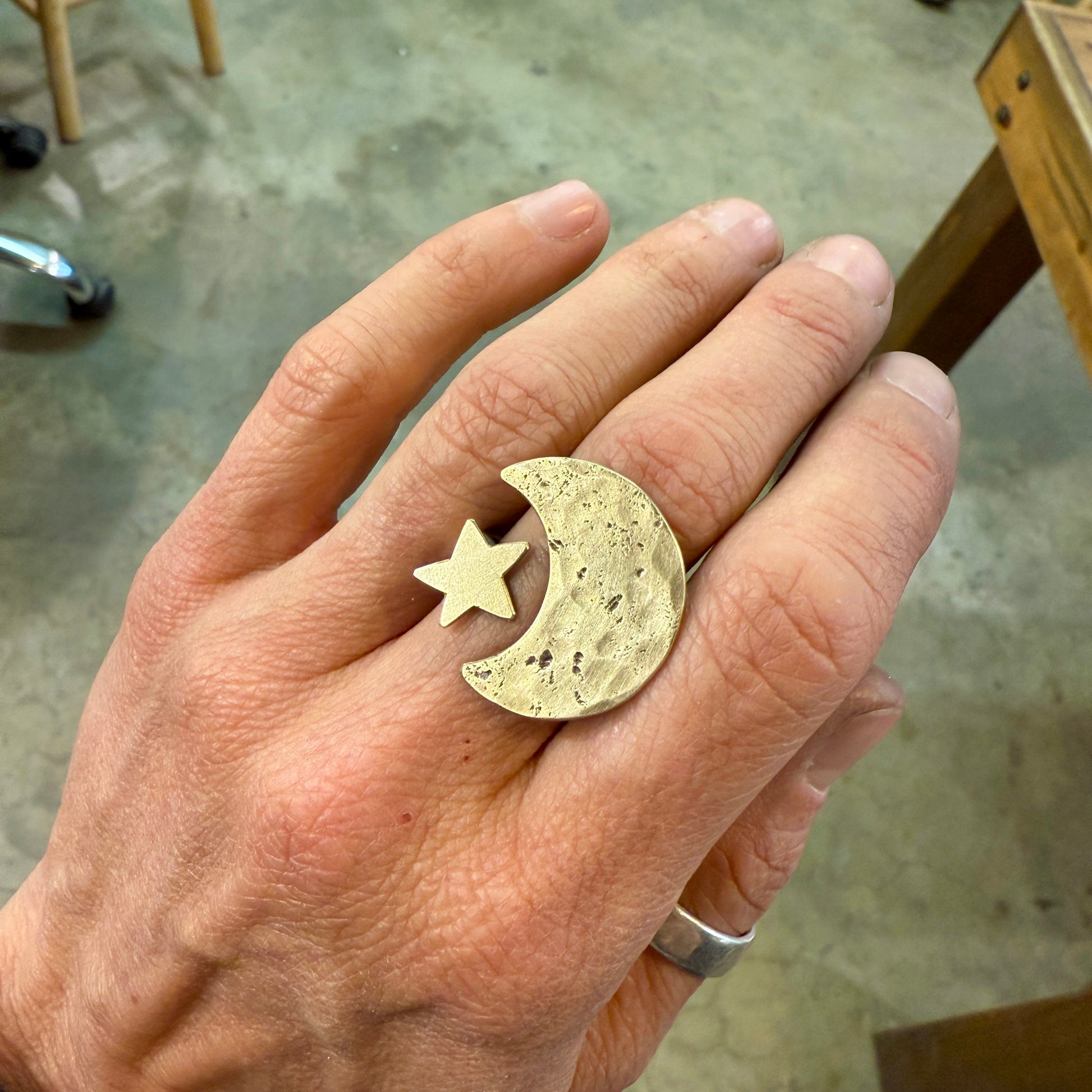 Second project: First you will measure and form your own simple ring band, which can include stamping and hammering for texture. Once you have a good fit you will use the torch to solder two different shapes on to the top of the ring, one on each end of the ring band. When designing your shapes you will consider how the they will interact with each other and how you want to use the negative space in between them. This ring will also be slightly adjustable.