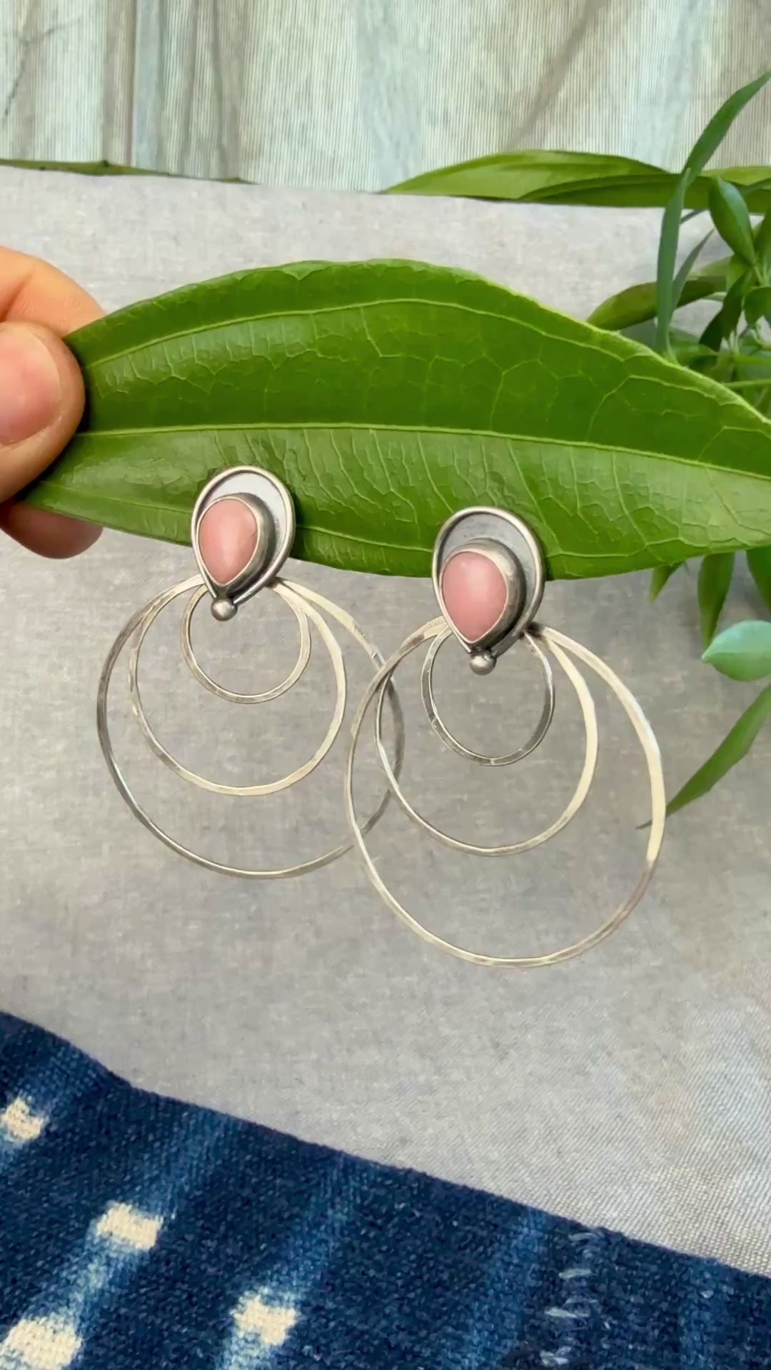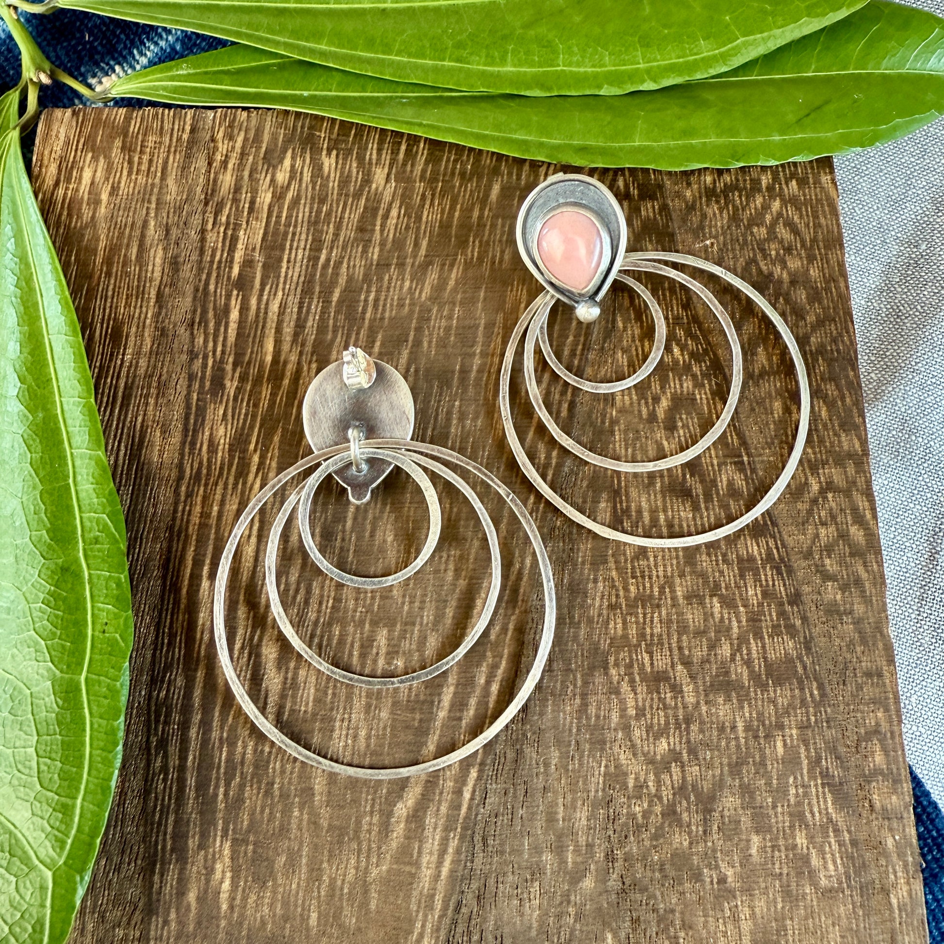 These pink opal stud earrings have a shadow box detail on the top. The ball is formed from heating silver until it fully melts and balls up. Three hoops are attached to the back with a loop and swing independently. Hammered details leave a soft organic feel.