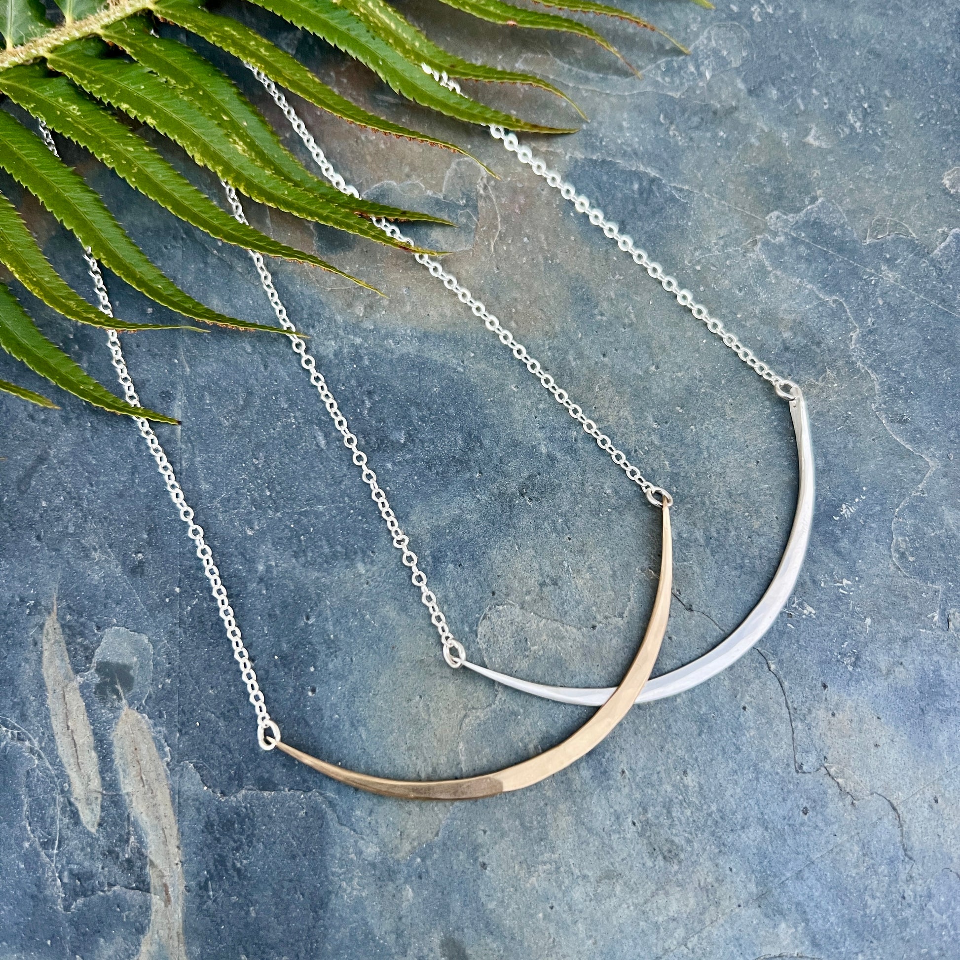 A simple staple necklace. The curved bar is hammered in two directions, giving a gentle tapered slope.