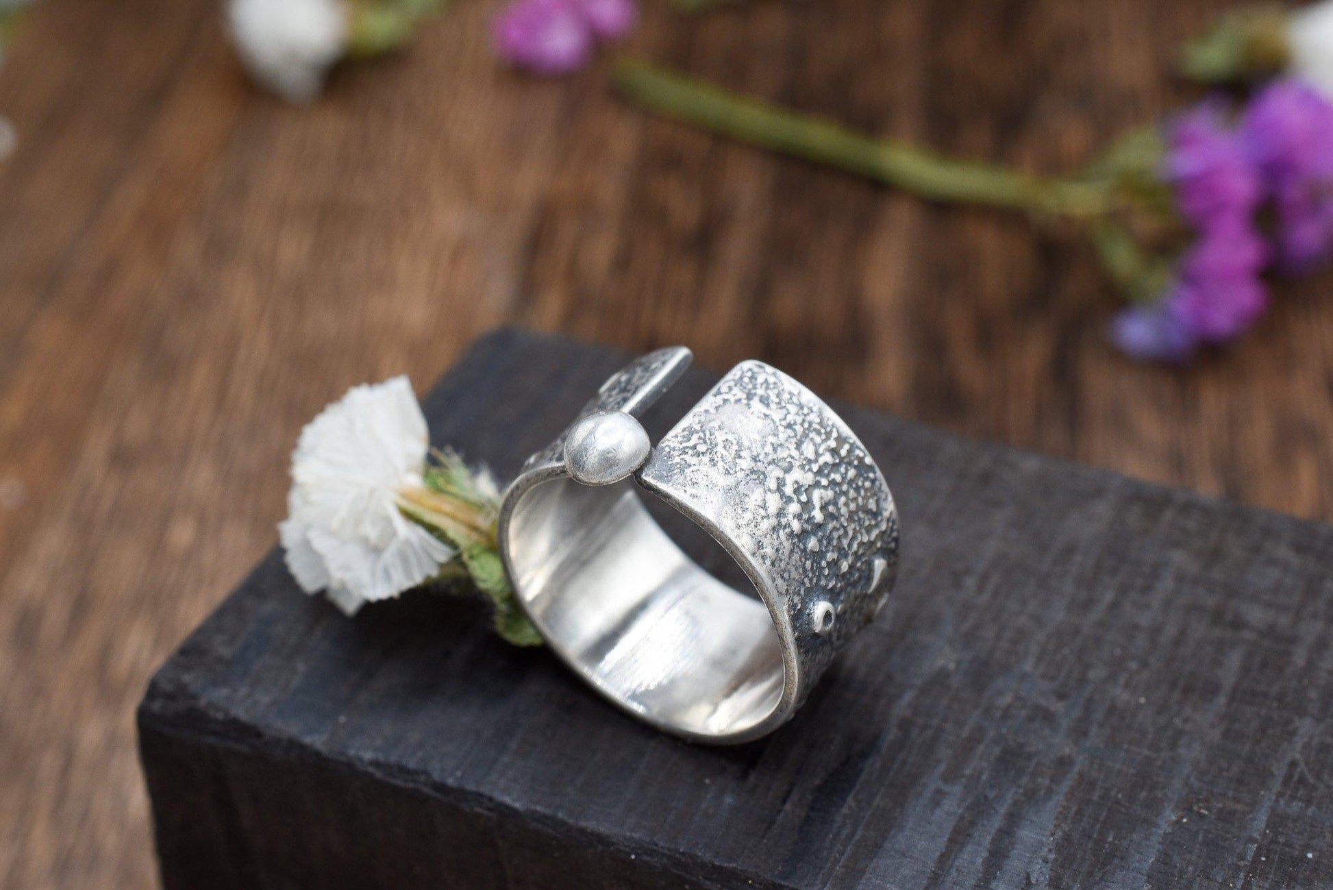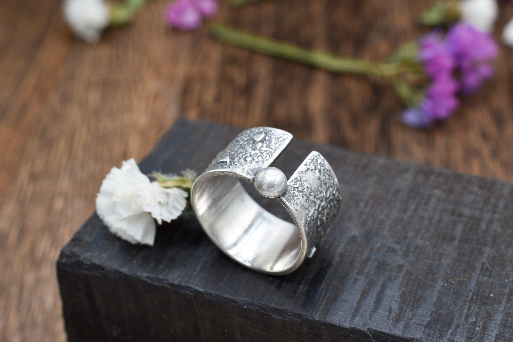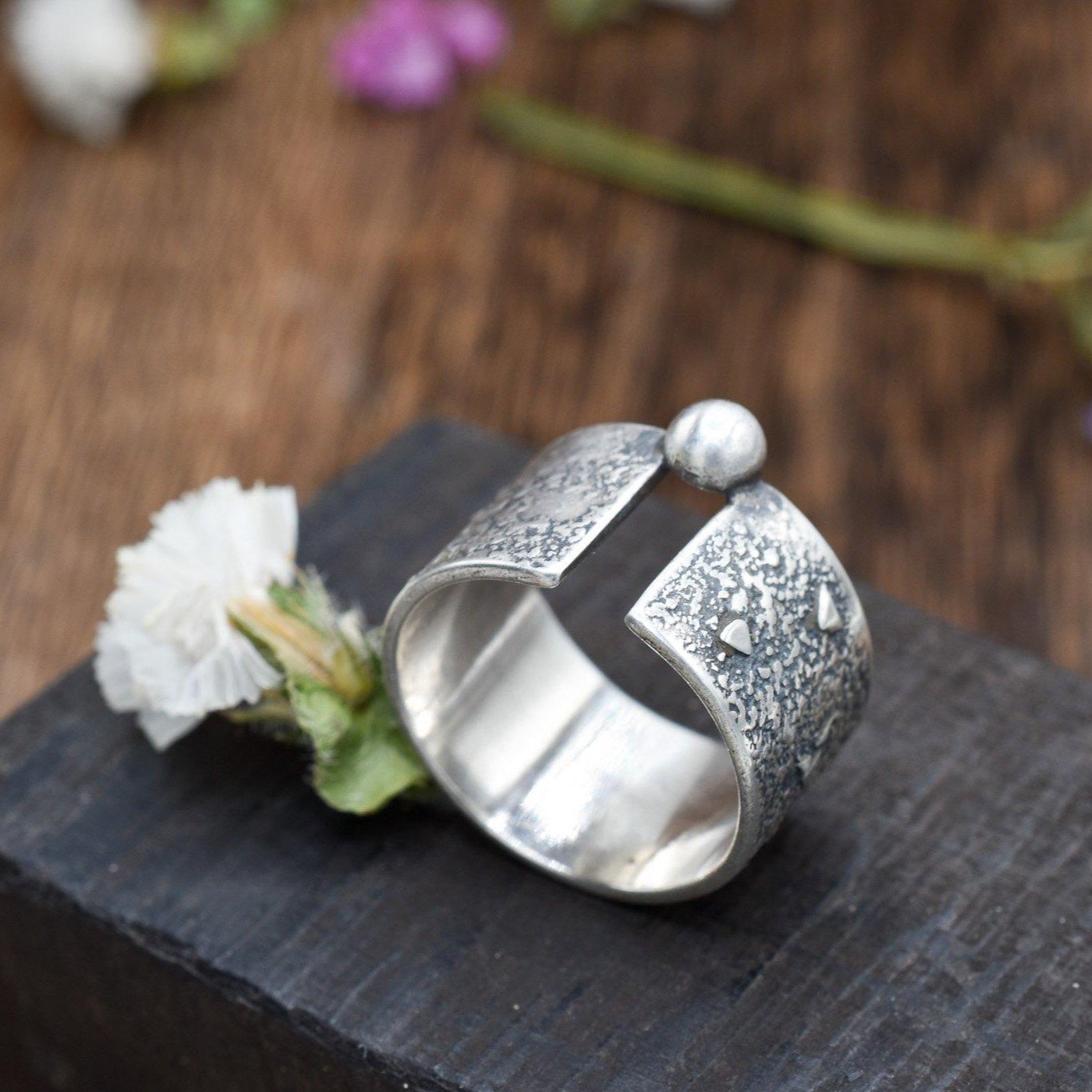 Wide band has organic melted texture with small triangles and circles fused into the surface. A ball is off set at the top (or bottom) of the “canyon”. Sterling silver with a satin finish.