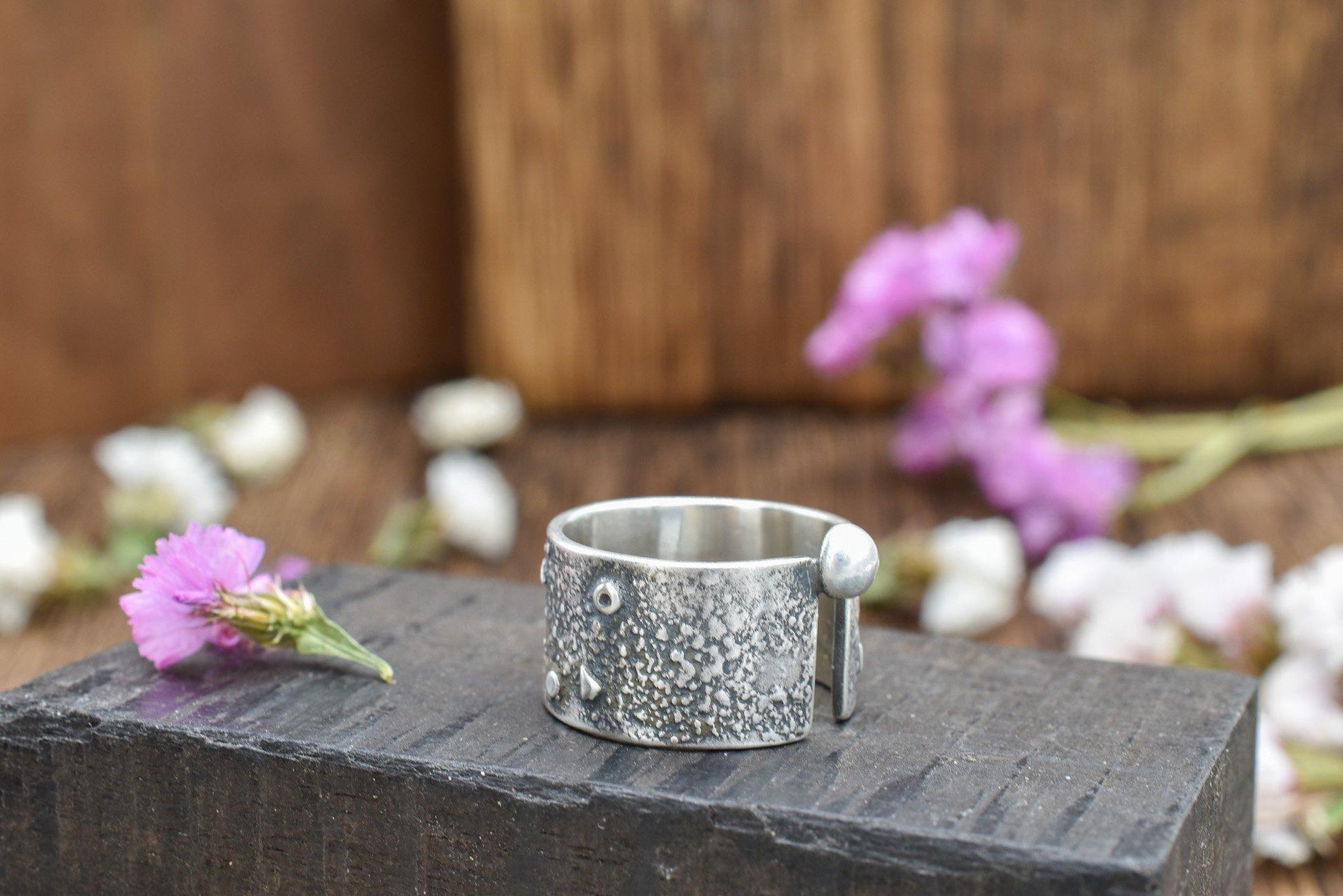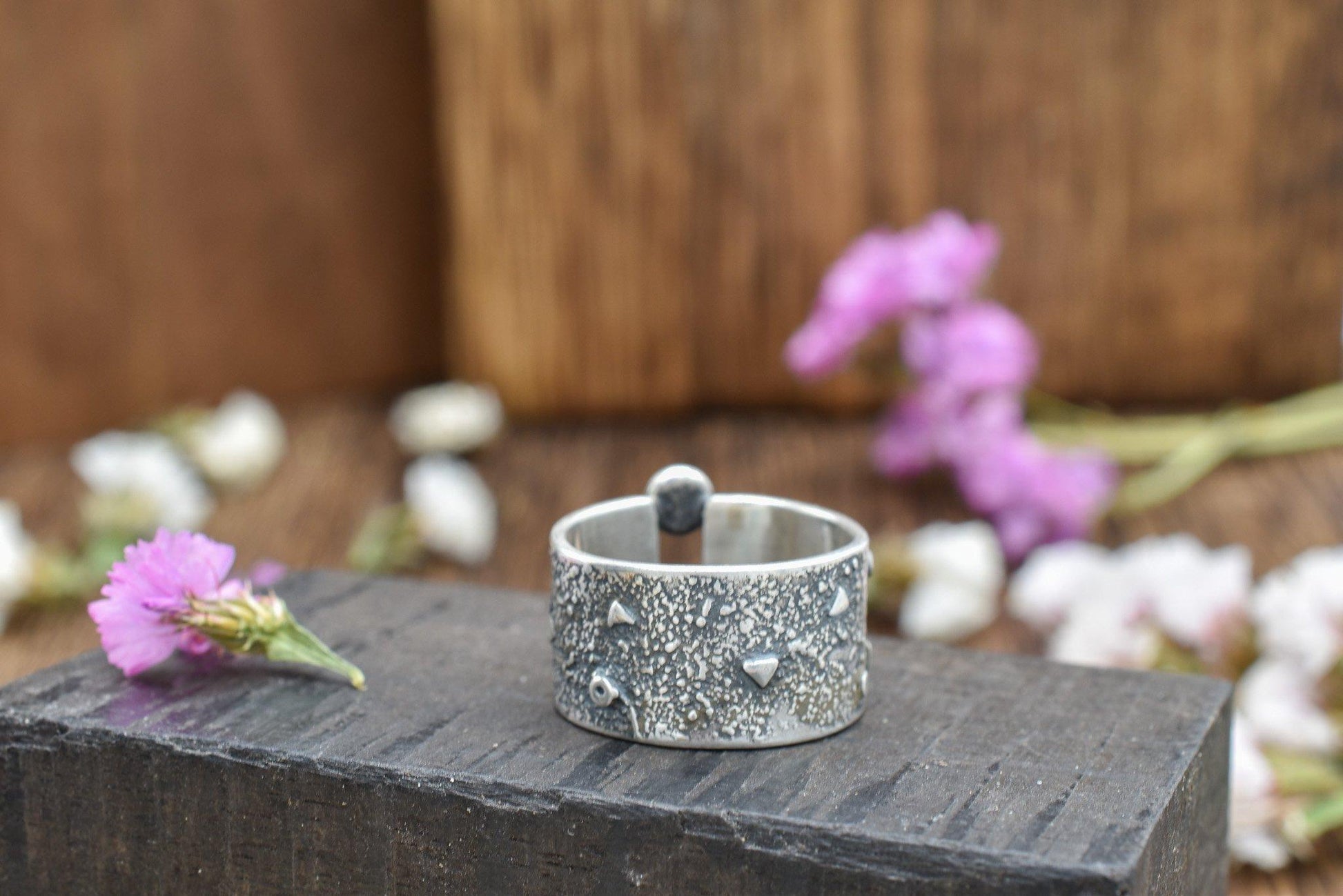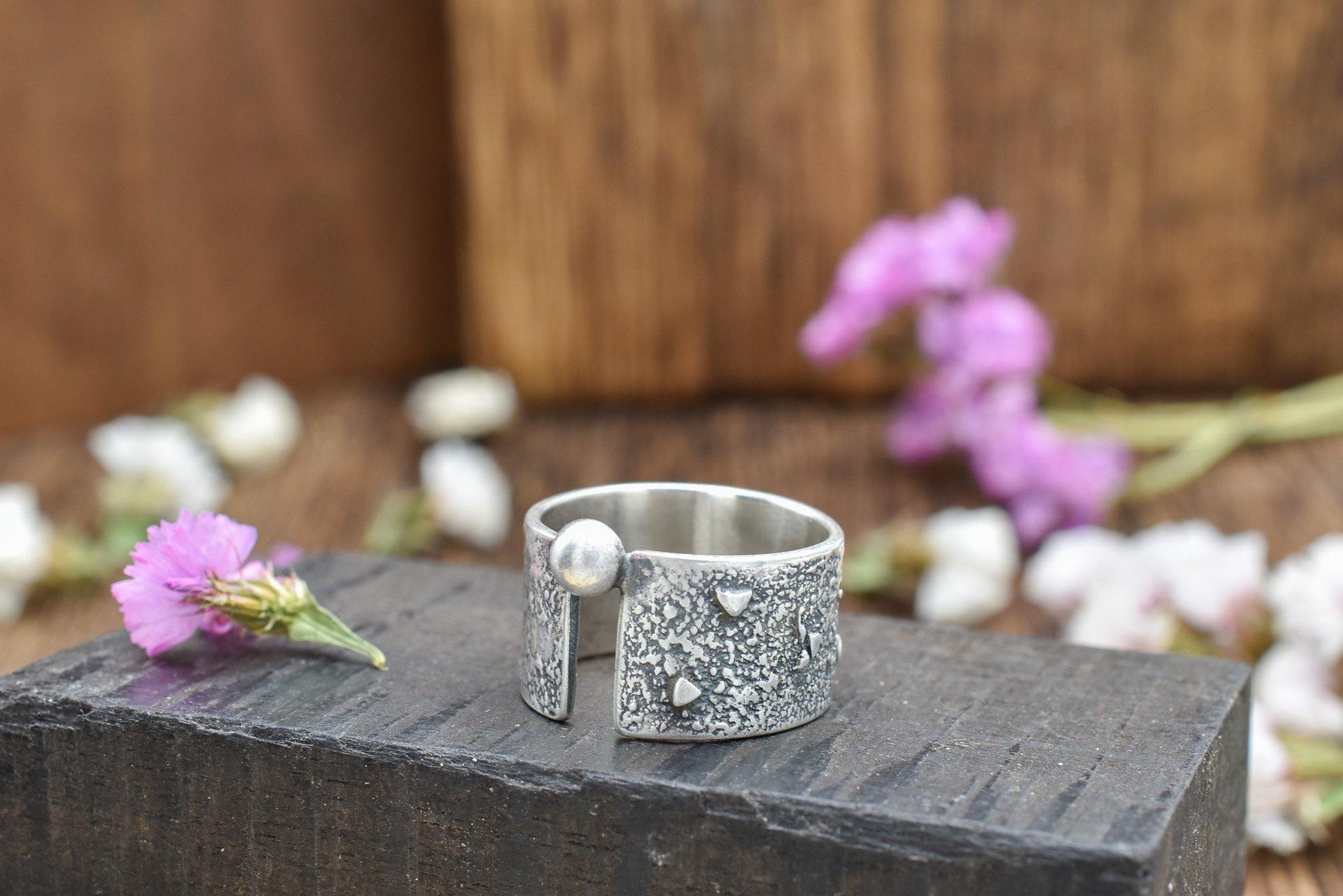 Wide band has organic melted texture with small triangles and circles fused into the surface. A ball is off set at the top (or bottom) of the “canyon”. Sterling silver with a satin finish.