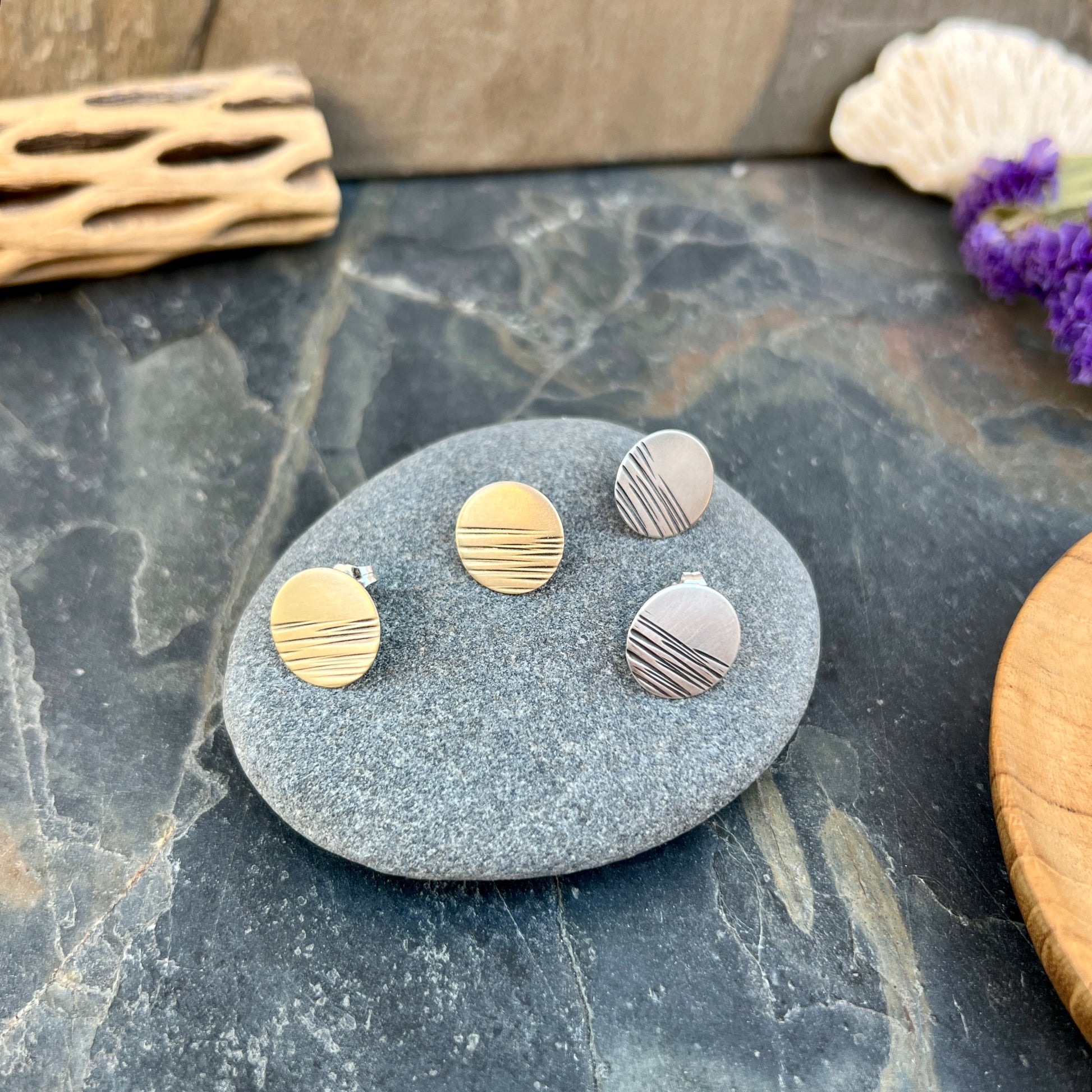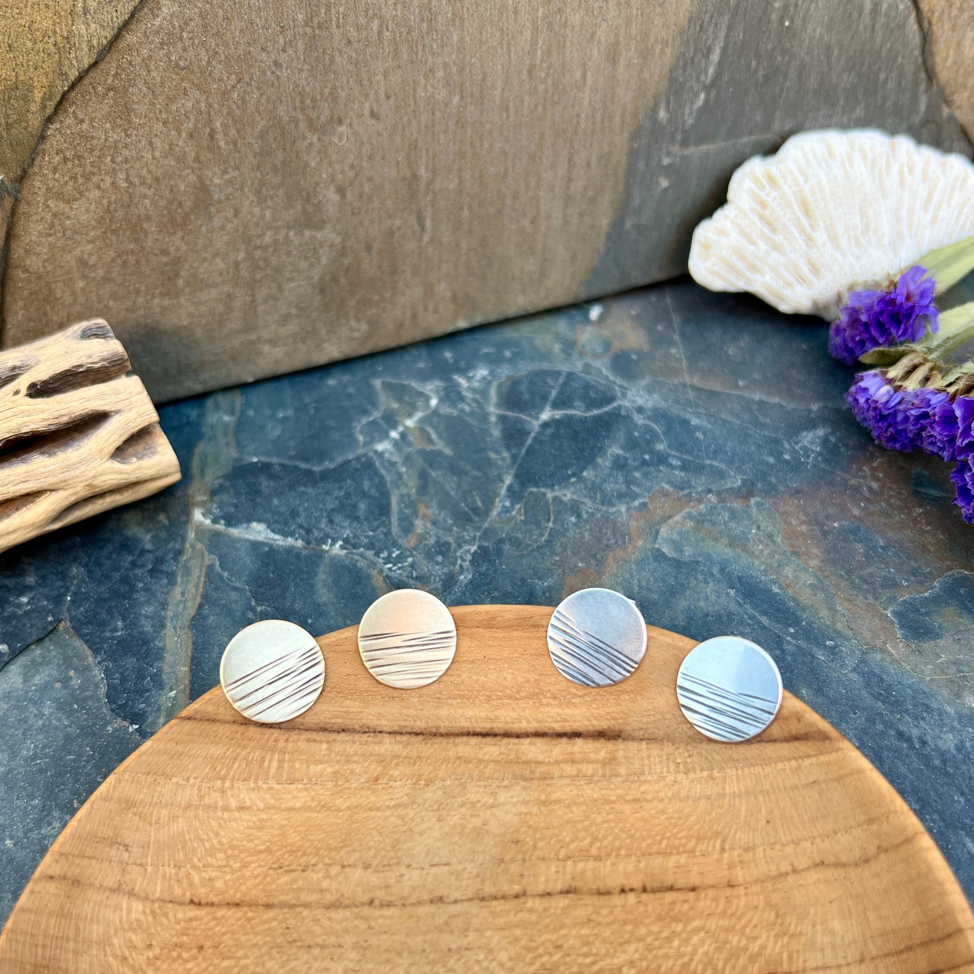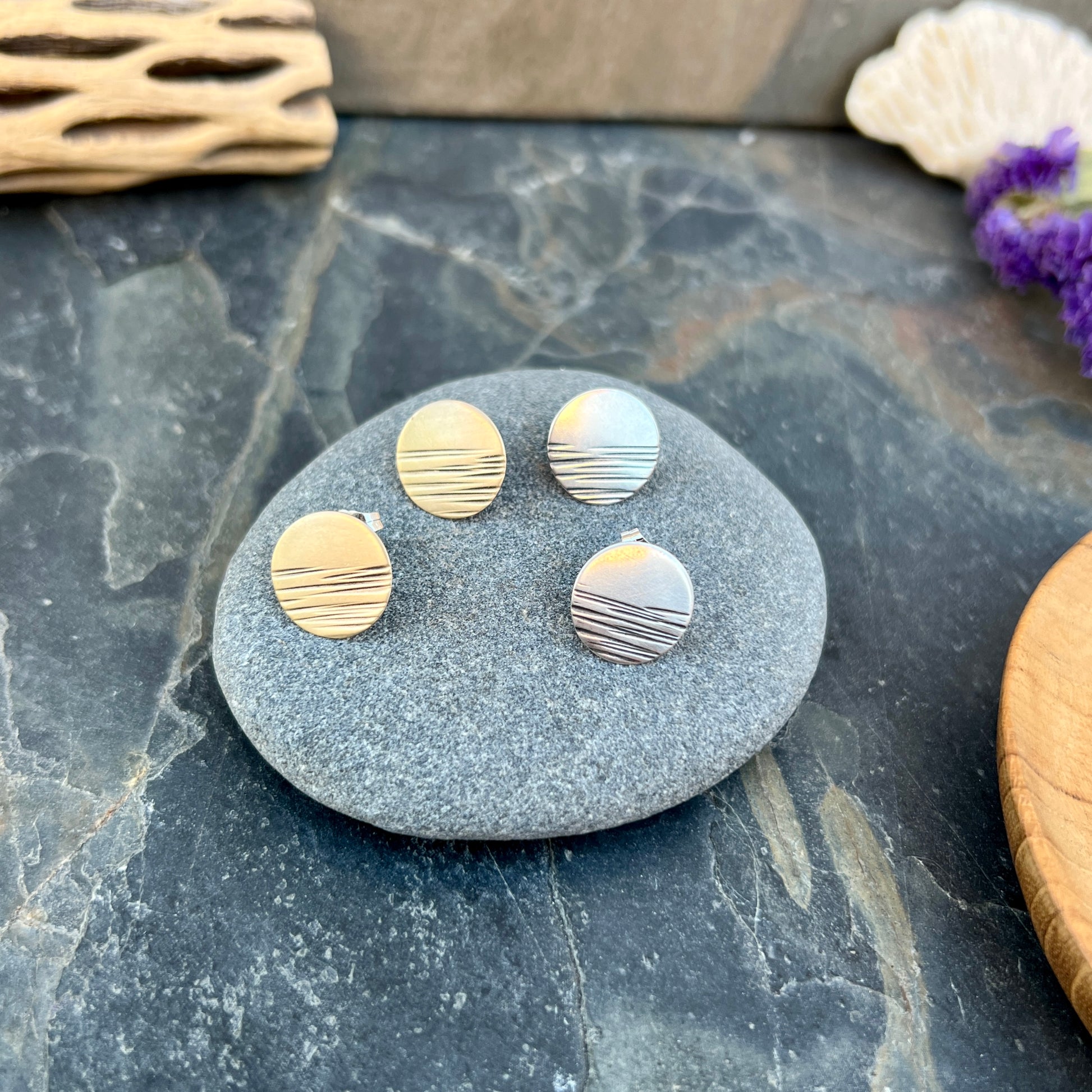 Simple circular studs with my signature dash marks.