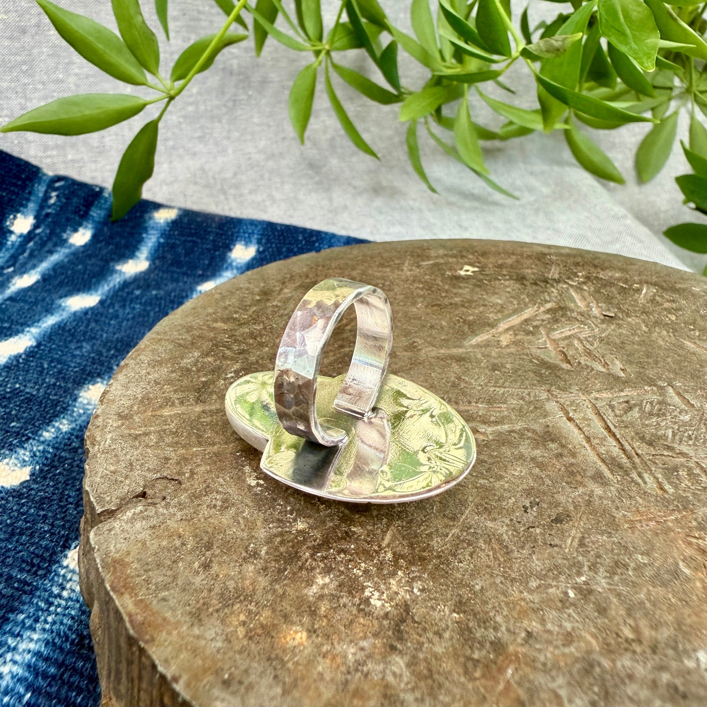 Unknown yellow stone, probably some kind of agate. Hand-stamped pattern and hammered band.