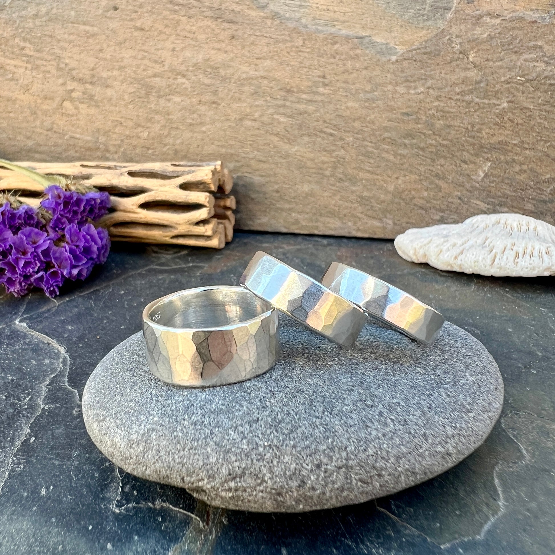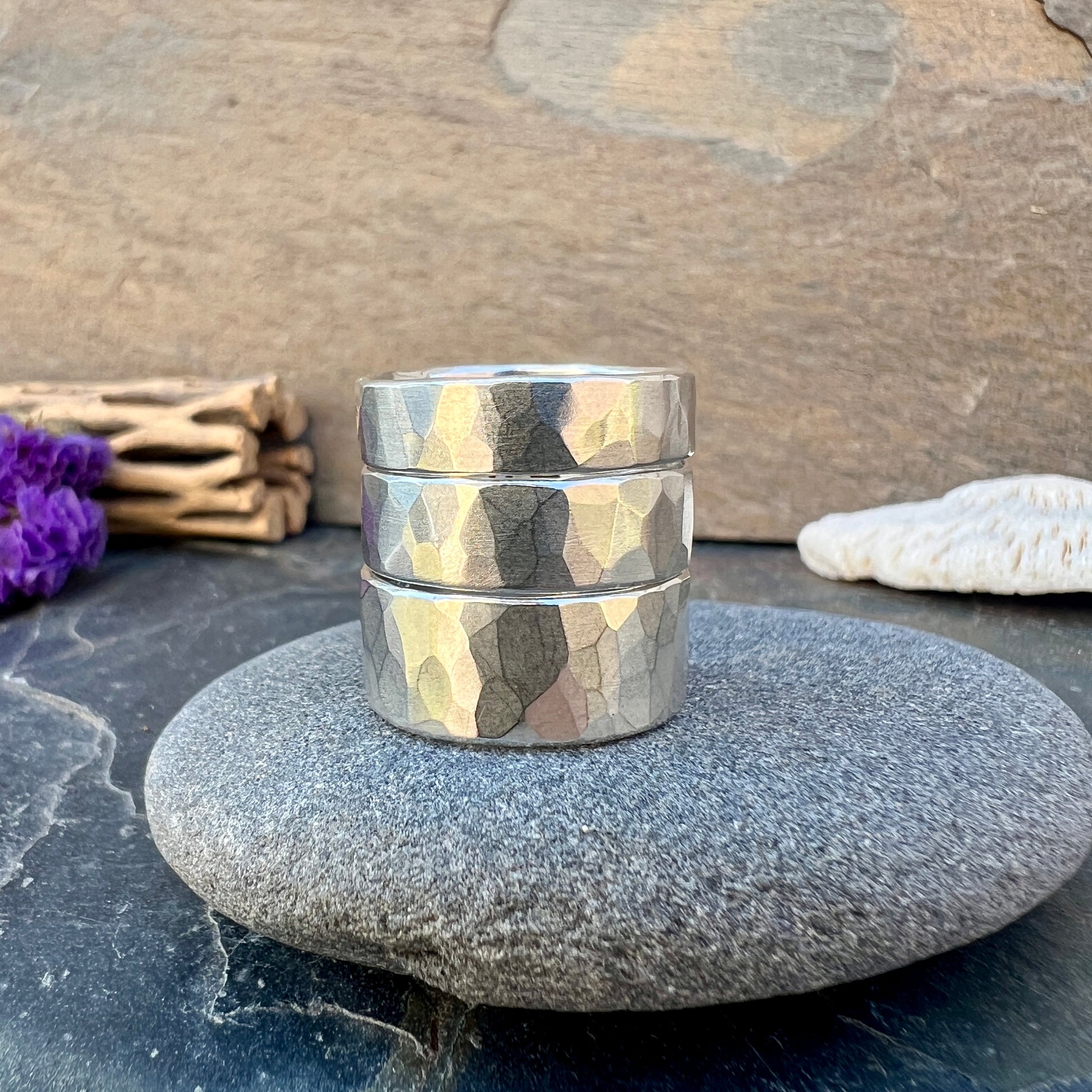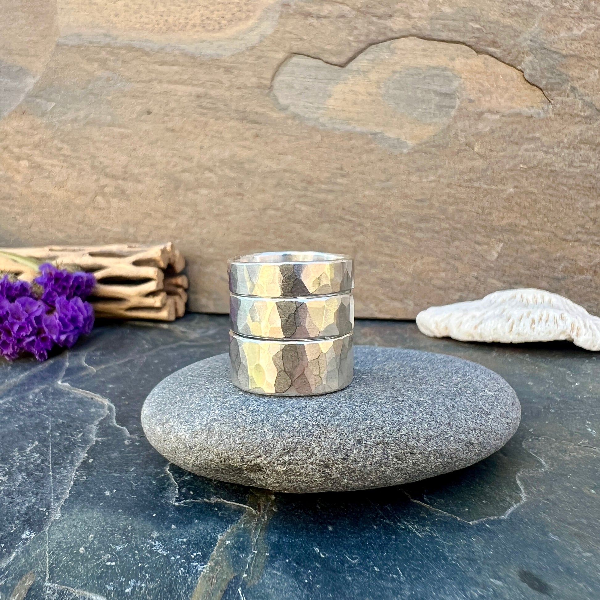 Another classic ring style that can be worn on its own or as part of a stack. The wide bands look great with one or two stackers. The faceted texture is hand hammered and each one will be unique.