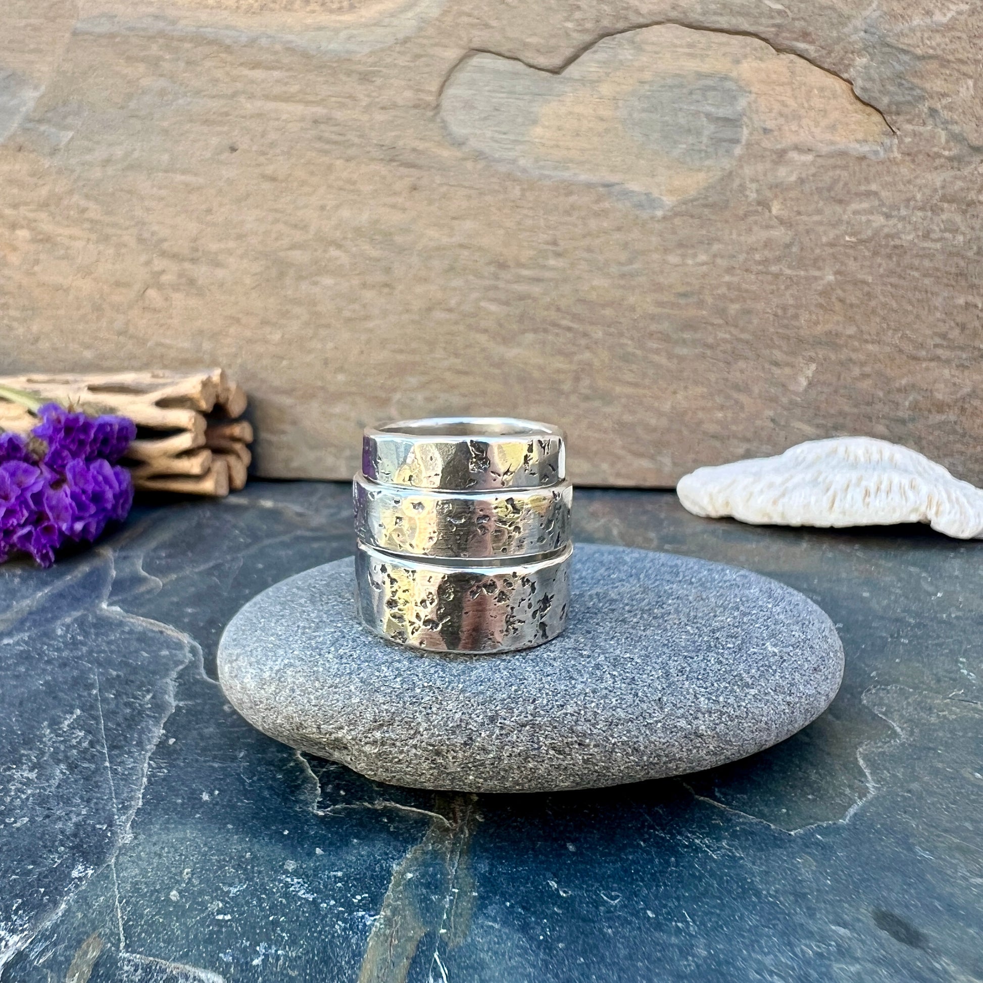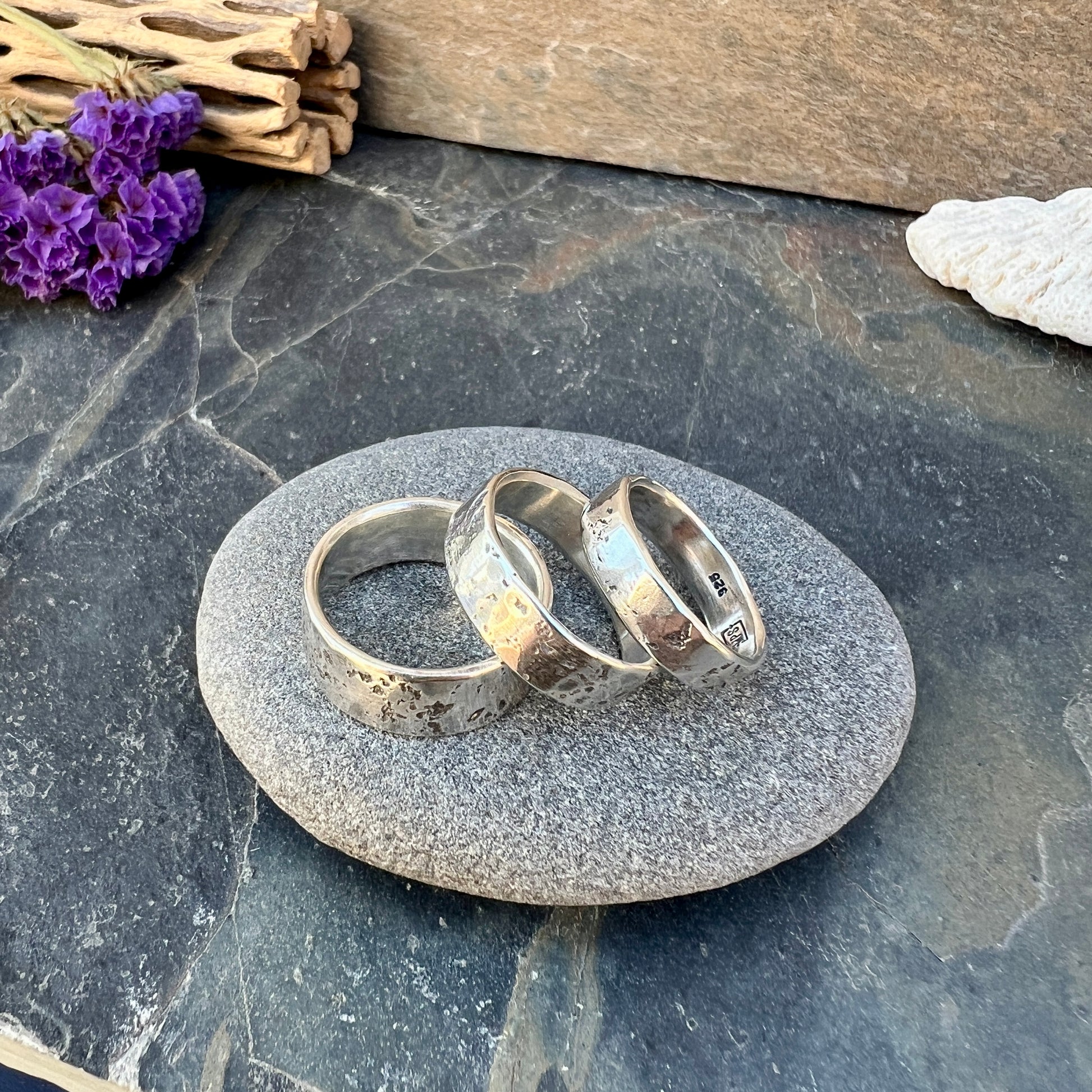 These rings can be worn on their own or as part of a stack. They look great with one or two stackers. The rustic texture in these rings is hammered by hand and each one will be unique.