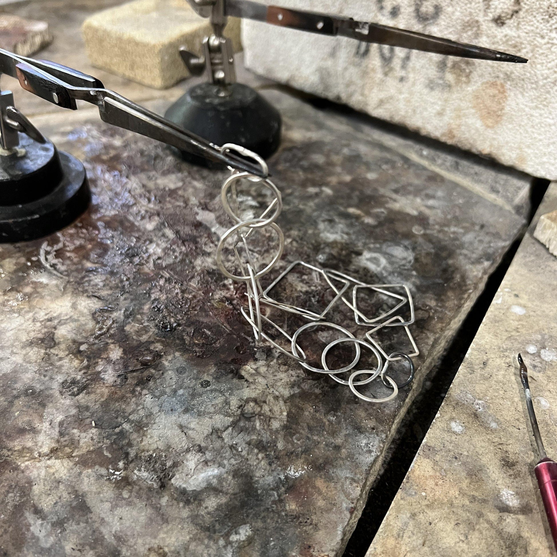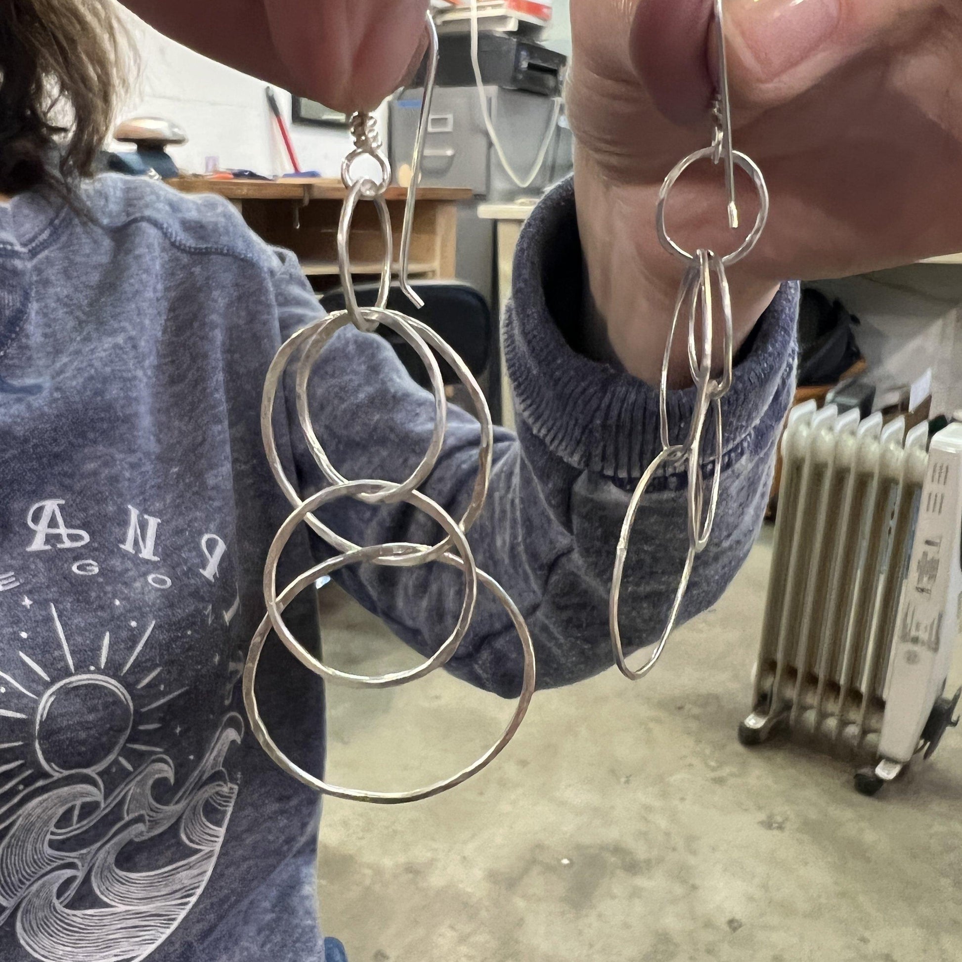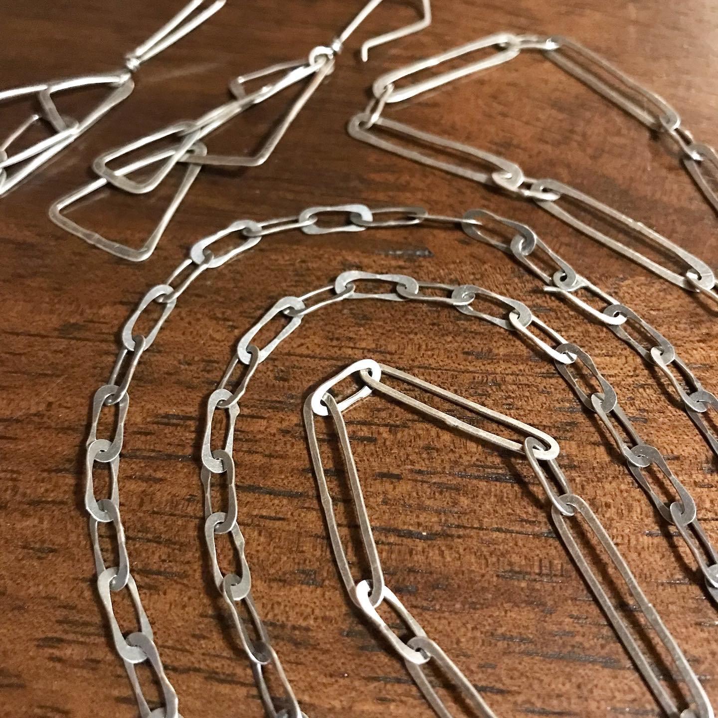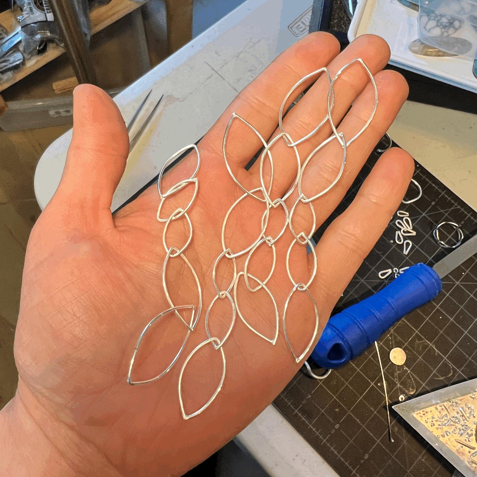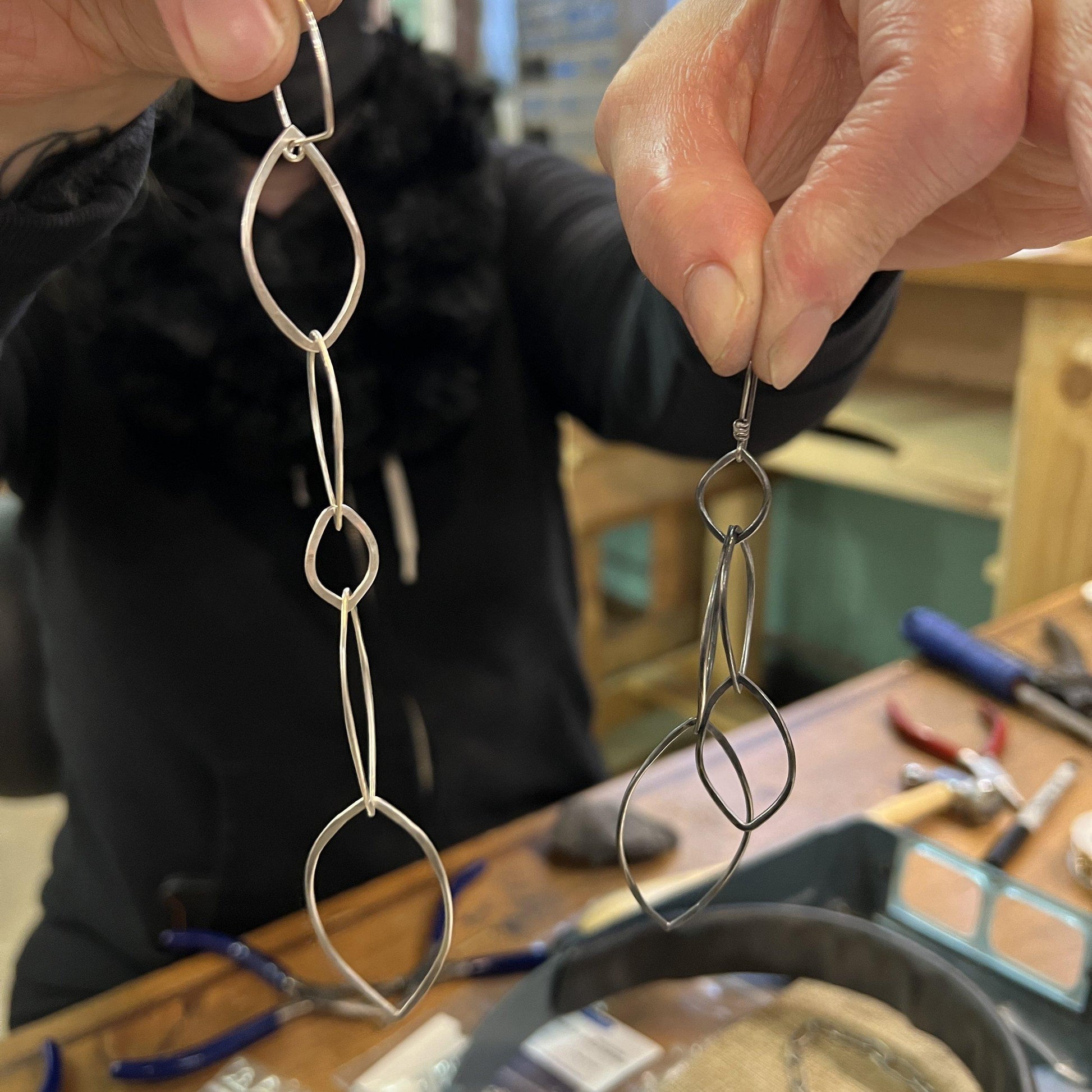 In this class you will learn how to use the torch to solder links together, forming a handmade chain. You will be able to choose the size and shape of each link and how they are attached or layered together. This is a fun way to make large earrings that are light and airy. If you choose to make a necklace instead of earrings you will make one or two strands for the front, and the remainder of your length will be regular chain with a clasp. You will hammer texture into each link and then have the option to add a darkening patina.