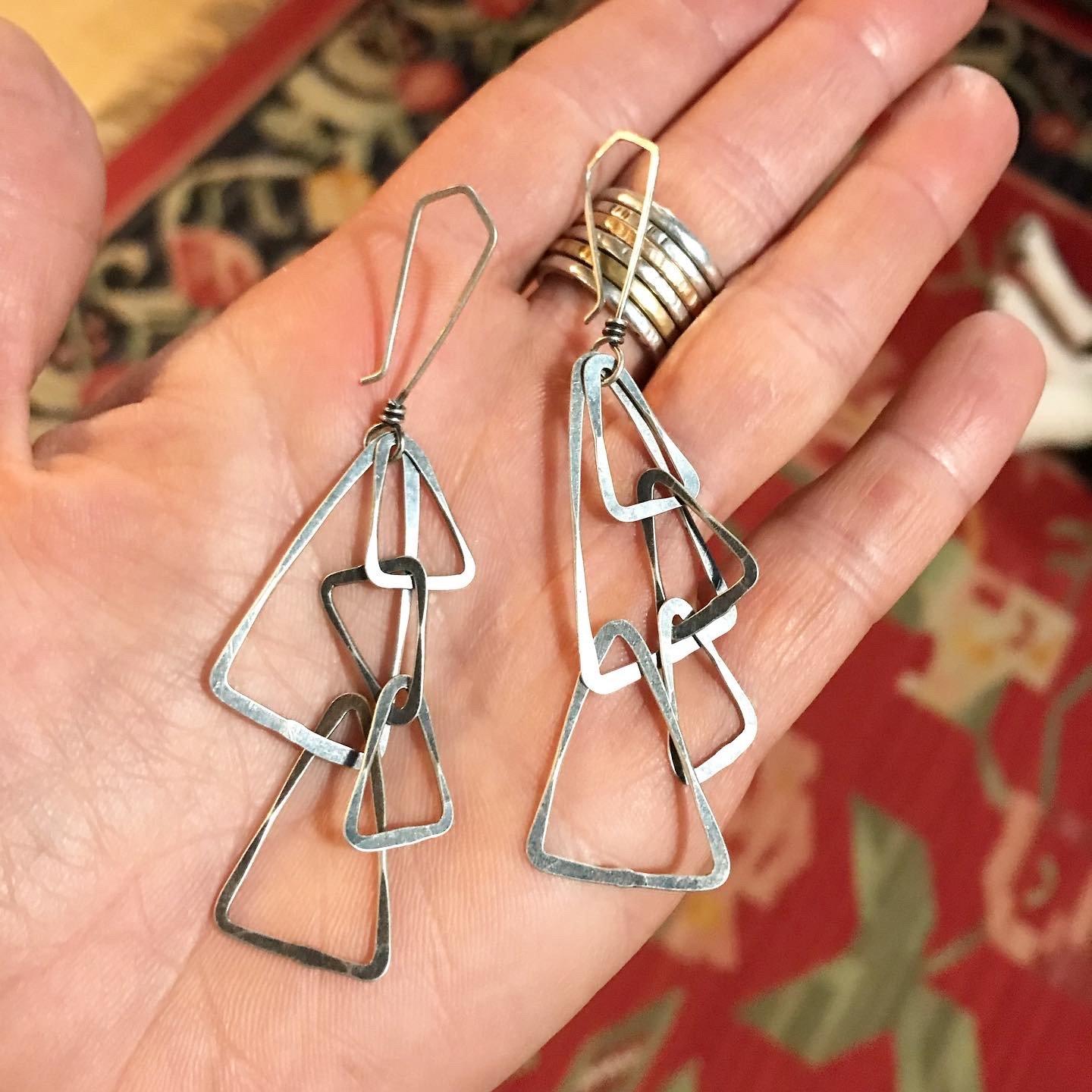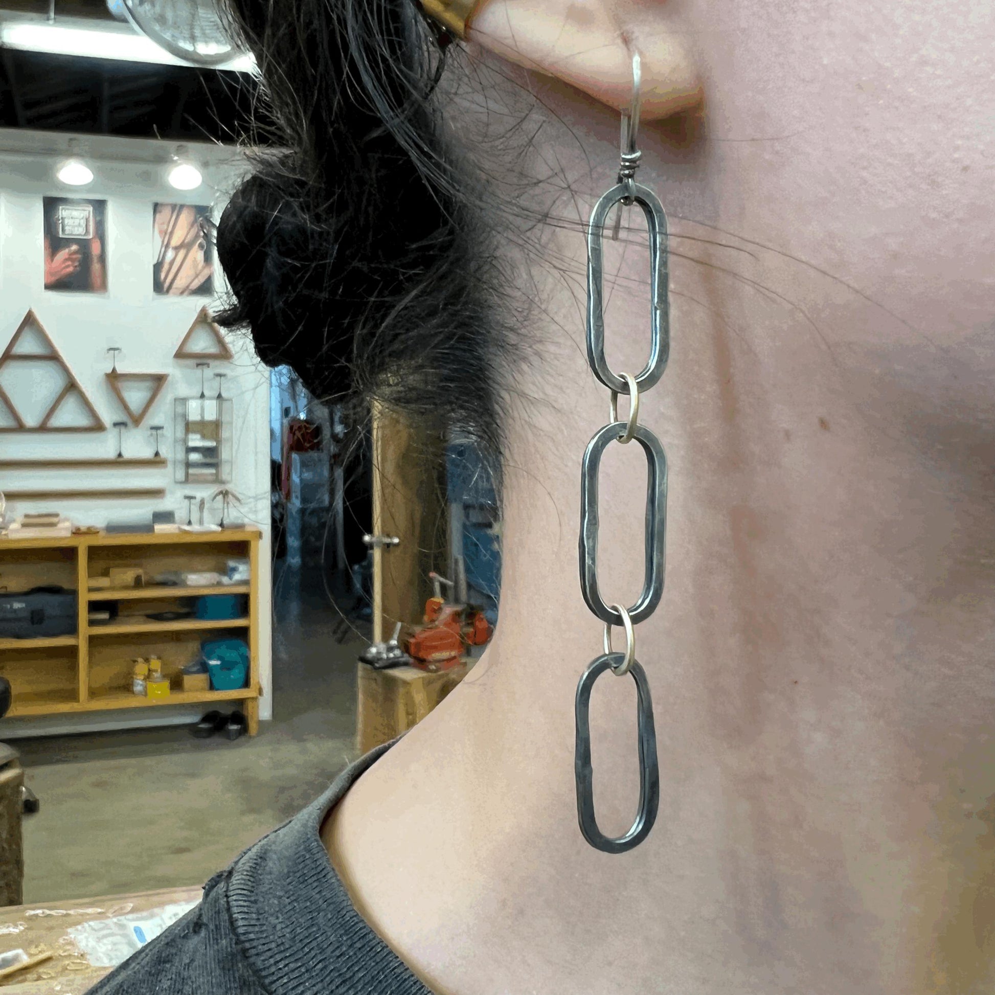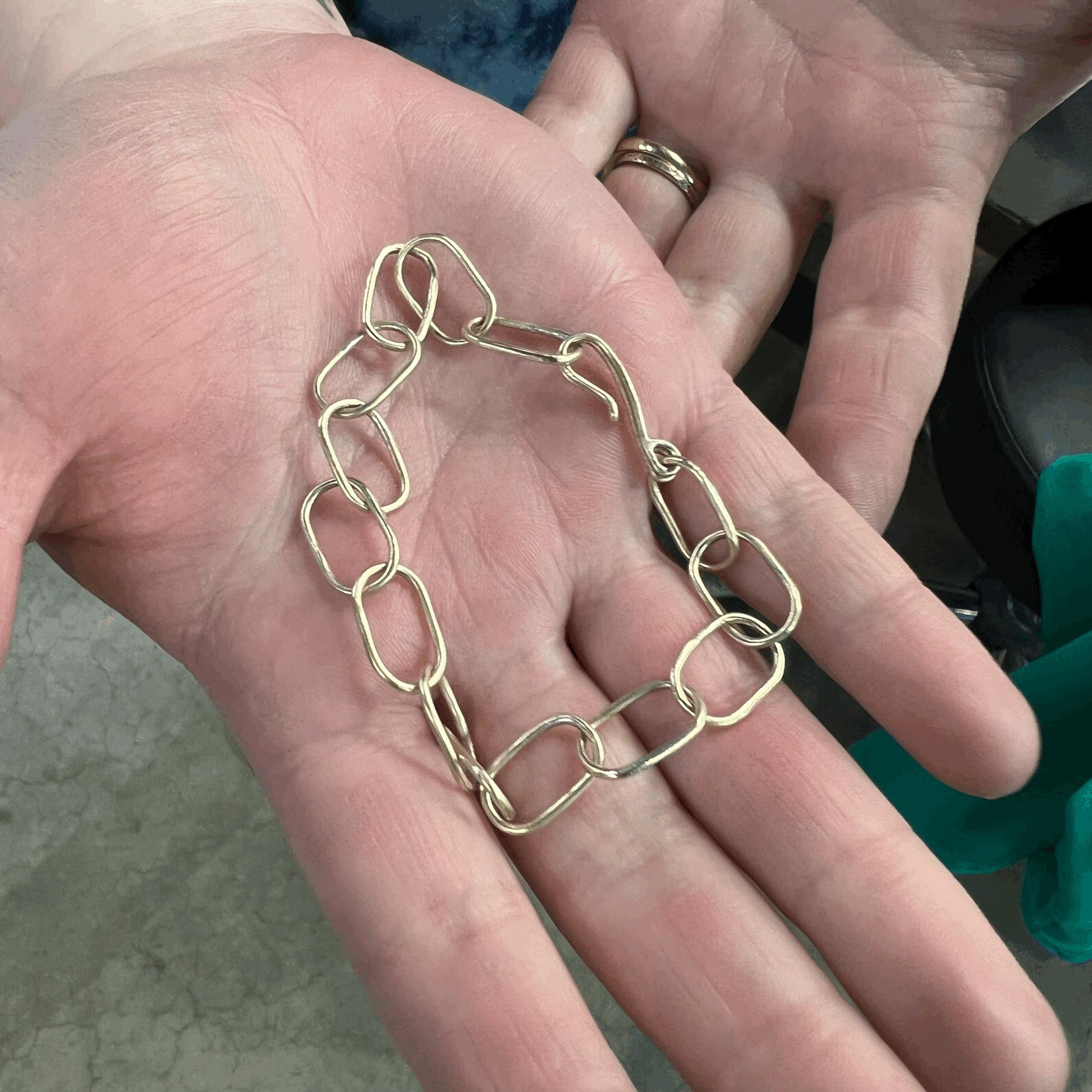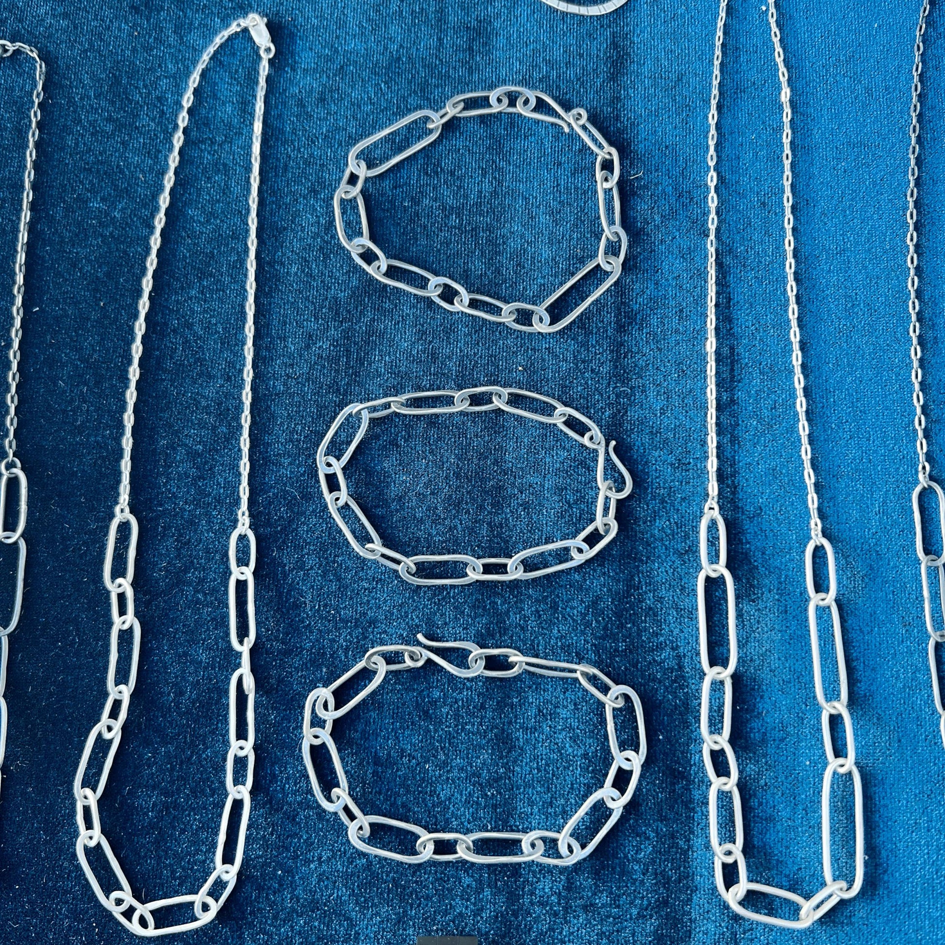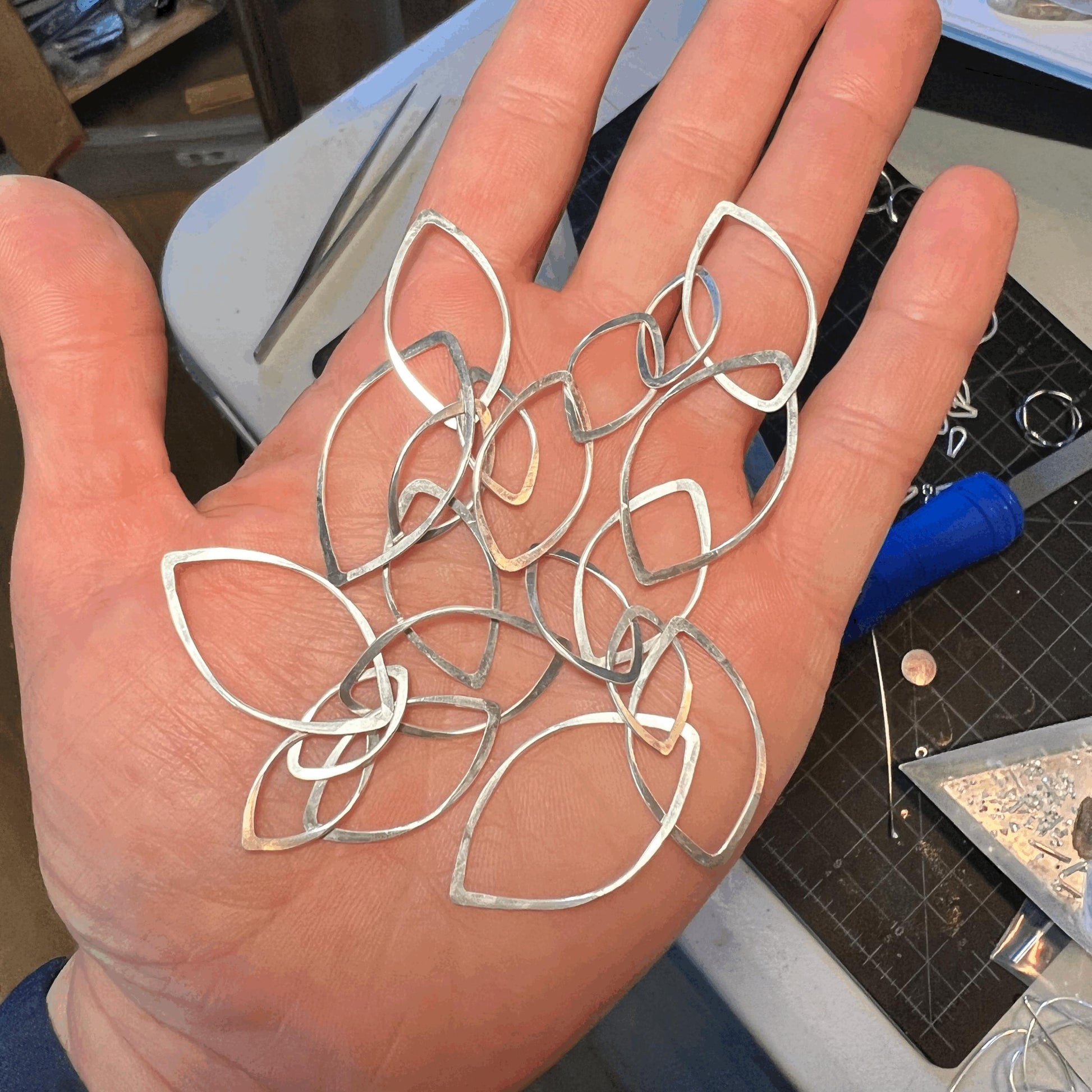 In this class you will learn how to use the torch to solder links together, forming a handmade chain. You will be able to choose the size and shape of each link and how they are attached or layered together. This is a fun way to make large earrings that are light and airy. If you choose to make a necklace instead of earrings you will make one or two strands for the front, and the remainder of your length will be regular chain with a clasp. You will hammer texture into each link and then have the option to add a darkening patina.
