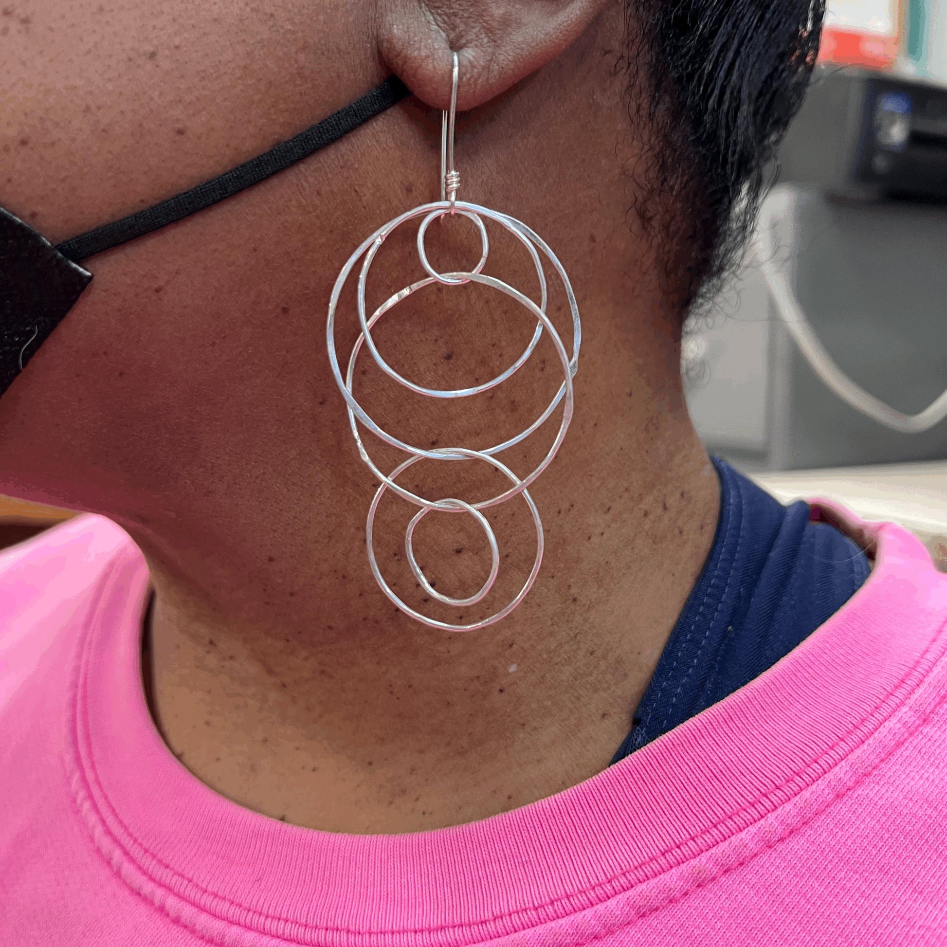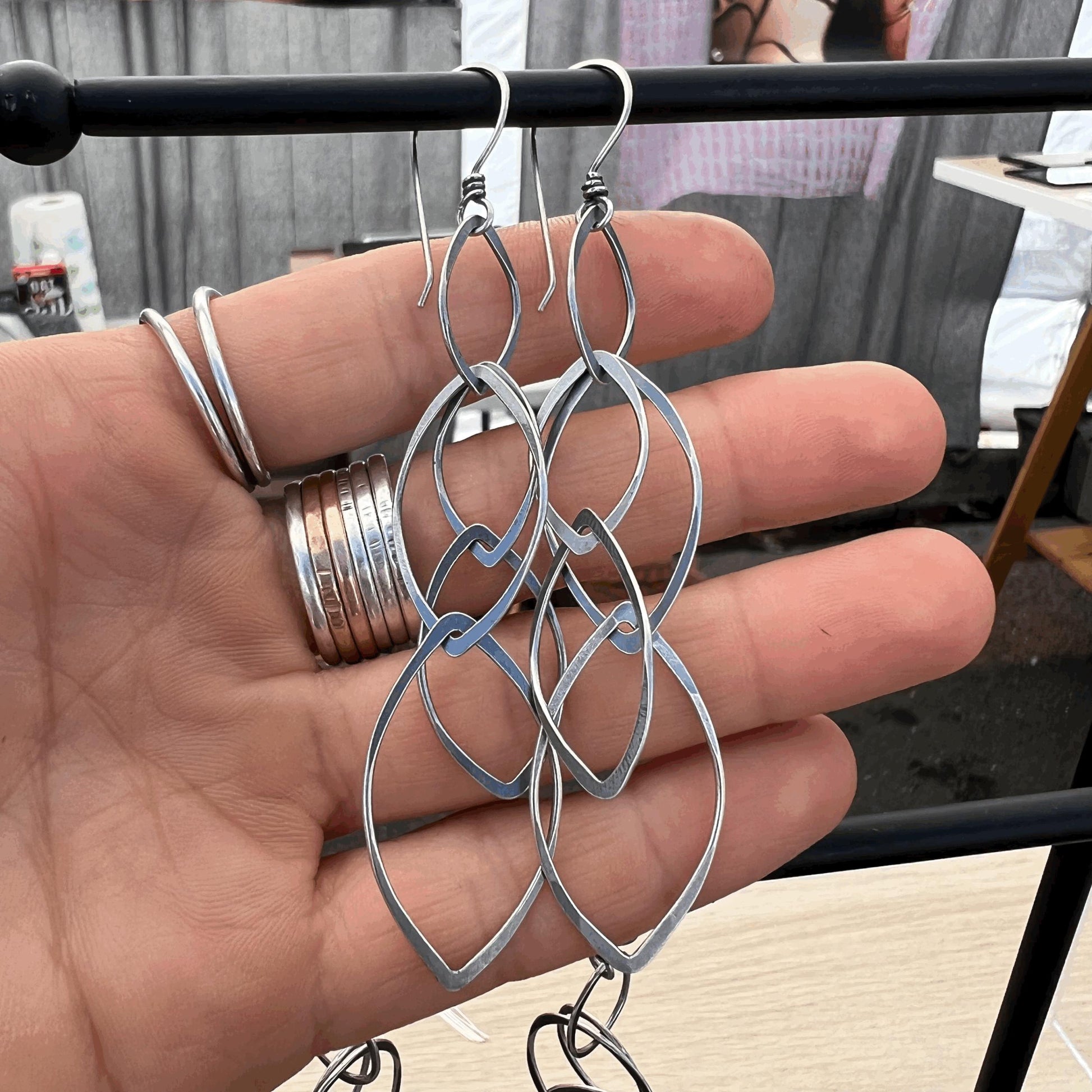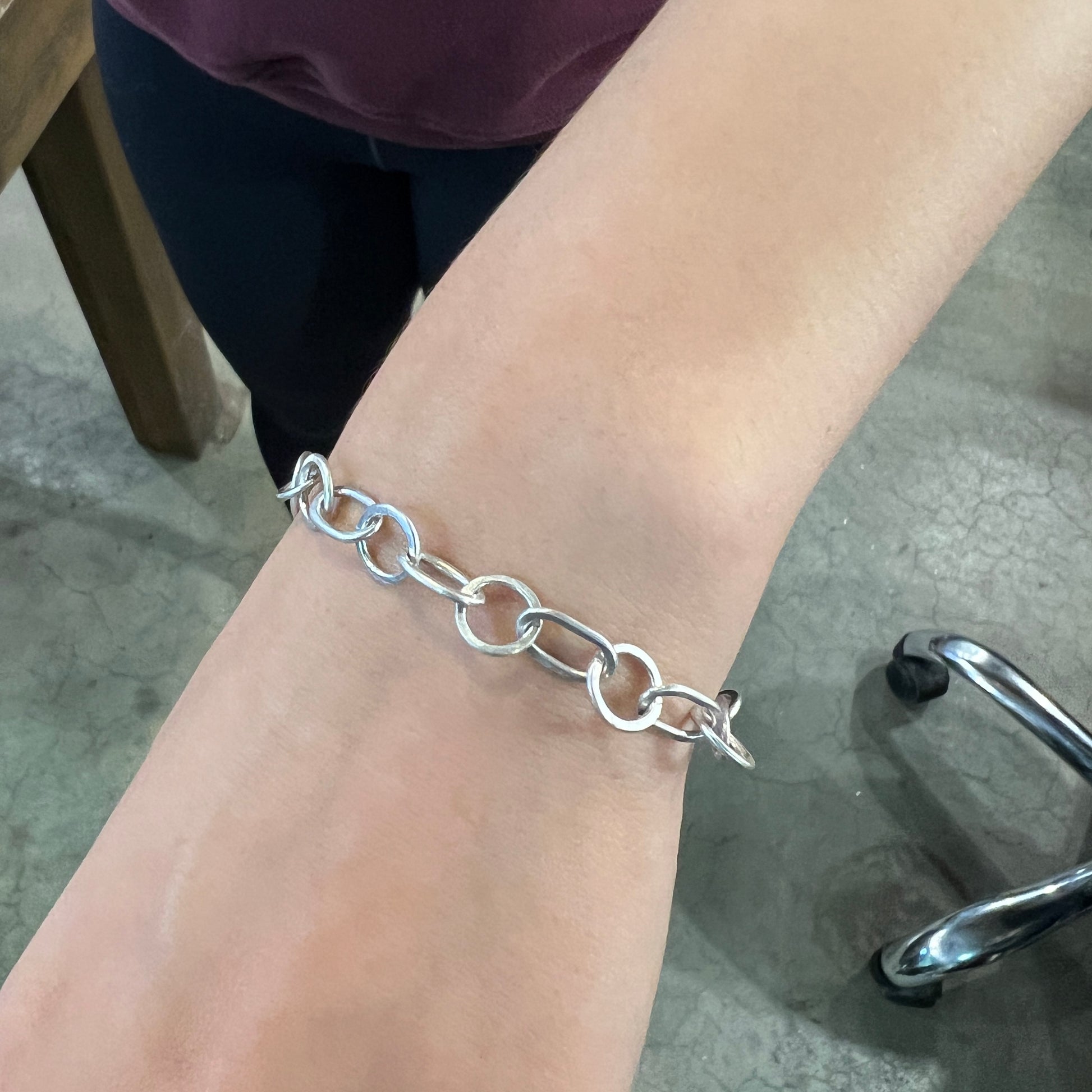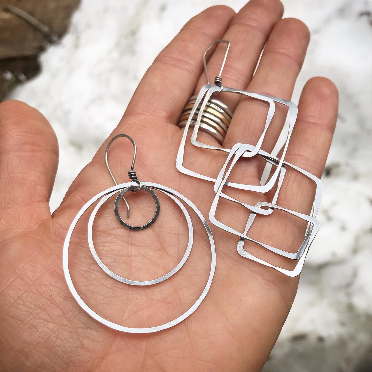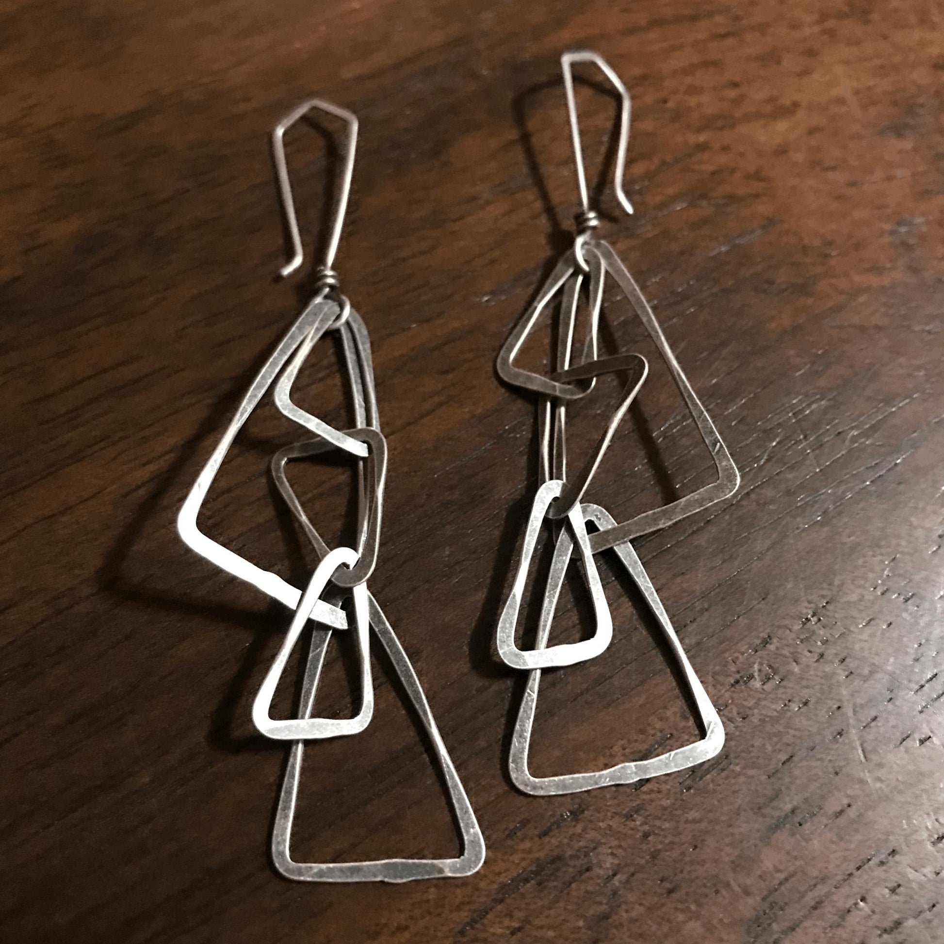 In this class you will learn how to use the torch to solder links together, forming a handmade chain. You will be able to choose the size and shape of each link and how they are attached or layered together. This is a fun way to make large earrings that are light and airy. If you choose to make a necklace instead of earrings you will make one or two strands for the front, and the remainder of your length will be regular chain with a clasp. You will hammer texture into each link and then have the option to add a darkening patina.