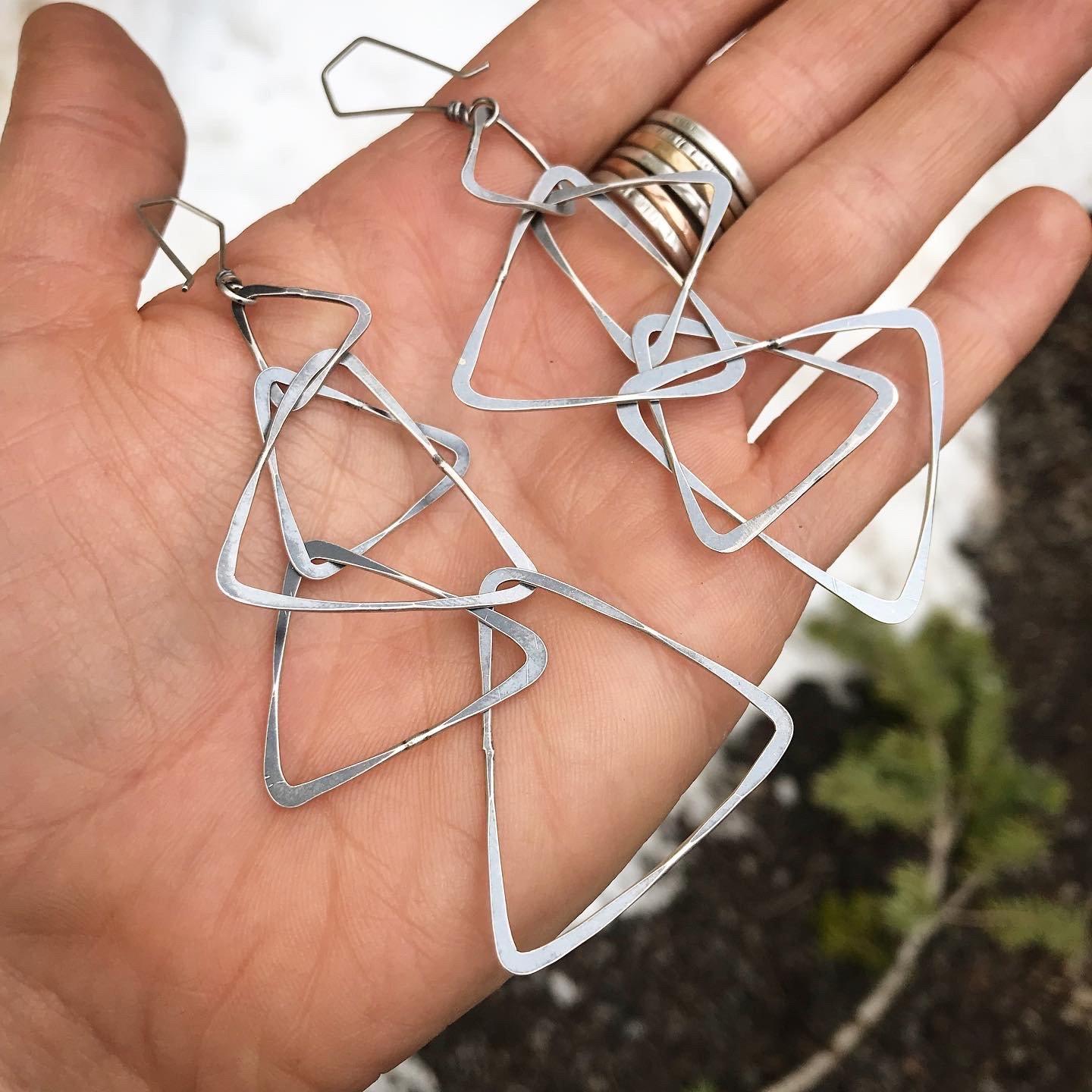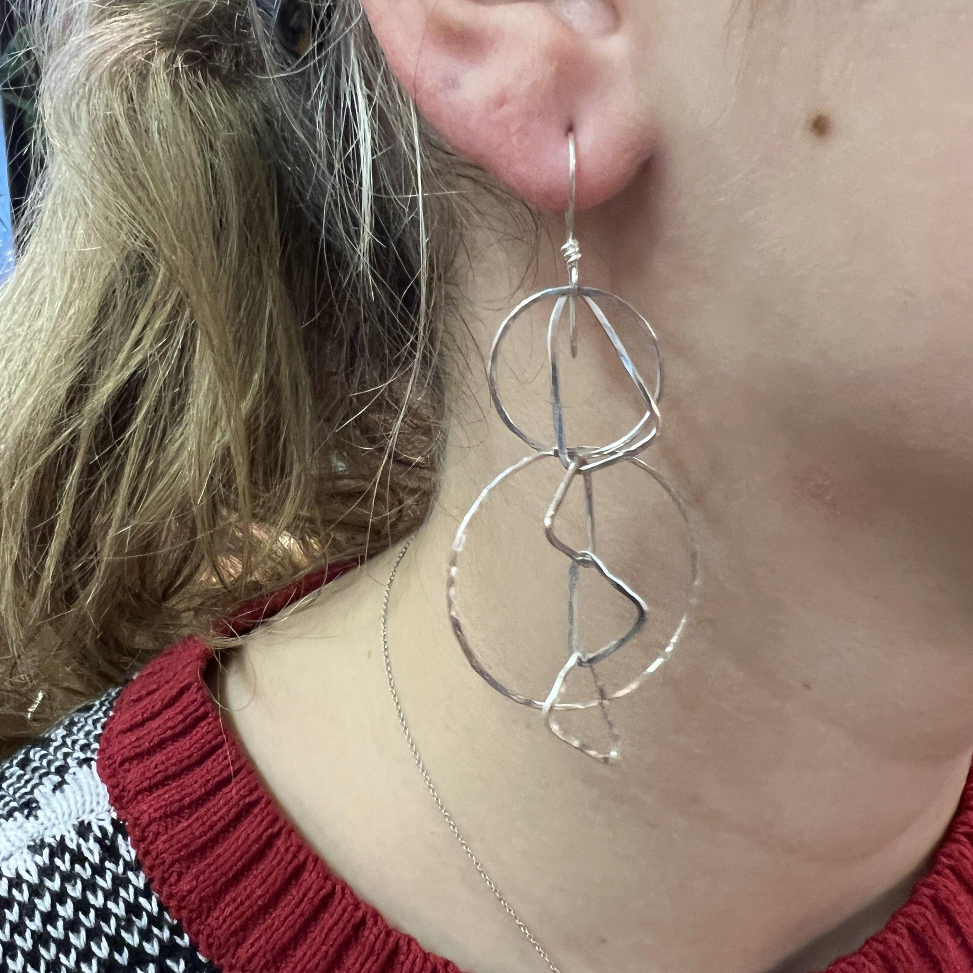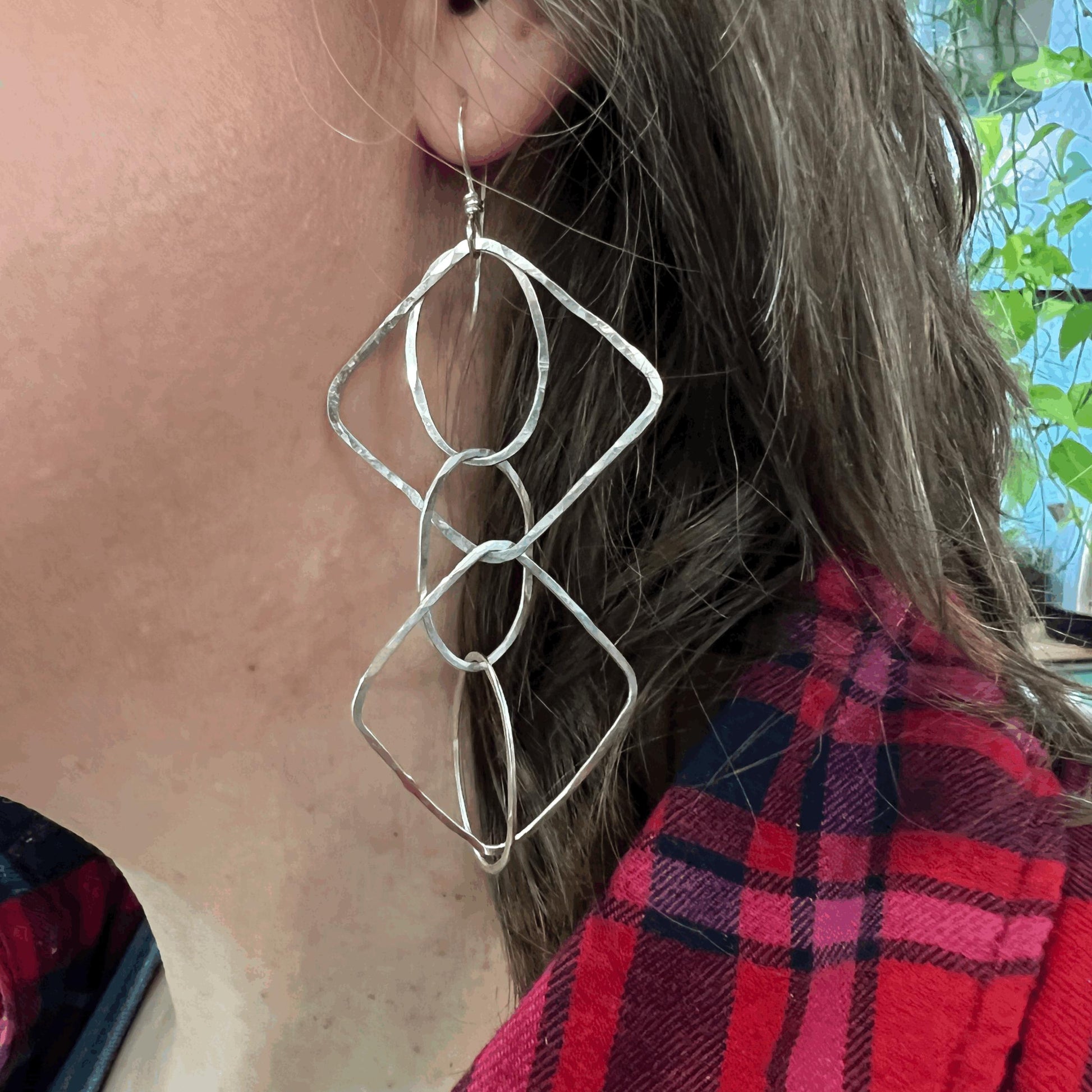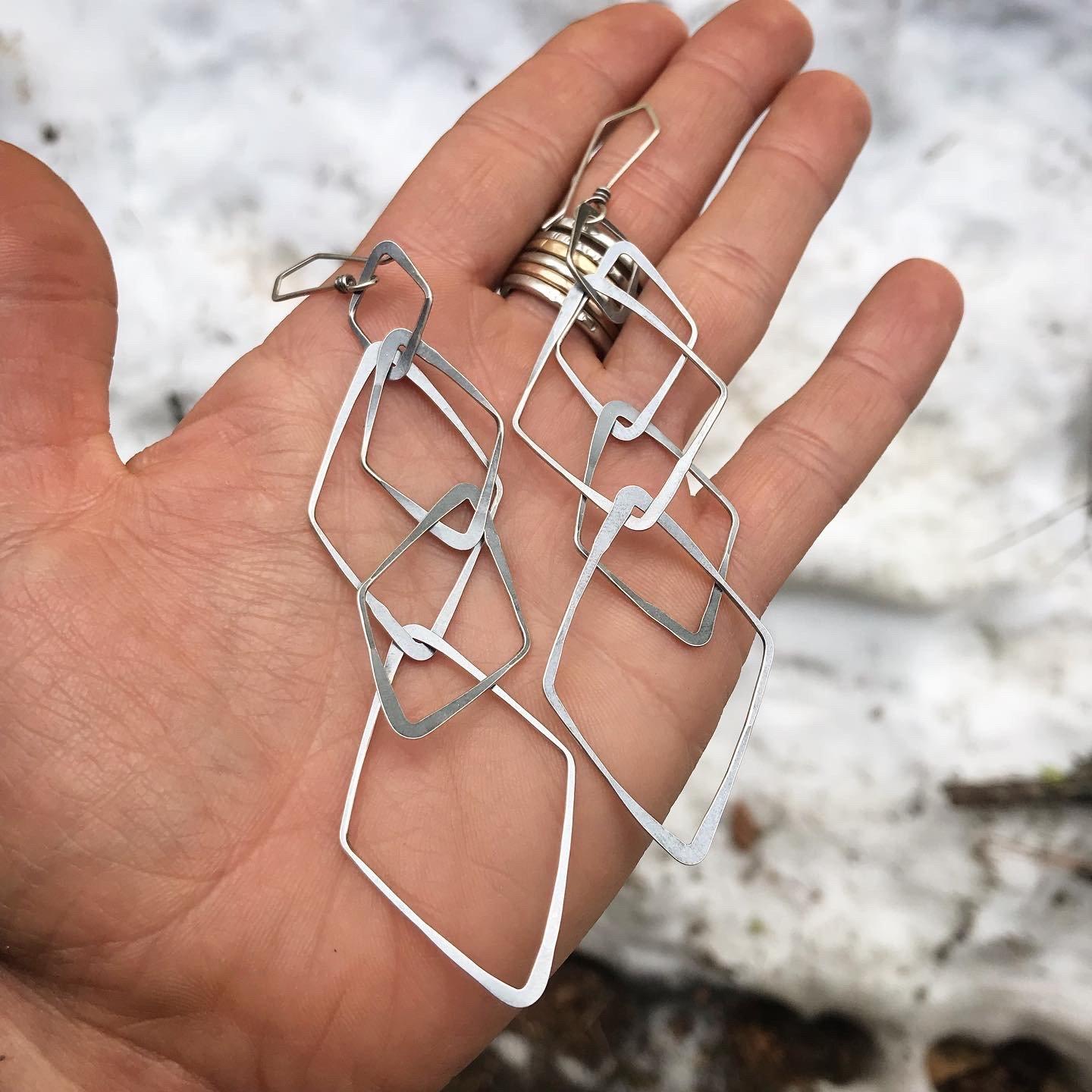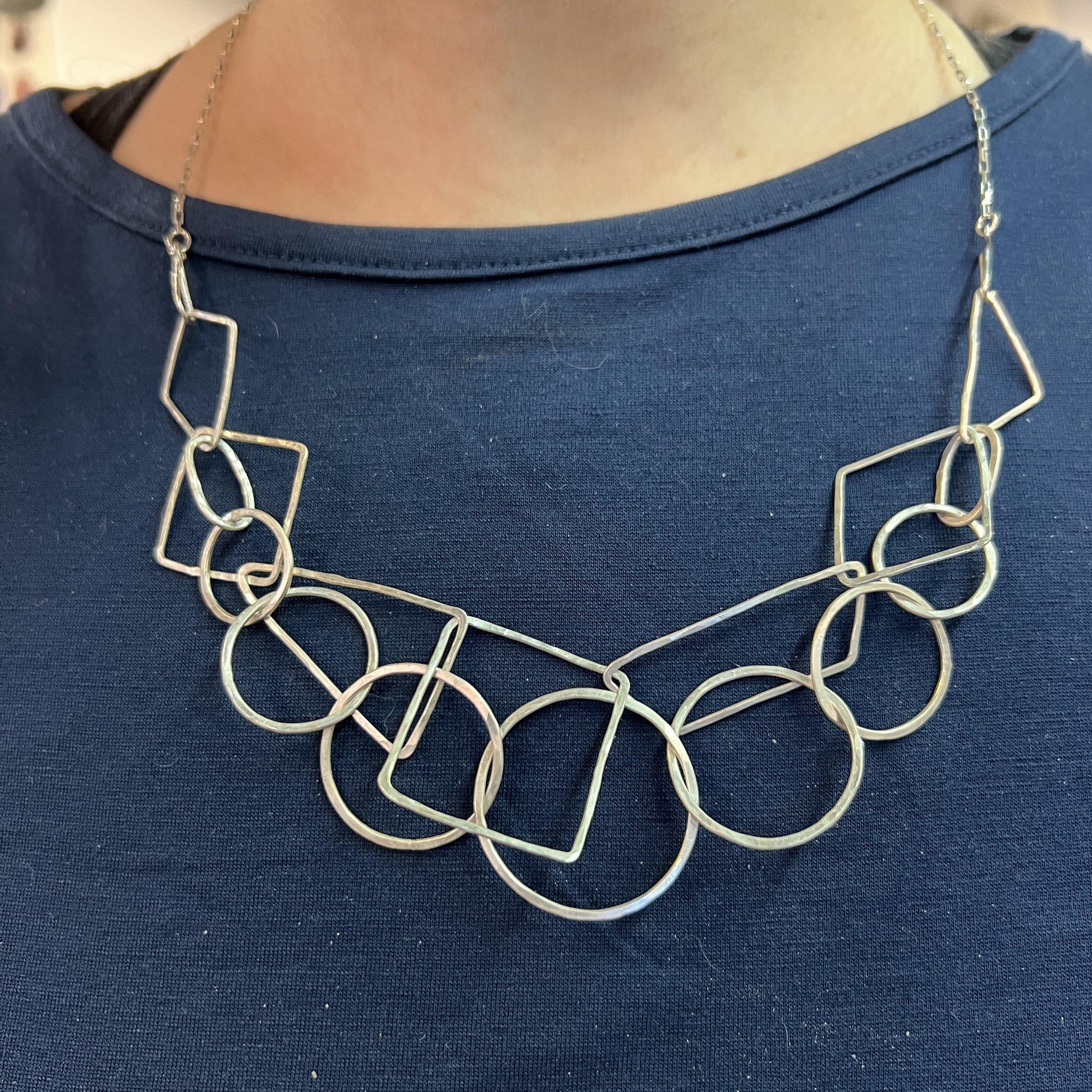In this class you will learn how to use the torch to solder links together, forming a handmade chain. You will be able to choose the size and shape of each link and how they are attached or layered together. This is a fun way to make large earrings that are light and airy. If you choose to make a necklace instead of earrings you will make one or two strands for the front, and the remainder of your length will be regular chain with a clasp. You will hammer texture into each link and then have the option to add a darkening patina.