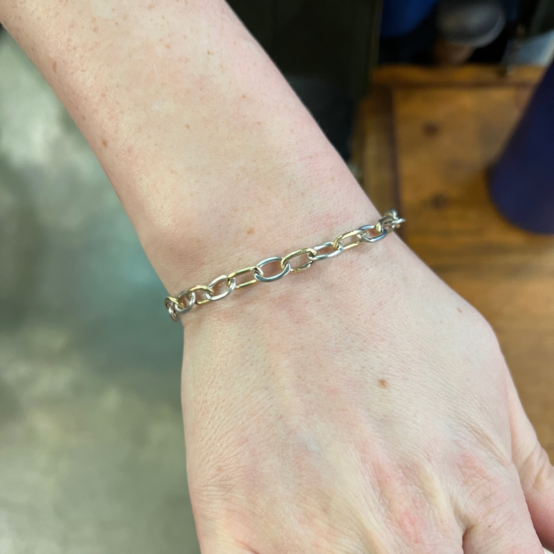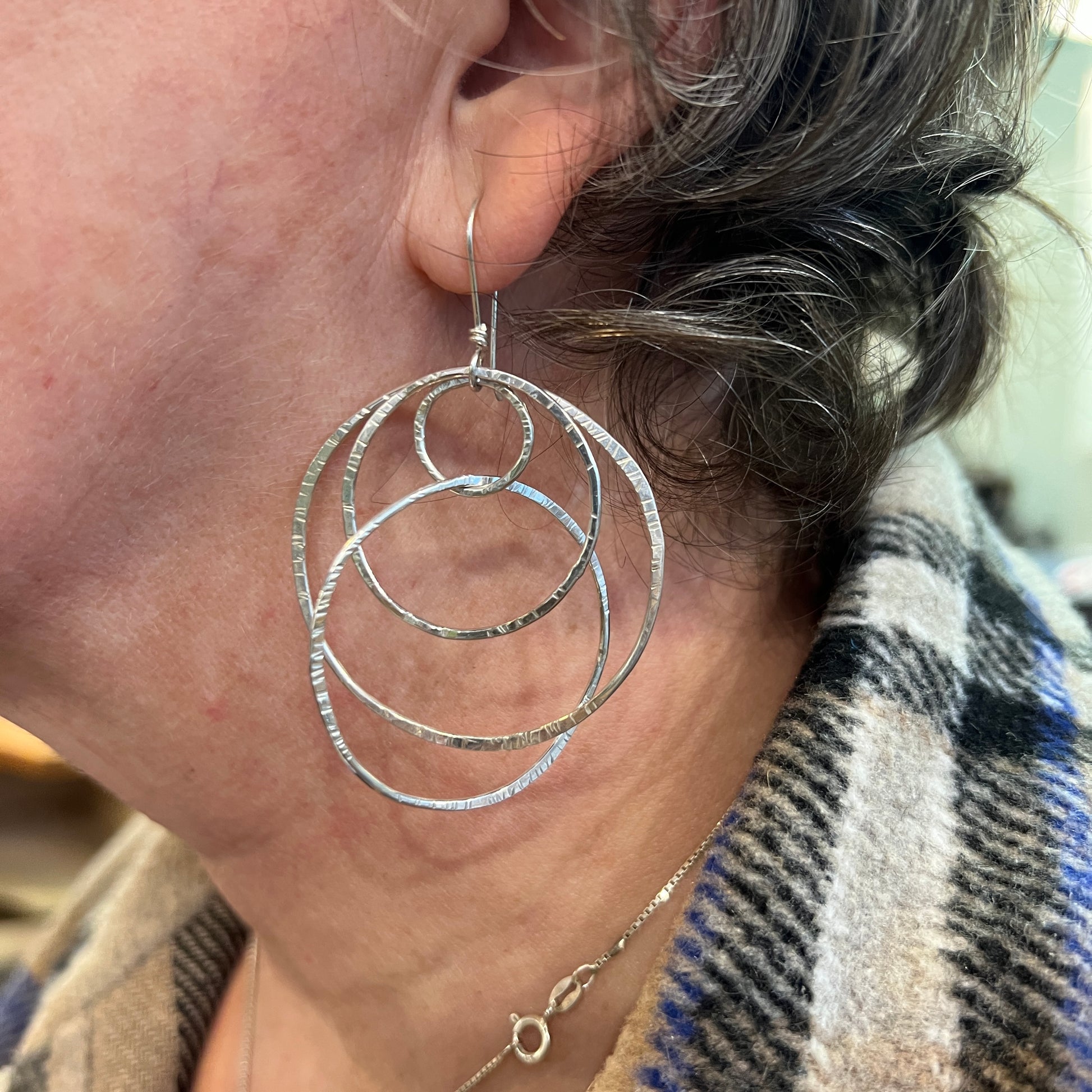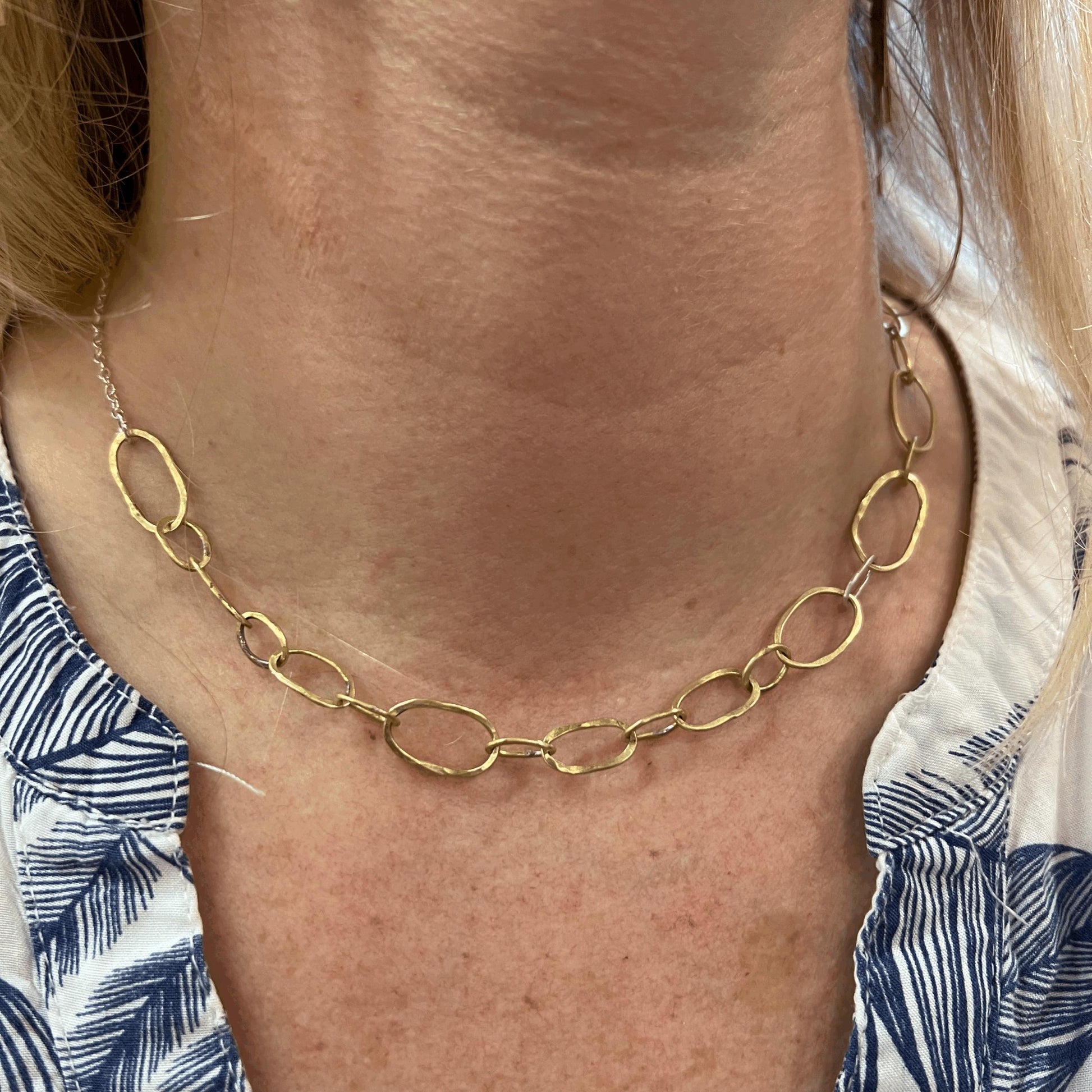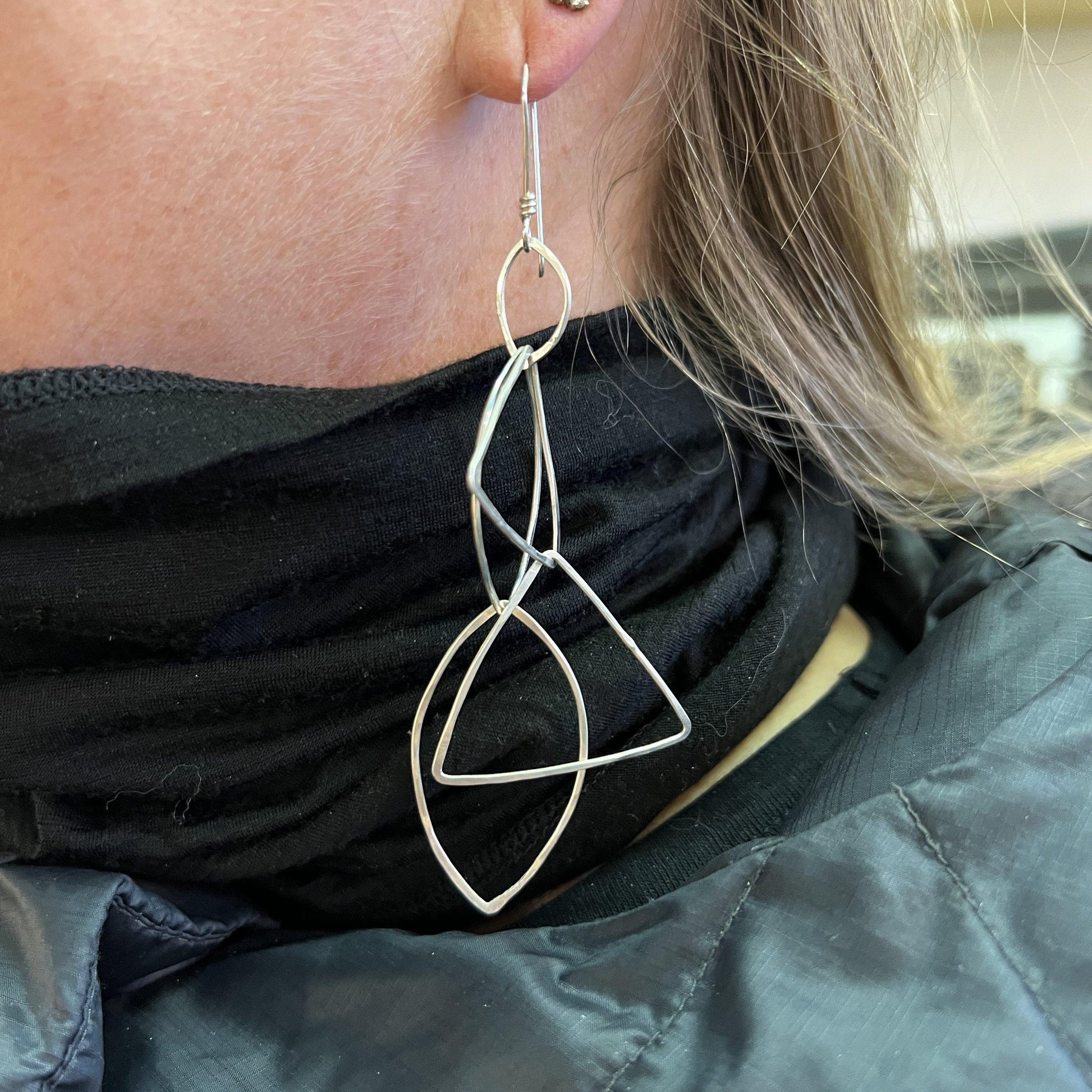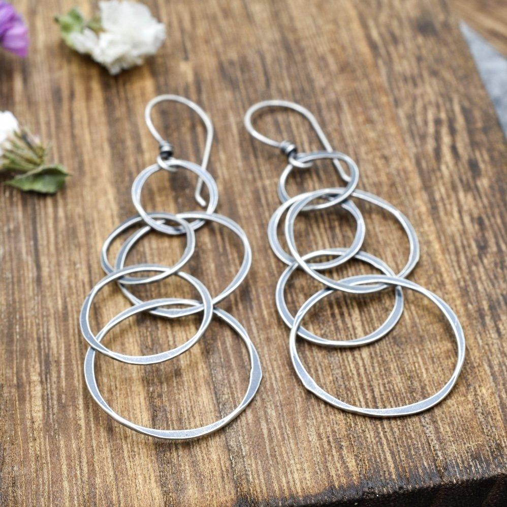 In this class you will learn how to use the torch to solder links together, forming a handmade chain. You will be able to choose the size and shape of each link and how they are attached or layered together. This is a fun way to make large earrings that are light and airy. If you choose to make a necklace instead of earrings you will make one or two strands for the front, and the remainder of your length will be regular chain with a clasp. You will hammer texture into each link and then have the option to add a darkening patina.